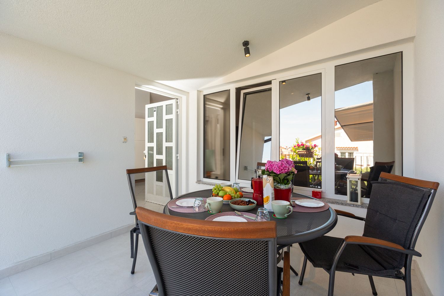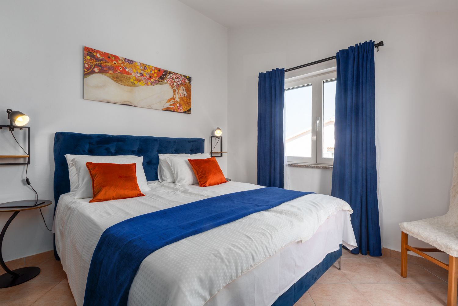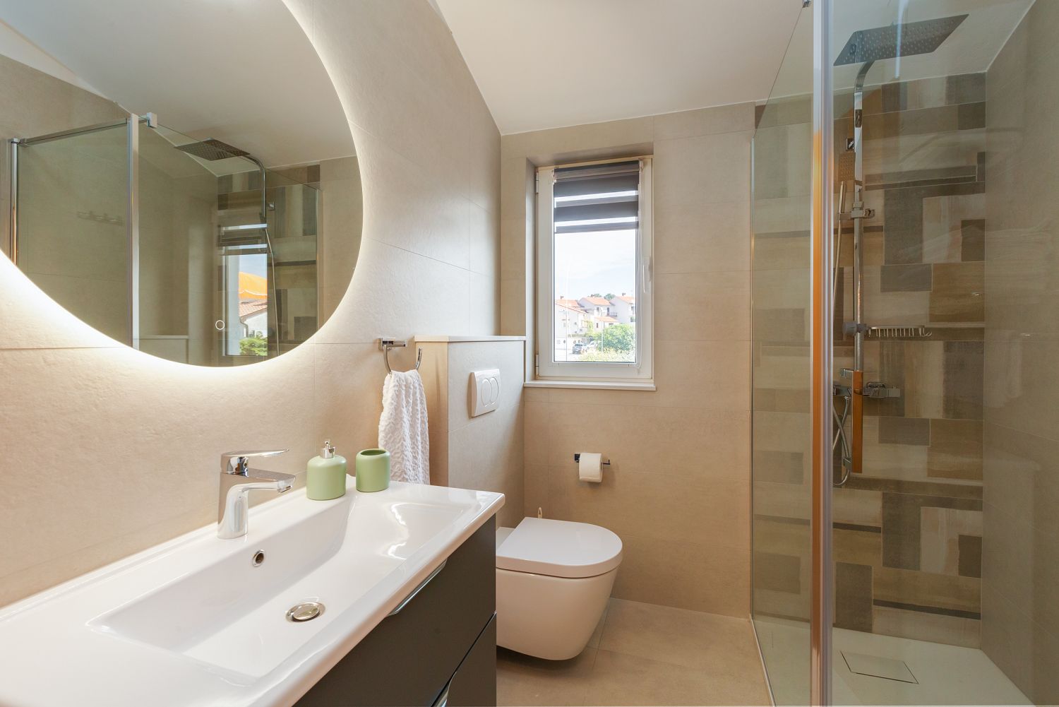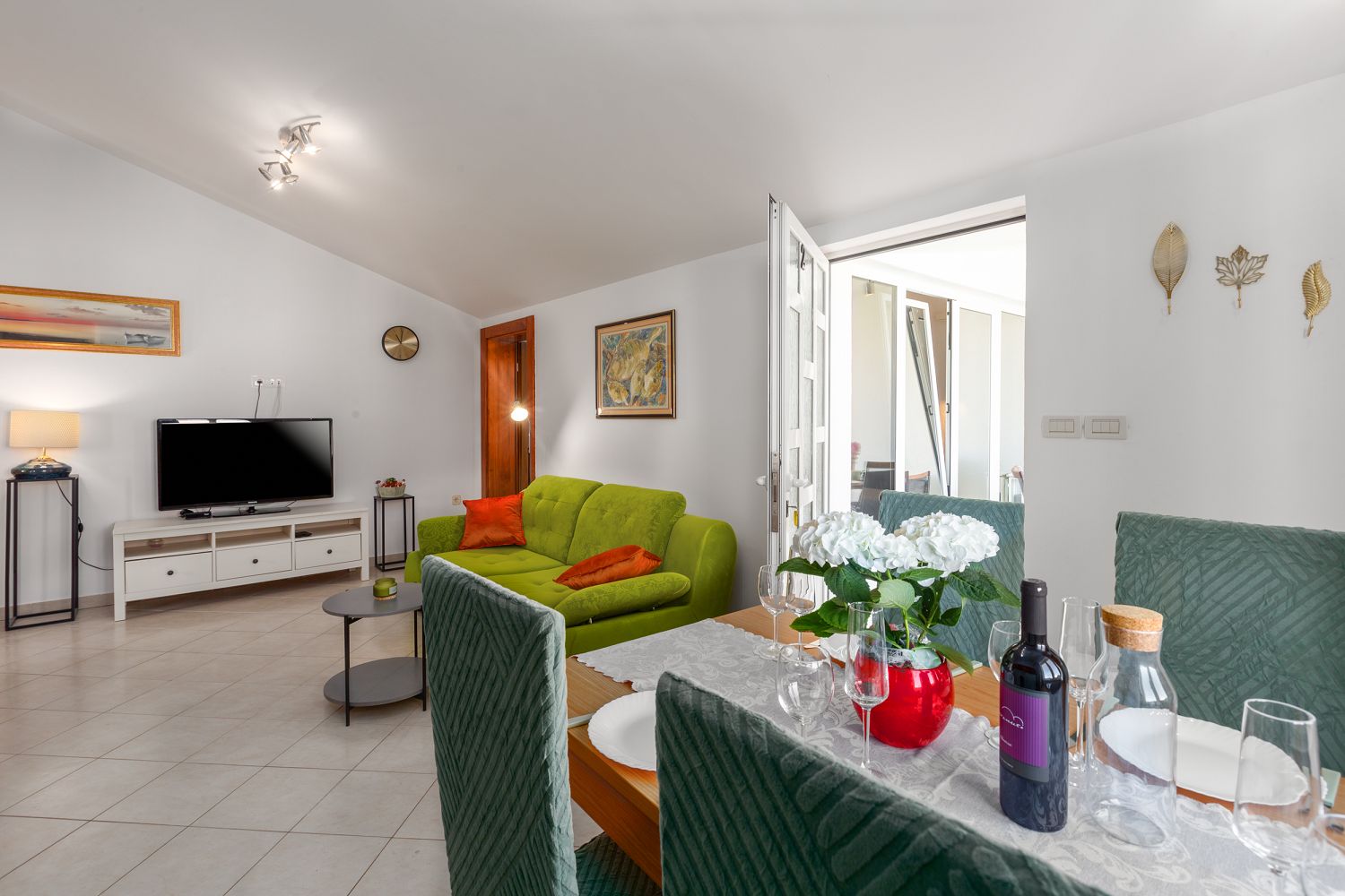 Die Ferienwohnungen befinden sich in einem ruhigen Ortsteil von Porec namens Novo Naselje, nur wenige Minuten zu Fuß durch den Pinienwald vom Strand Brulo entfernt. Einkaufsmöglichkeiten und Restaurants sind ebenfalls in der Nähe und zur Altstadt sind es ca. 700 m. Der Hausbesitzer wohnt im Haus, ein Parkplatz auf dem Grundstück steht zur Verfügung. Insgesamt werden drei Ferienwohnungen im Haus vermietet. Die Ferienwohnung befindet sich im ersten Stock des Hauses und ist mit modernen Möbeln ausgestattet. Die für zwei bis vier Personen geeignete Ferienwohnung hat eine Wohnfläche von 65 m² und besteht aus einer klimatisierten Wohnküche mit Couch und Essbereich, Dusche/WC, zwei Doppelbettschlafzimmern, eines davon mit Sat-TV und einem Balkon mit teilweise Meerblick. Beim Eingang steht eine schöne, überdachte Terrasse mit Sitzgarnitur zur Verfügung. Klimaanlage und WLAN sind vorhanden und im Preis inbegriffen.
