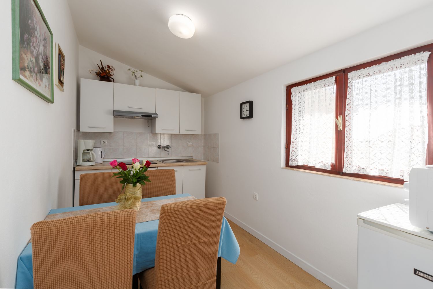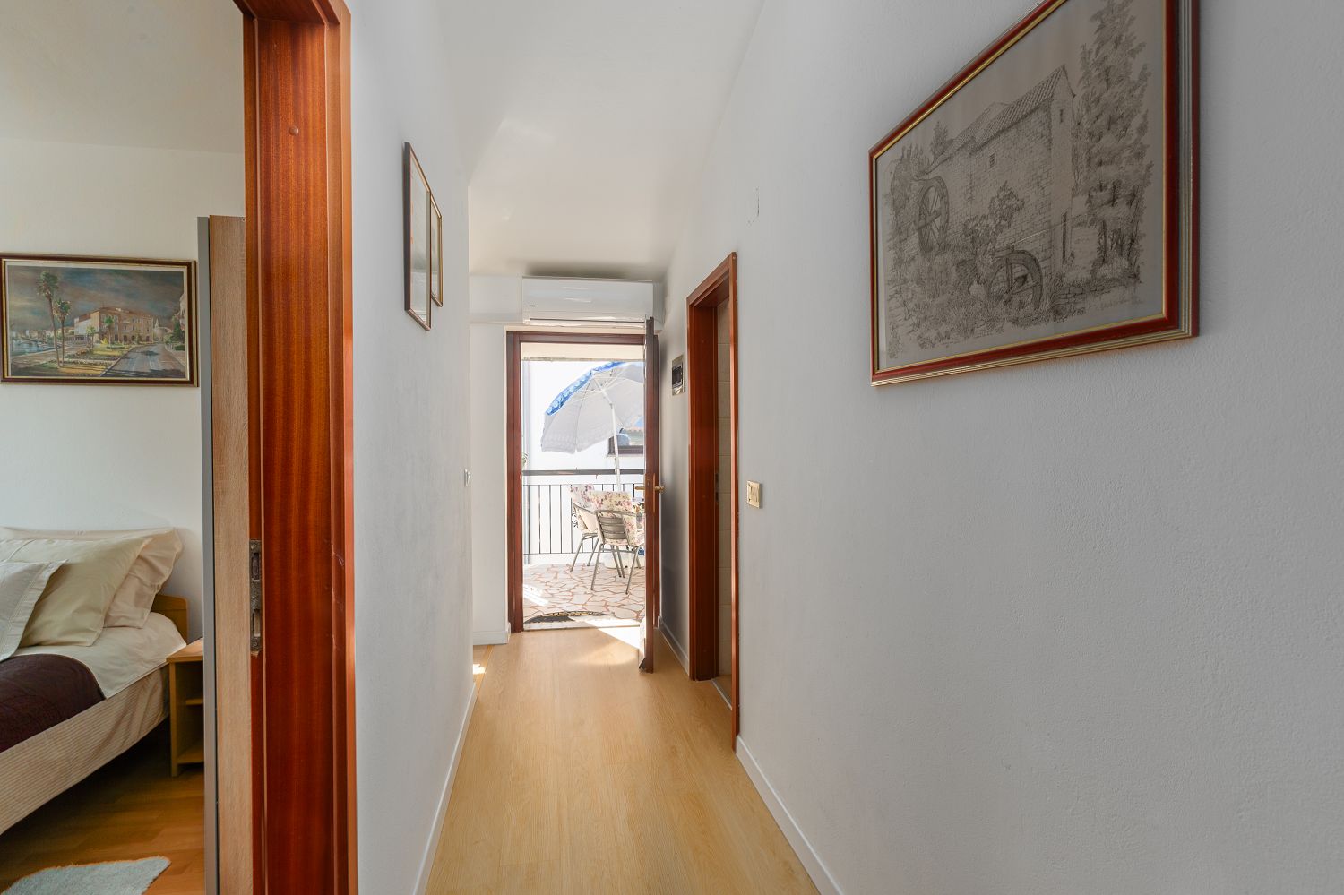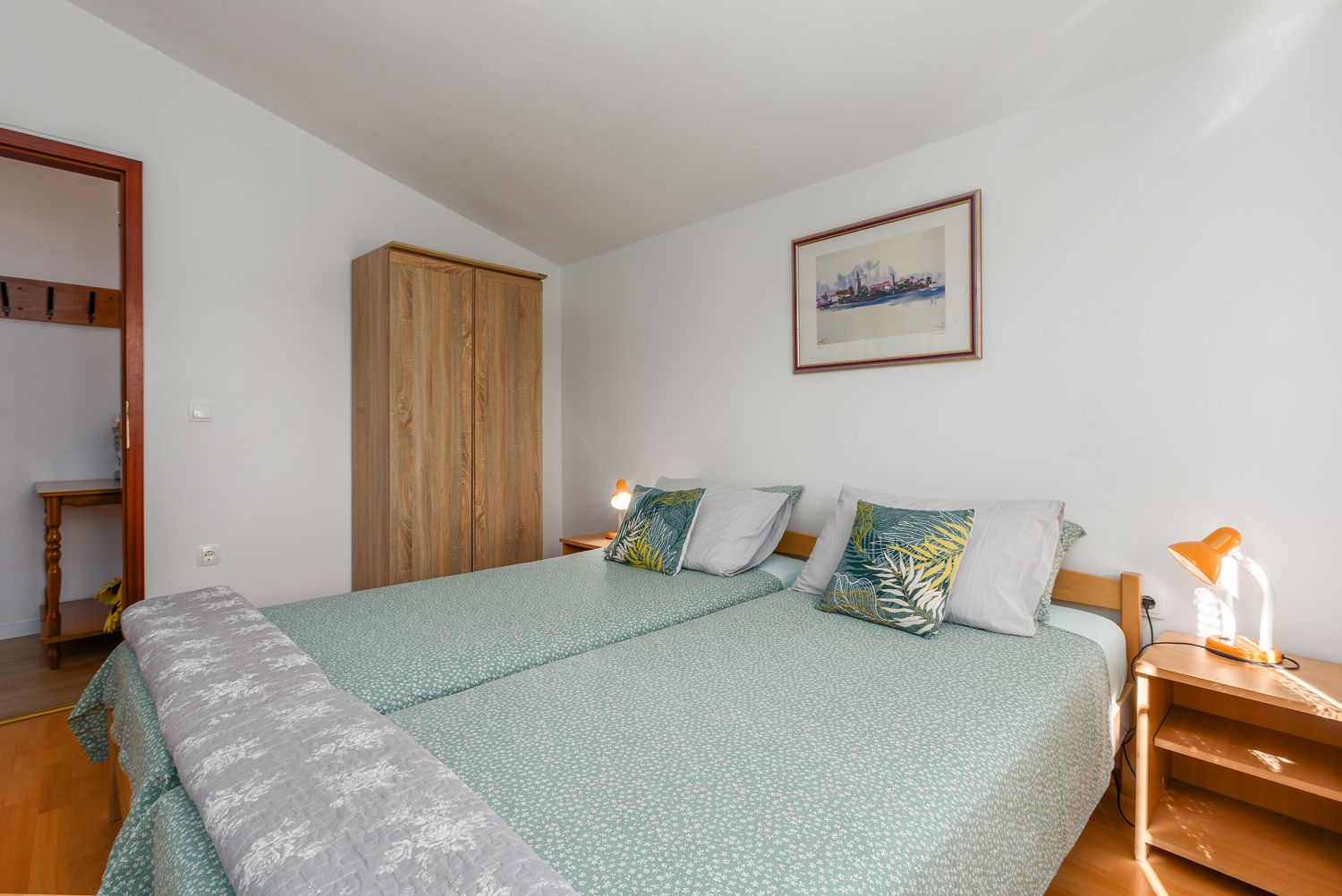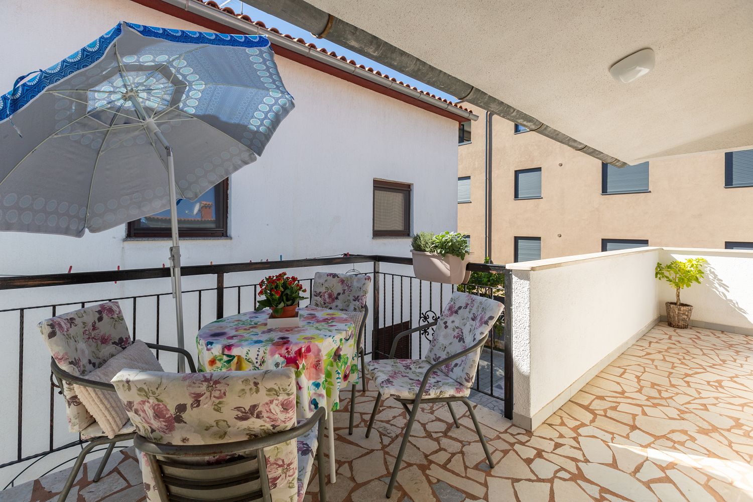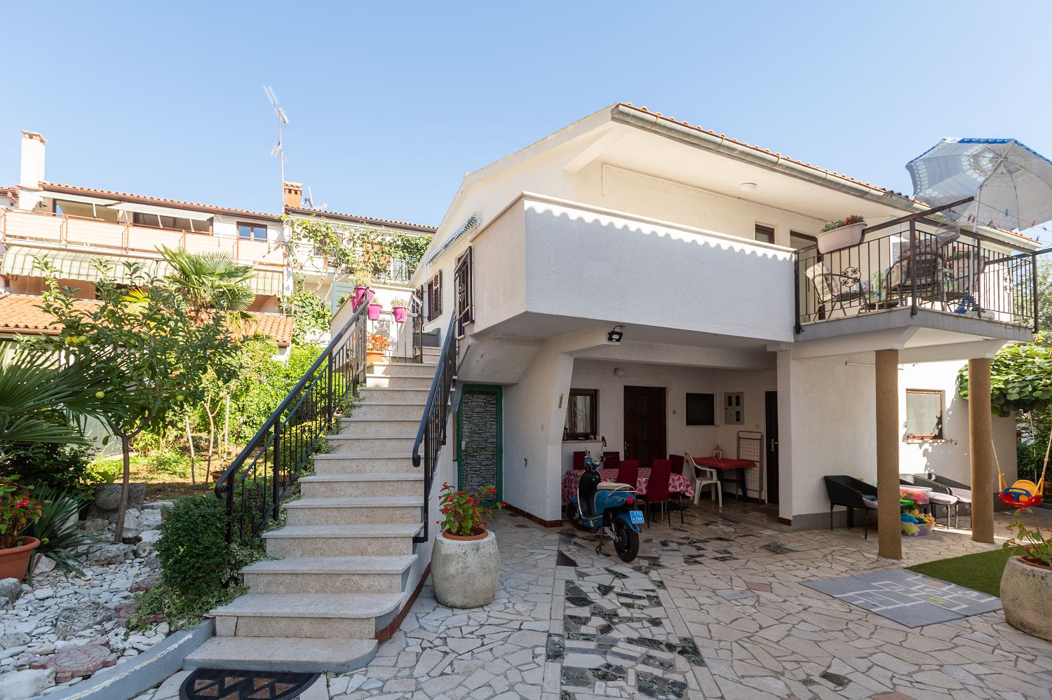 Die Ferienwohnungen befinden sich in einem ruhigen Viertel von Porec, nur wenige Minuten zu Fuß von der Altstadt entfernt und 600 Meter vom Strand Pical. Ein Restaurant und Einkaufsmöglichkeiten sind in wenigen Minuten erreichbar und nur 100 m entfernt. Das Haus liegt auf einem ca. 600 m² großen, umzäunten Grundstück mit Garten. Der Vermieter wohnt in einem anderen Objekt auf demselben Grundstück. Ein privater Parkplatz ist auf dem Grundstück vorhanden. Die 45 m² große Ferienwohnung für vier Personen liegt im ersten Stock des Hauses und verfügt über eine Essküche, zwei Schlafzimmer, ein Badezimmer mit Dusche und WC sowie eine schöne Terrasse mit Gartenmöbeln. Klimaanlage und WLAN sind vorhanden und im Preis inbegriffen.