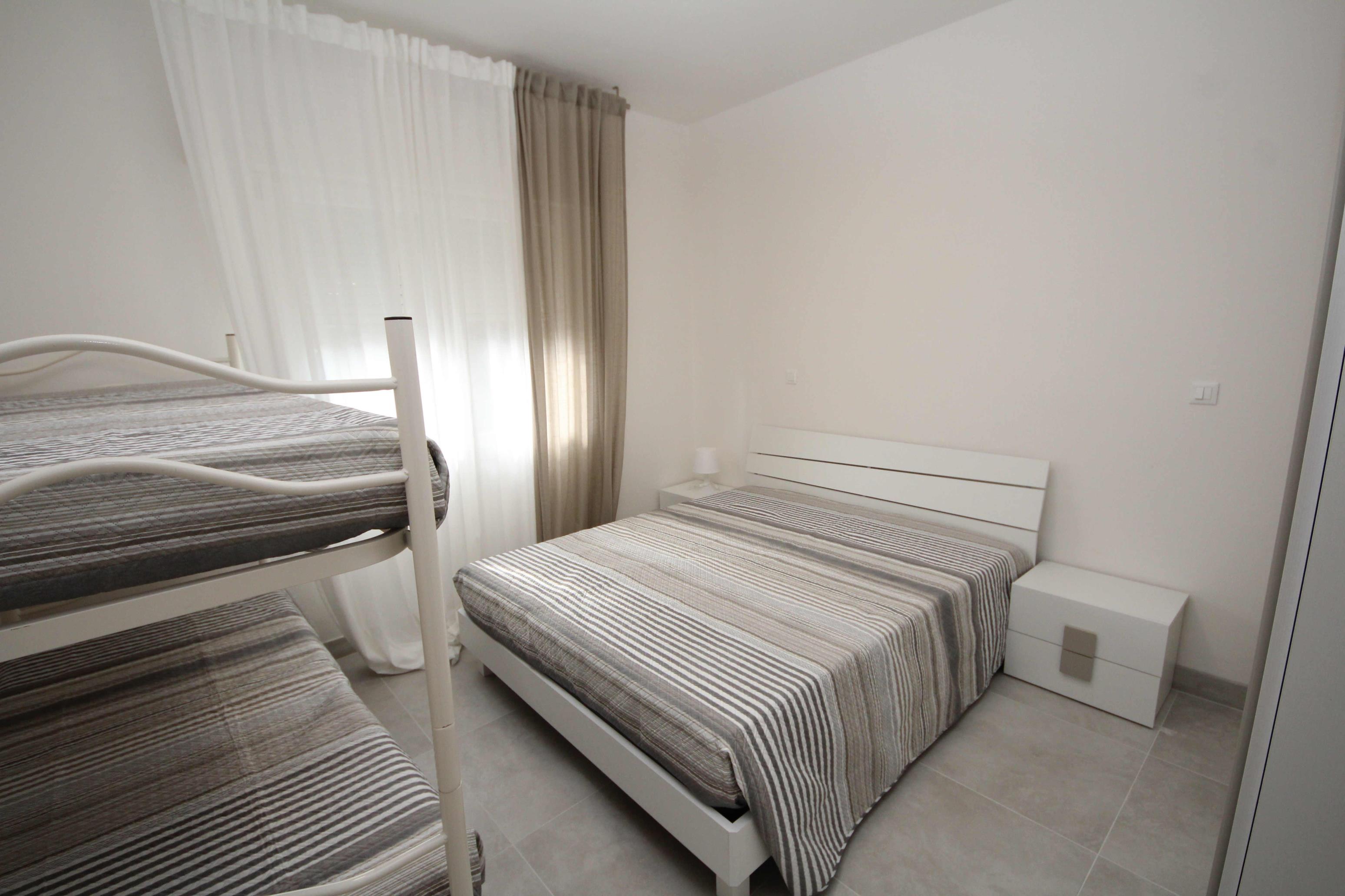Die neu renovierte Dreizimmer-Wohnung Trilo bietet Platz für max. 6 Personen. Die Wohnungen können sich je nach Verfügbarkeit im Erdgeschoss oder ersten Stock befinden. Die Unterkunft besteht aus zwei Schlafzimmern: eines mit Doppelbett und Etagenbett und das andere mit einem Doppelbett. Die gut ausgestattete Küche befindet sich im Wohnbereich und verfügt über einen Gasherd, Geschirr, Besteck, Töpfe, einen Kühlschrank mit Eisfach, Mikrowelle, Spülmaschine, Backofen und Waschmaschine. Ein SAT-TV und Klimaanlage sind ebenfalls vorhanden. Das Badezimmer ist mit einer Dusche, einem WC, Bidet und einem Waschbecken ausgestattet. Die Wohnungen verfügen über einen Balkon, der mit Tisch und Stühlen zum gemütlichen Entspannen einlädt. Zusätzlich steht Ihnen ein grosser Garten mit Gartenmöbeln zur Verfügung, ideal für gemeinsame Mahlzeiten im Freien oder zum Entspannen. Die Fahrzeit ab der italienischen Grenze beträgt ca. 3,5 Stunden. Hinweis: Wenn Sie mehr als eine Unterkunft benötigen, ist dies in der Regel möglich, da wir über mehrere Objekte des gleichen Haustyps verfügen.