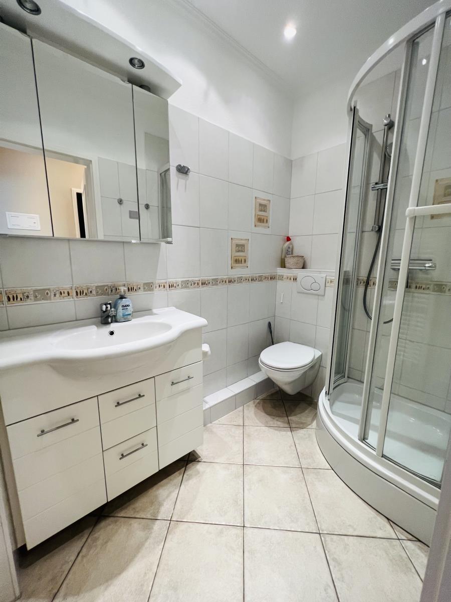 Das moderne Bad ist mit einer Dusche, WC, Waschbecken und Handtuchheizkörper ausgestattet.
