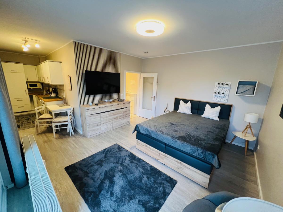 Die Wohnung hat einen kombinierten Wohn/-Schlafraum mit einem neuem Doppelbett für 2 Personen (Liegefäche 160x200cm), kleine Essecke mit Sitzmöglichkeit für 2 Personen, TV Flachbildschirm mit Waipu TV und Zugang zum Balkon.