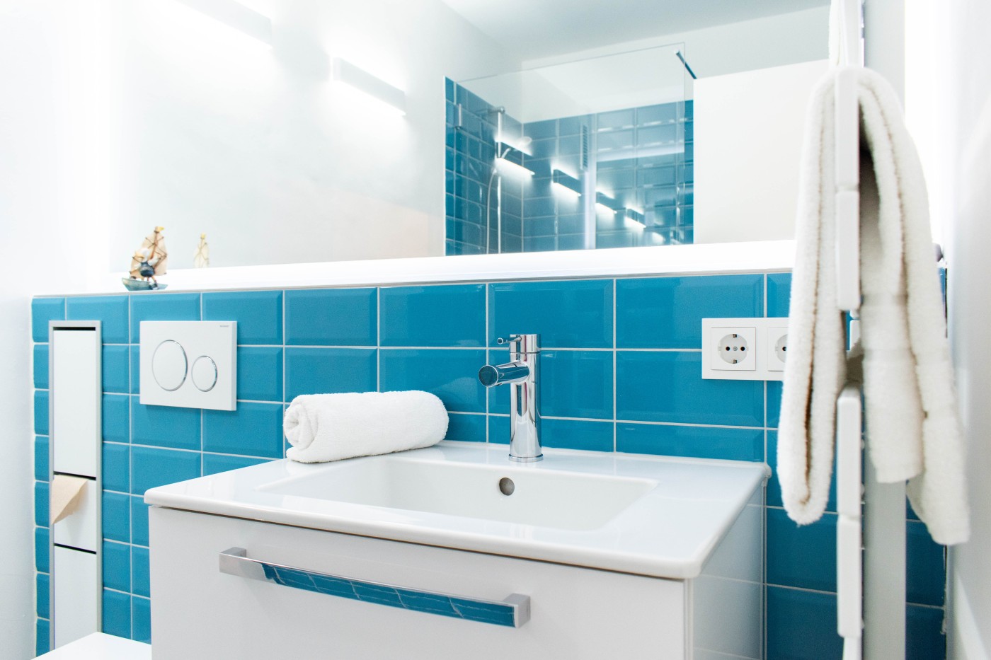 Die minimalistische Einrichtung ist modern und stilvoll. Die Kombination aus Weiß und Blautönen schafft ein maritimes und zeitloses Ambiente. Bei der Dekoration wurde der Fokus auf das Wesentliche gelegt, Schlichtheit und Funktionalität stehen im Vordergrund.