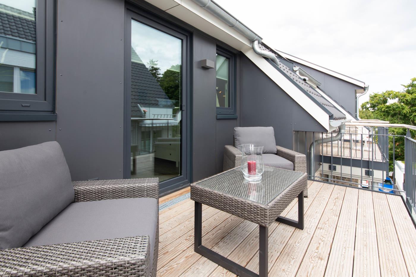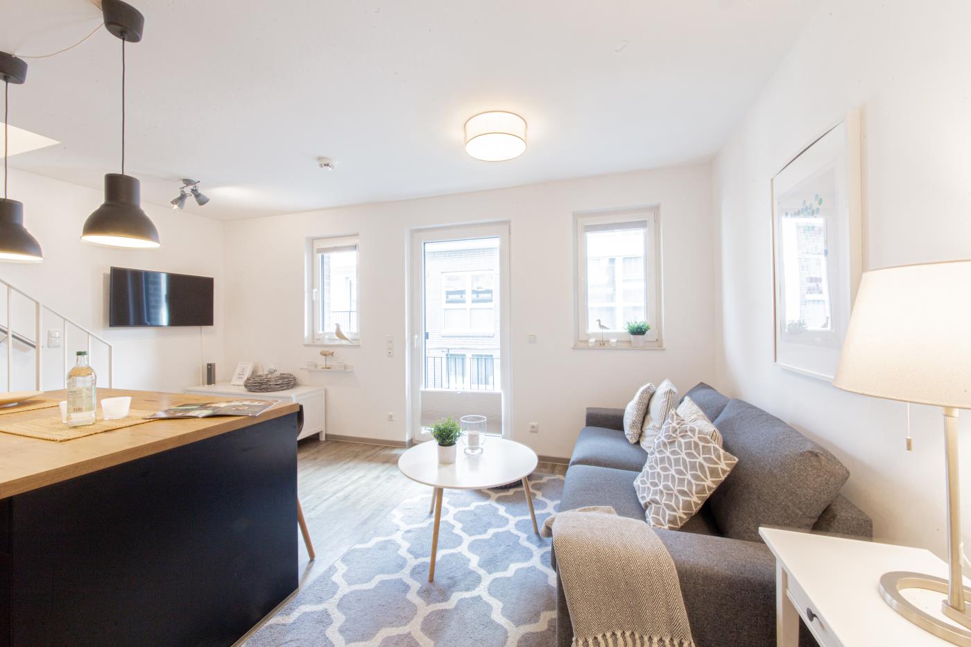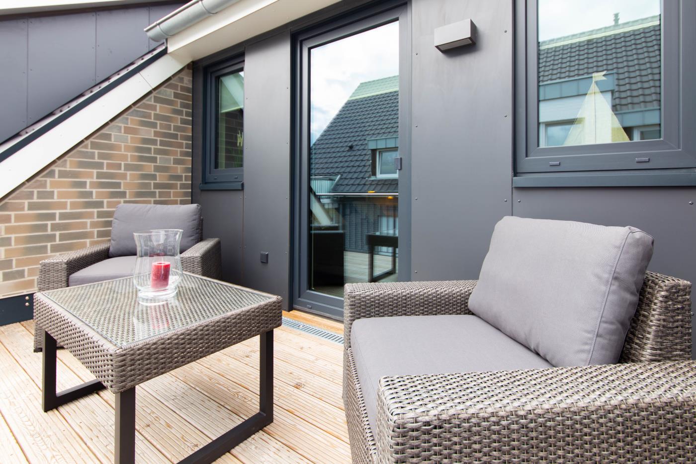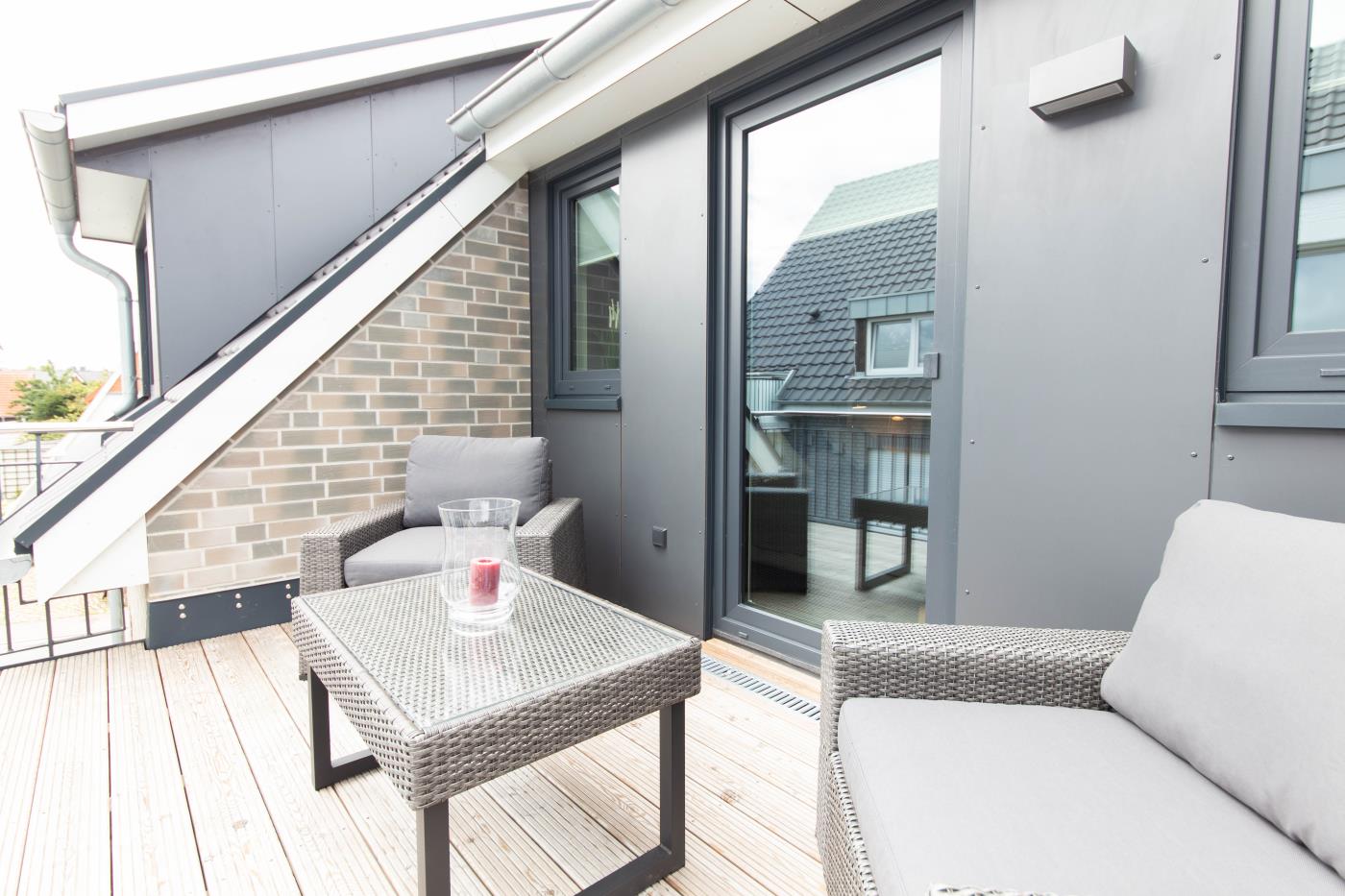 Wir empfehlen in der Ferienwohnung Bude 37 Whg 7 eine Belegung von zwei Erwachsenen und zwei Kindern oder maximal drei Erwachsene. Die modern ausgestattete Zweizimmerwohnung verfügt auf der ersten Ebene über einen Wohn- und Küchenbereich sowie einen Balkon mit Sonnenschirm, welcher zum gemeinsamen Frühstück und zum entspannen einlädt. Die Küche ist voll ausgestattet und lässt keine Wünsche offen. Sie ist großzügig geschnitten und verlockt zu ausgiebigen Kochexperimenten. Die Kücheninsel stellt den Mittelpunkt des Wohnraumes dar und bietet mit stylischen Barhockern Platz für vier Gäste. Das neue bequeme Schlafsofa (1,40er Breite) lädt zum gemütlichen Filmabenden ein. Das Schlafzimmer mit dem bequemen Doppelbett (1,80er Breite) sowie das Duschbad finden Sie auf der zweiten Ebene. Von hier aus gelangen Sie auf die südlich ausgerichtete Dachterrasse, auf welcher sich schöne Sommerabende in gemütlichen Loungemöbeln verbringen lassen. Ein Flat-TV und der offene Kleiderschrank runden das Angebot des stilvollen Raumes ab. Plissees zur Verdunklung sorgen für einen angenehmen Schlafkomfort. Das moderne Badezimmer verfügt über eine Dusche, ein WC sowie eine Waschmaschine. Ebenso bietet eine Fußbodenheizung dem Gast eine tolle Wohlfühlatmosphäre.