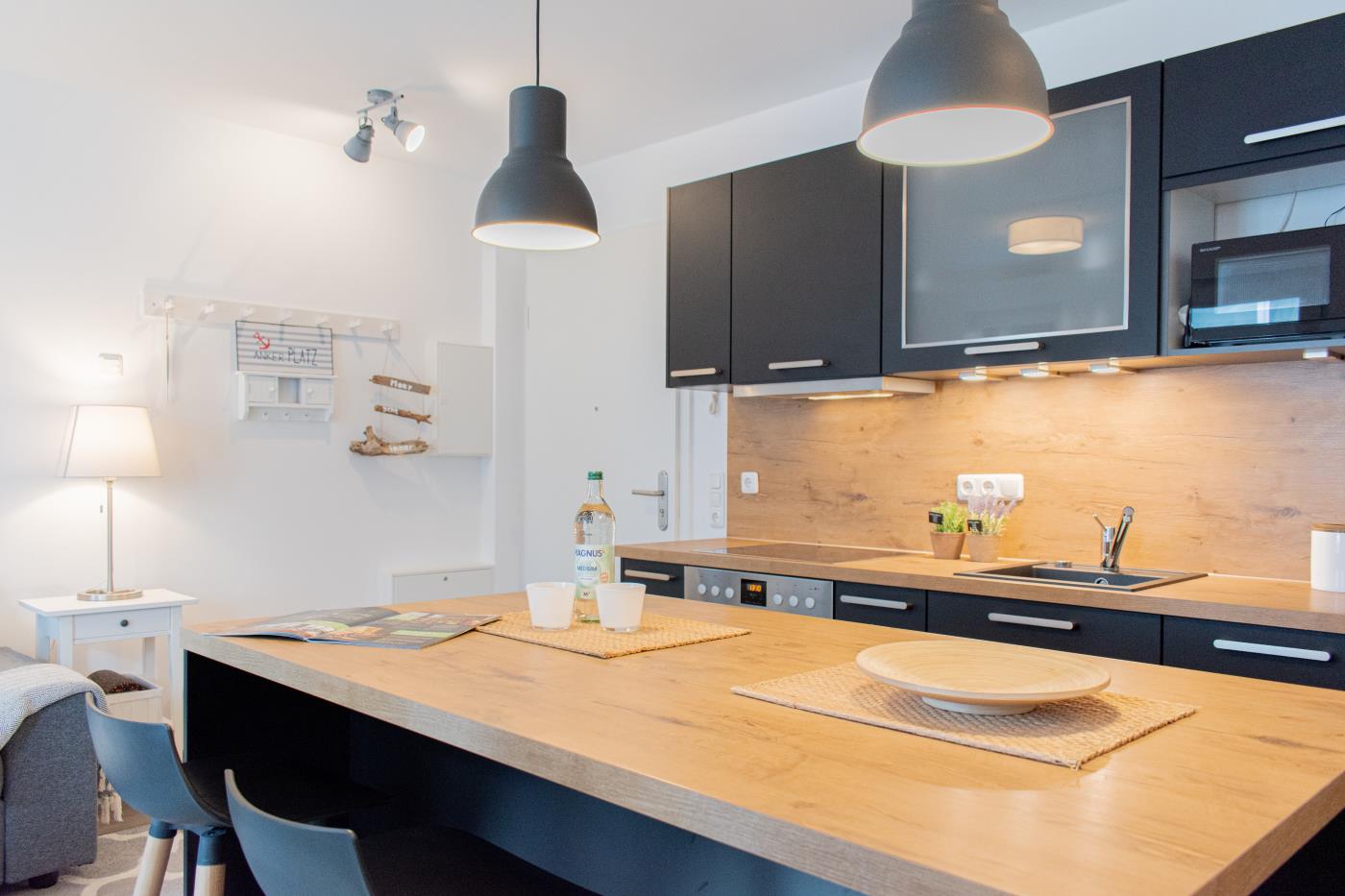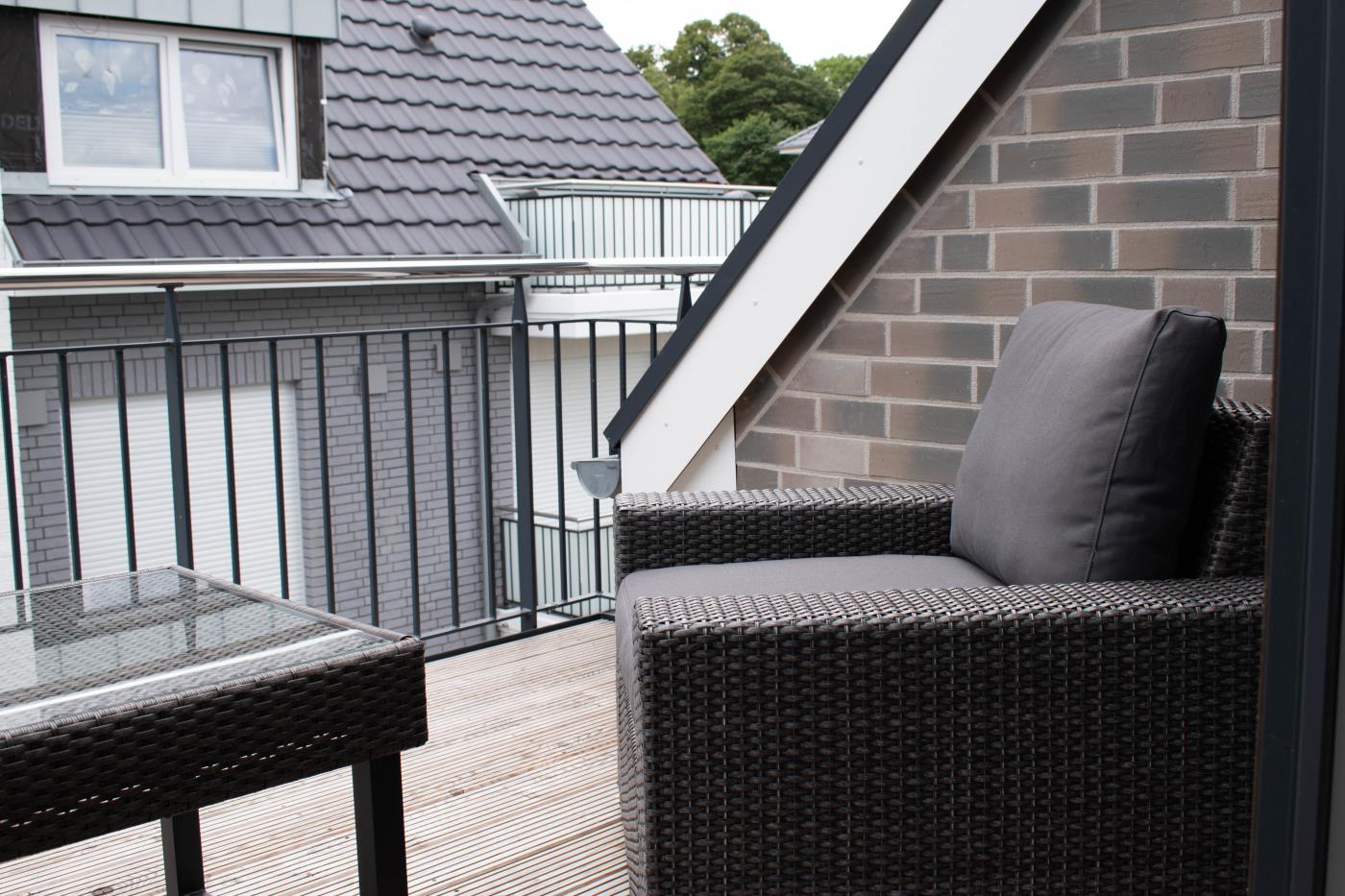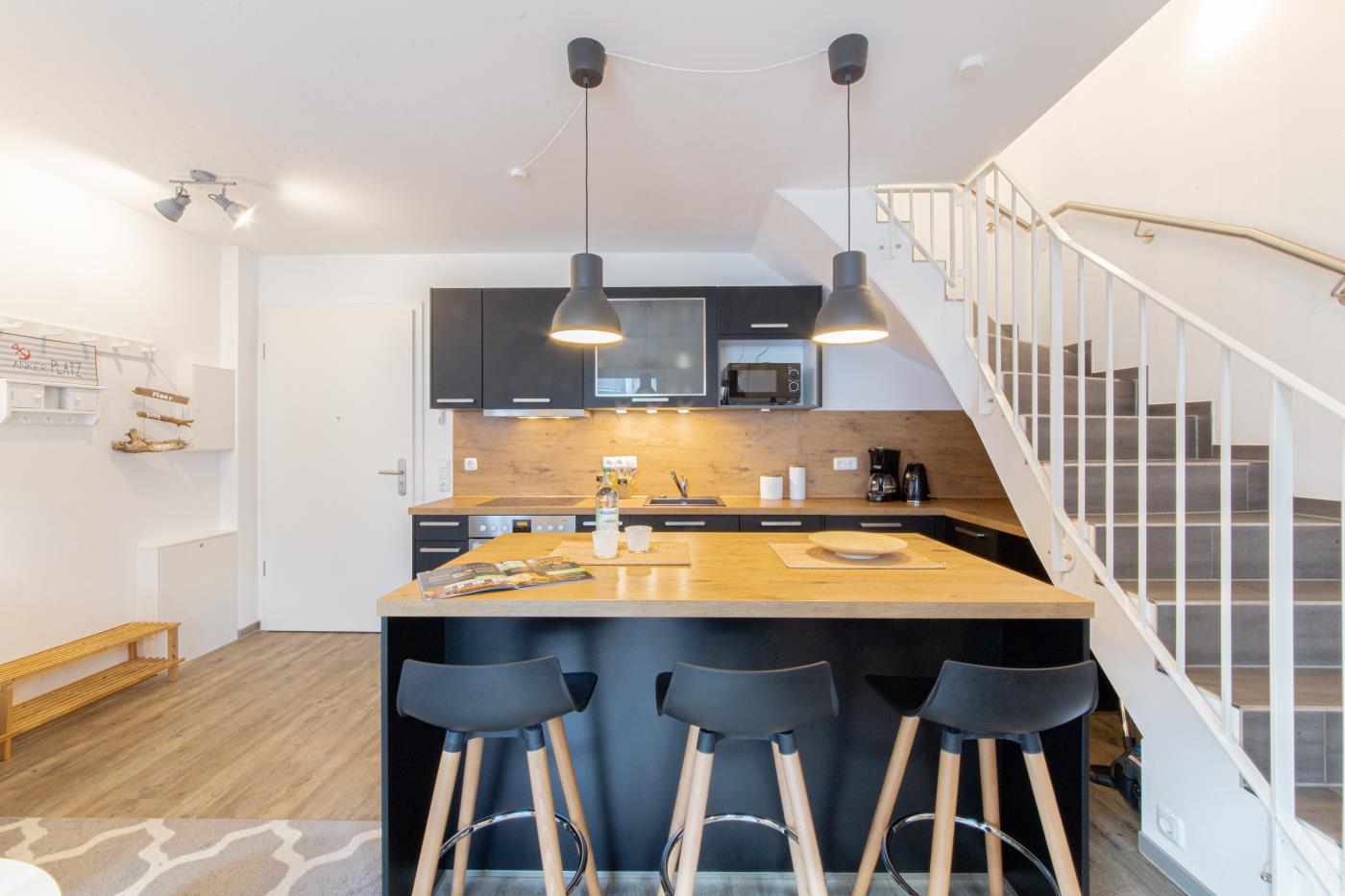 Wir empfehlen in der Ferienwohnung Bude 37 Whg 7 eine Belegung von zwei Erwachsenen und zwei Kindern oder maximal drei Erwachsene. Die modern ausgestattete Zweizimmerwohnung verfügt auf der ersten Ebene über einen Wohn- und Küchenbereich sowie einen Balkon mit Sonnenschirm, welcher zum gemeinsamen Frühstück und zum entspannen einlädt. Die Küche ist voll ausgestattet und lässt keine Wünsche offen. Sie ist großzügig geschnitten und verlockt zu ausgiebigen Kochexperimenten. Die Kücheninsel stellt den Mittelpunkt des Wohnraumes dar und bietet mit stylischen Barhockern Platz für vier Gäste. Das neue bequeme Schlafsofa (1,40er Breite) lädt zum gemütlichen Filmabenden ein. Das Schlafzimmer mit dem bequemen Doppelbett (1,80er Breite) sowie das Duschbad finden Sie auf der zweiten Ebene. Von hier aus gelangen Sie auf die südlich ausgerichtete Dachterrasse, auf welcher sich schöne Sommerabende in gemütlichen Loungemöbeln verbringen lassen. Ein Flat-TV und der offene Kleiderschrank runden das Angebot des stilvollen Raumes ab. Plissees zur Verdunklung sorgen für einen angenehmen Schlafkomfort. Das moderne Badezimmer verfügt über eine Dusche, ein WC sowie eine Waschmaschine. Ebenso bietet eine Fußbodenheizung dem Gast eine tolle Wohlfühlatmosphäre.