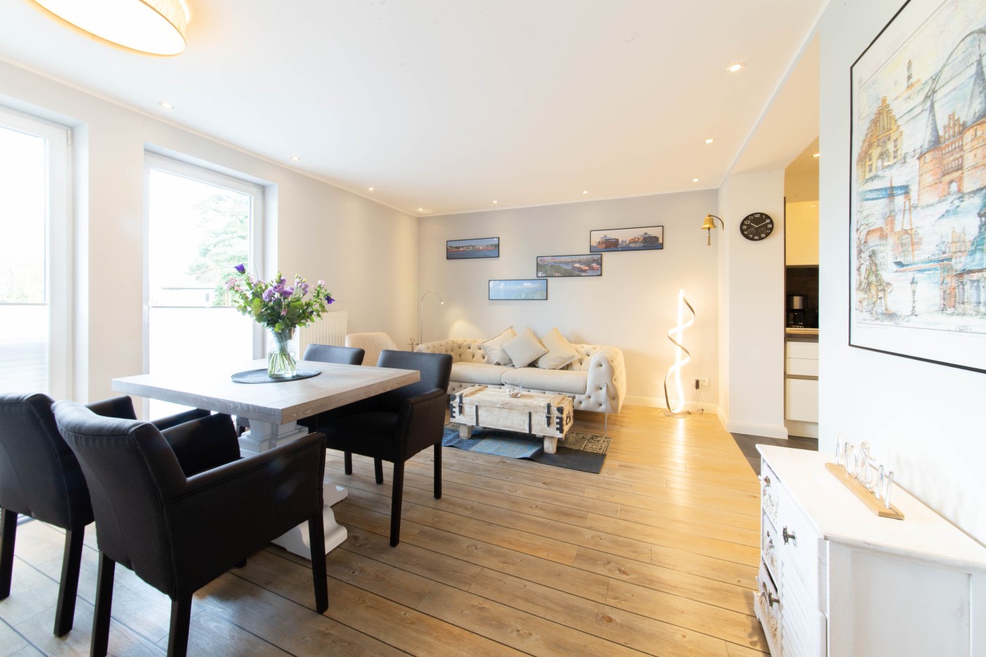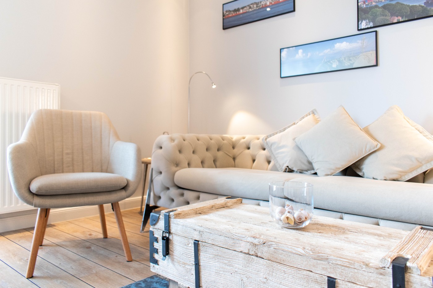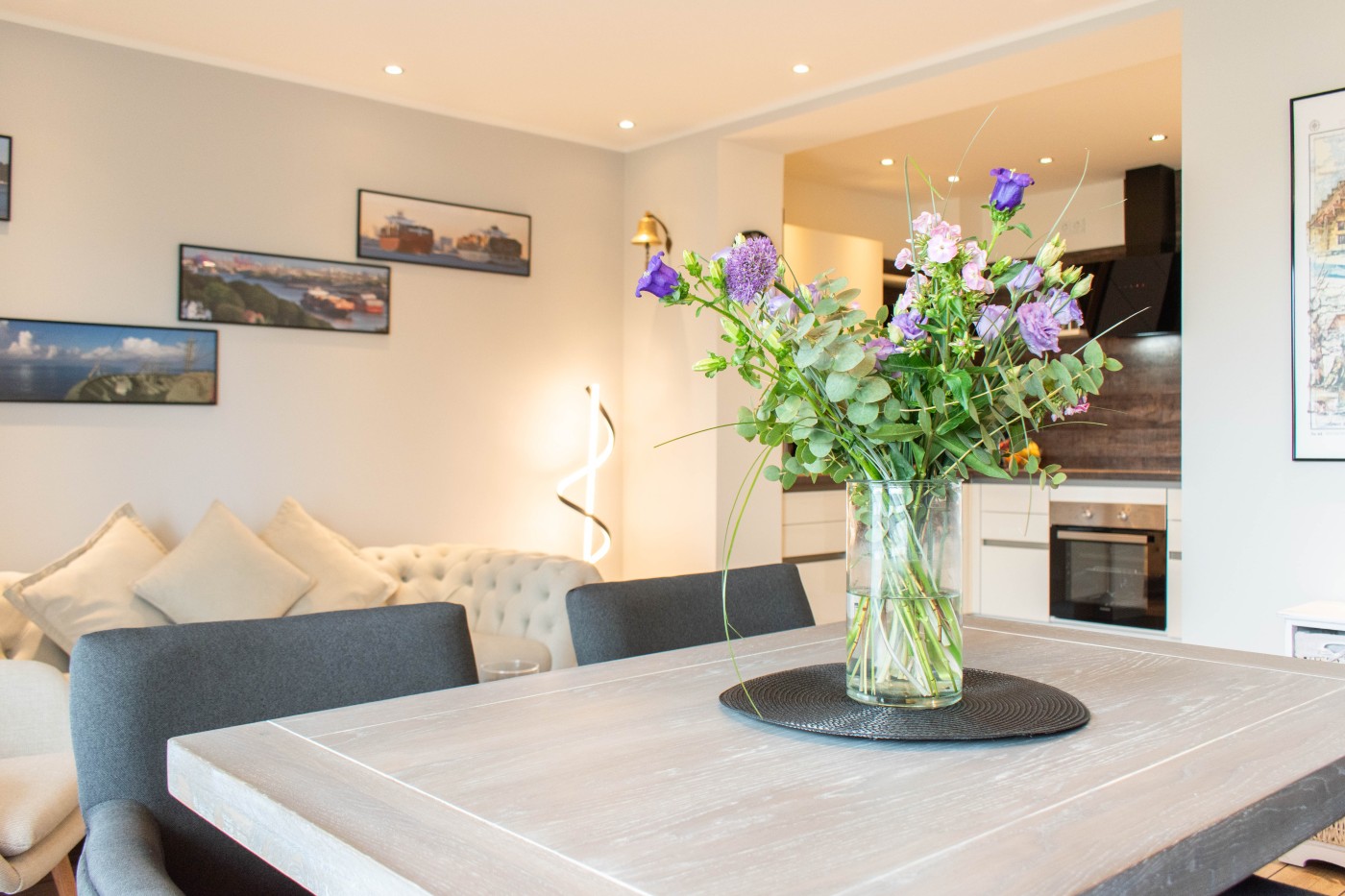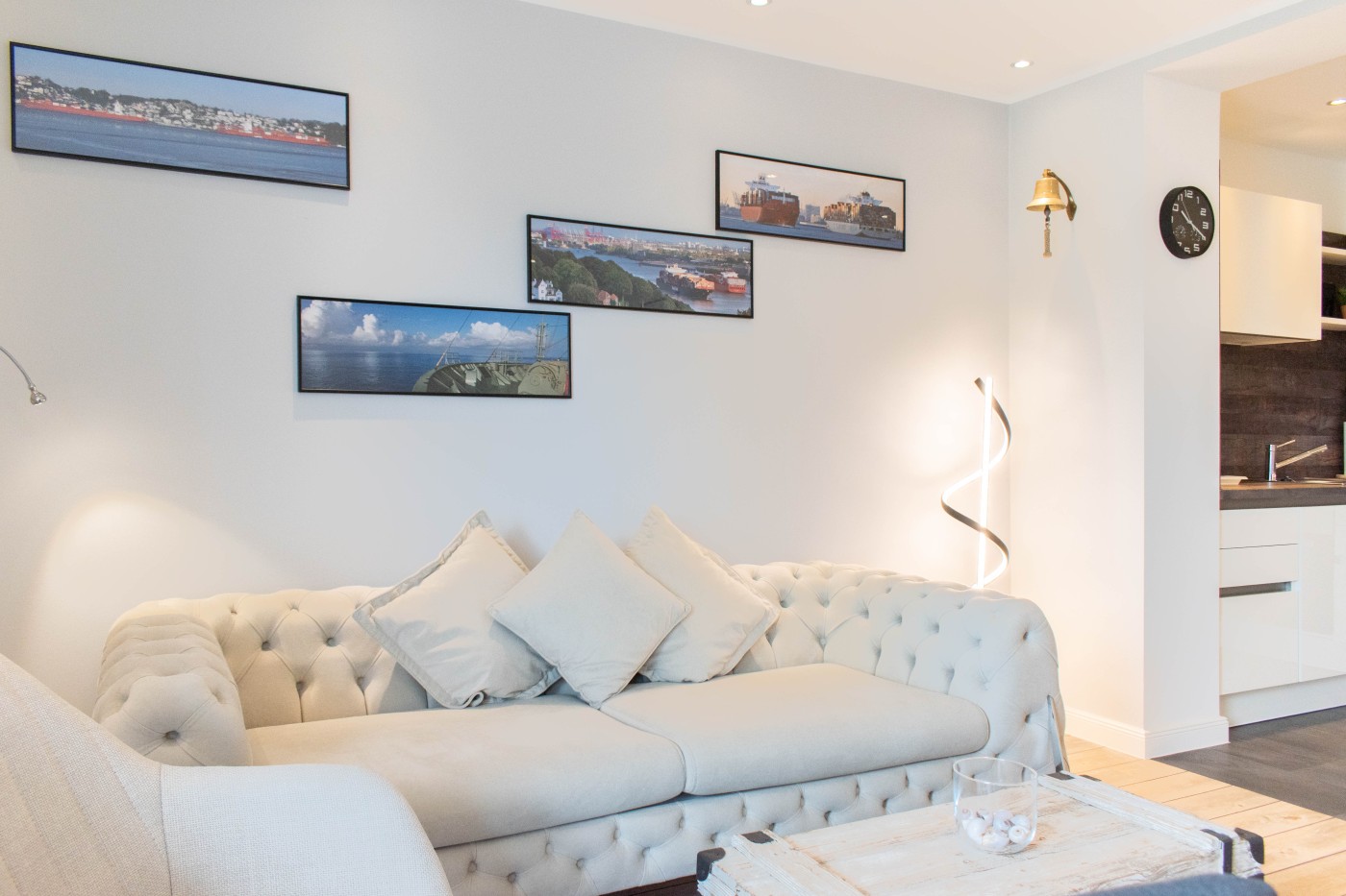 Die Ferienwohnung besticht auf 55 m² durch helles Interieur, warme Holztöne und harmonische Farbakzente. In den maritimen Dekoelementen und den Wandbildern finden sich die Nähe zum Meer und die Begeisterung für die Schifffahrt wieder, einfach echt nordisch.