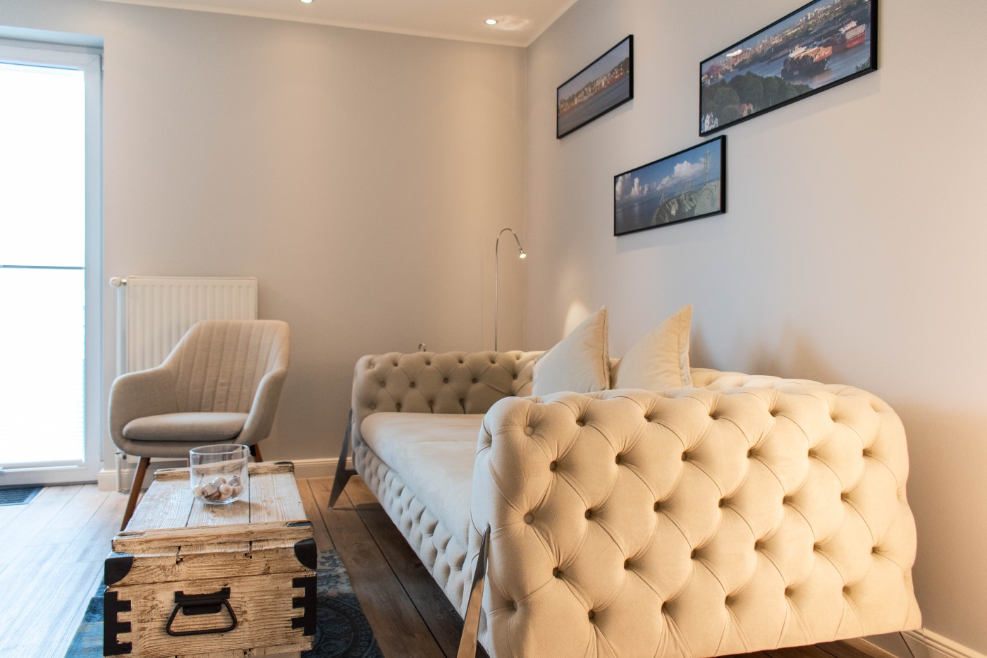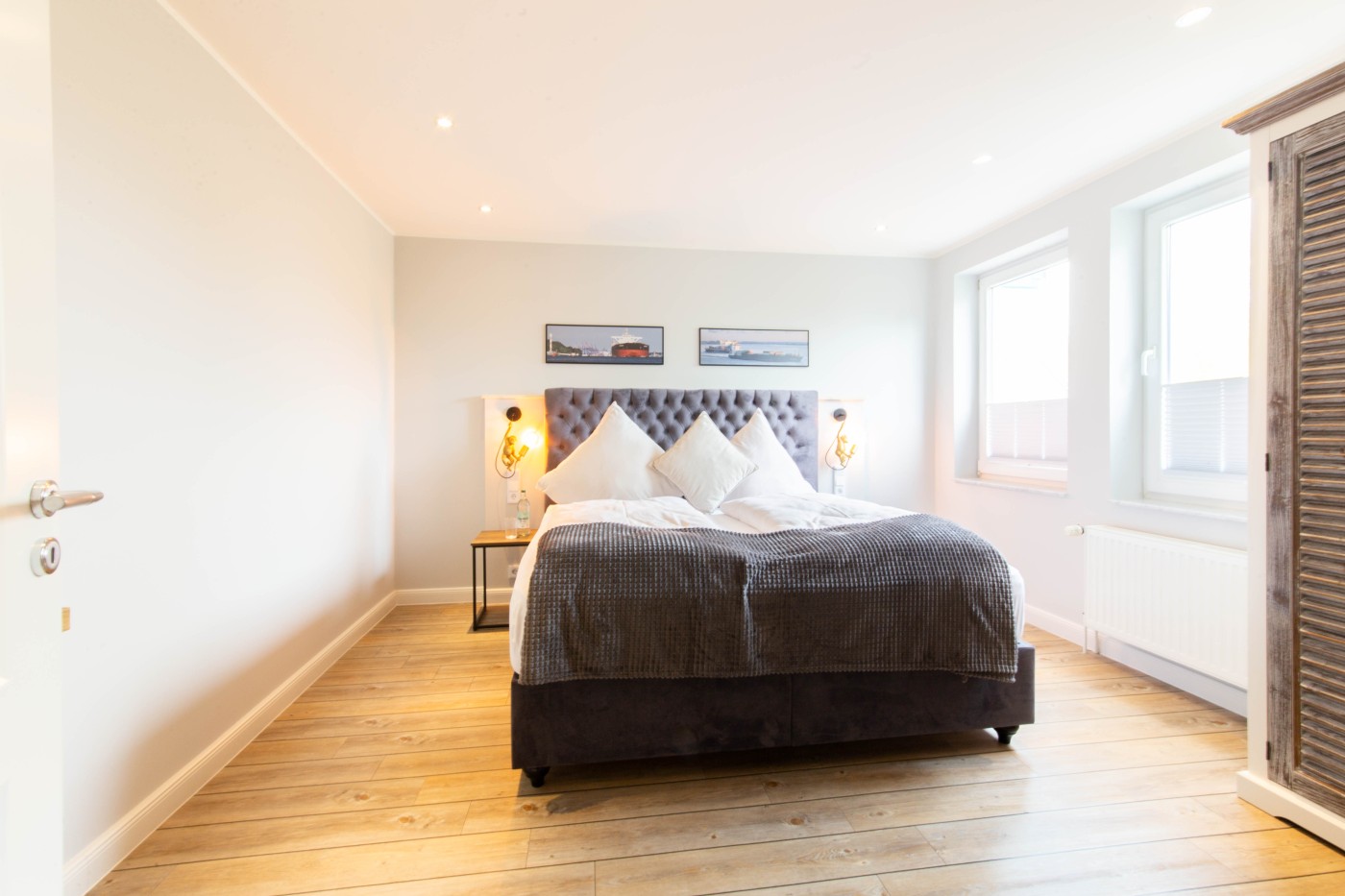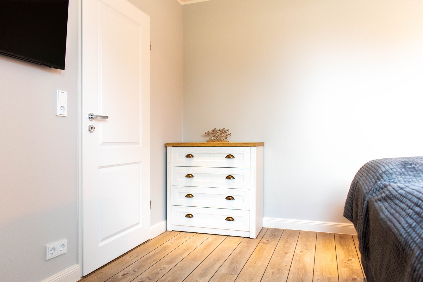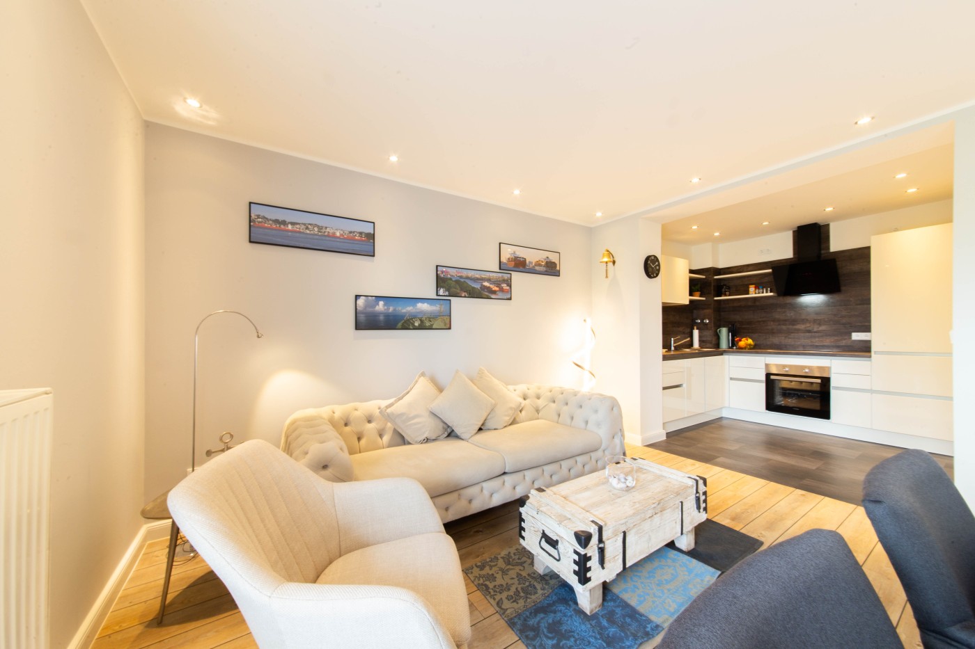 Die Ferienwohnung besticht auf 55 m² durch helles Interieur, warme Holztöne und harmonische Farbakzente. In den maritimen Dekoelementen und den Wandbildern finden sich die Nähe zum Meer und die Begeisterung für die Schifffahrt wieder, einfach echt nordisch.