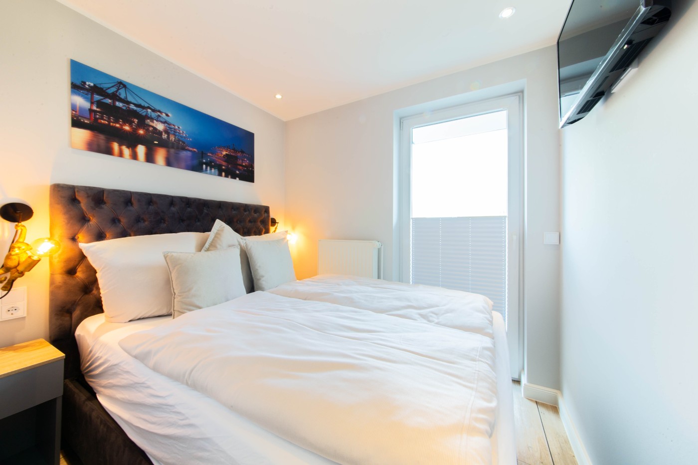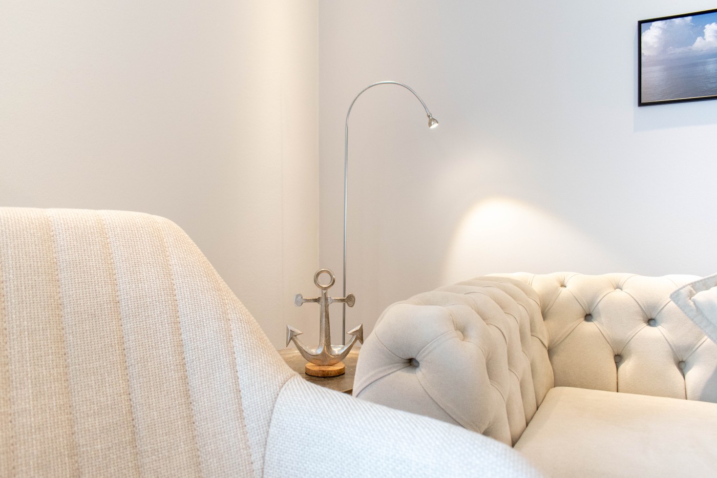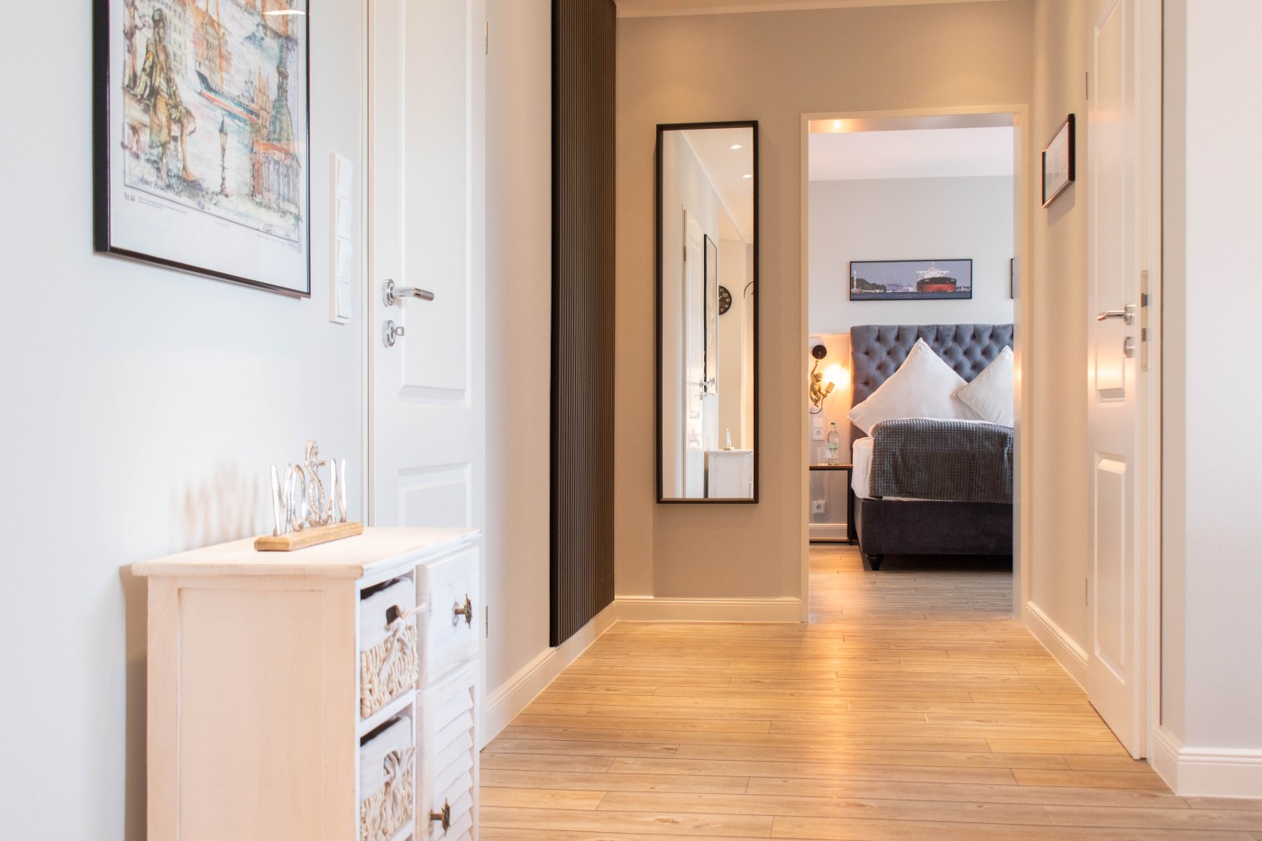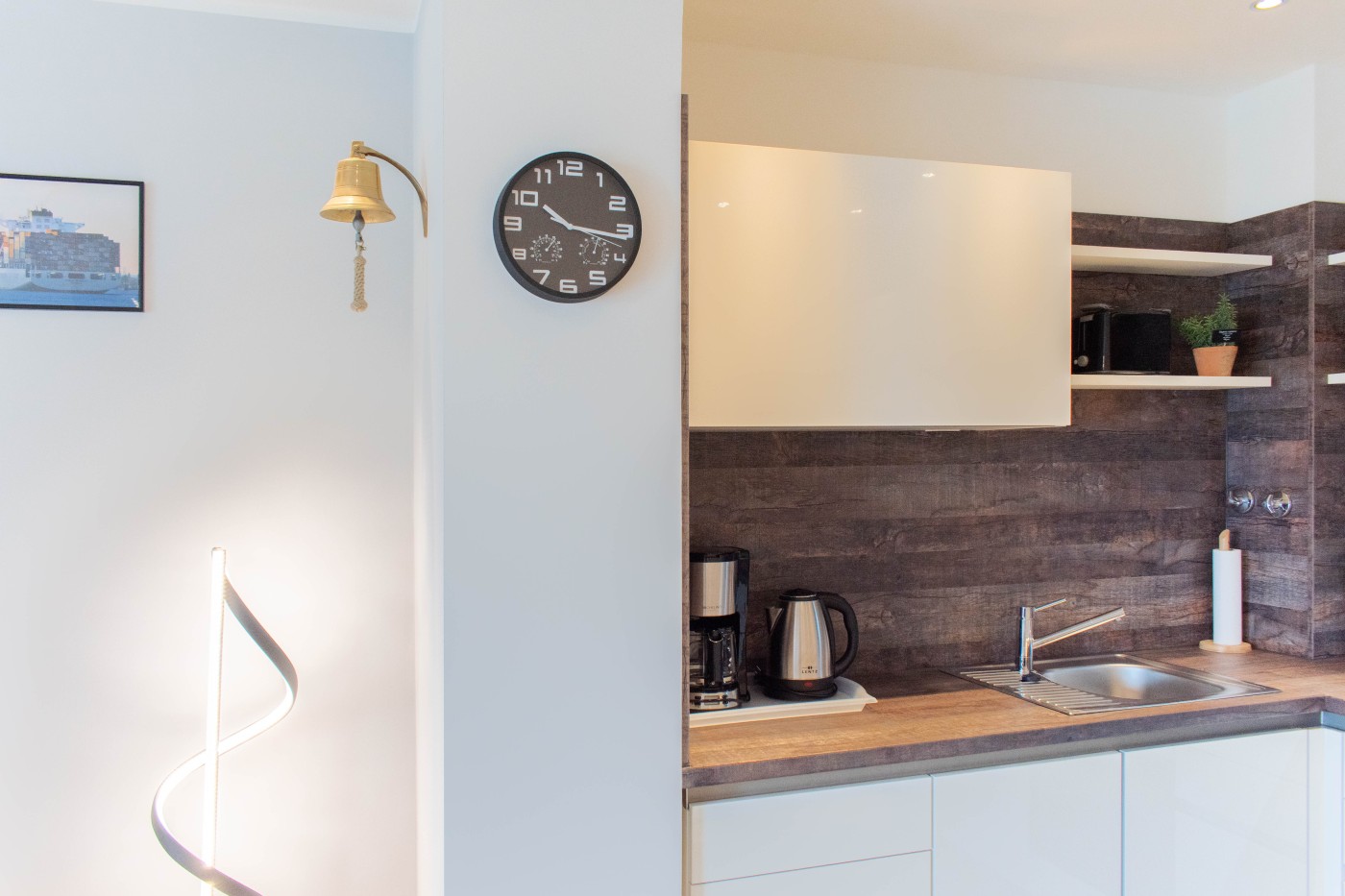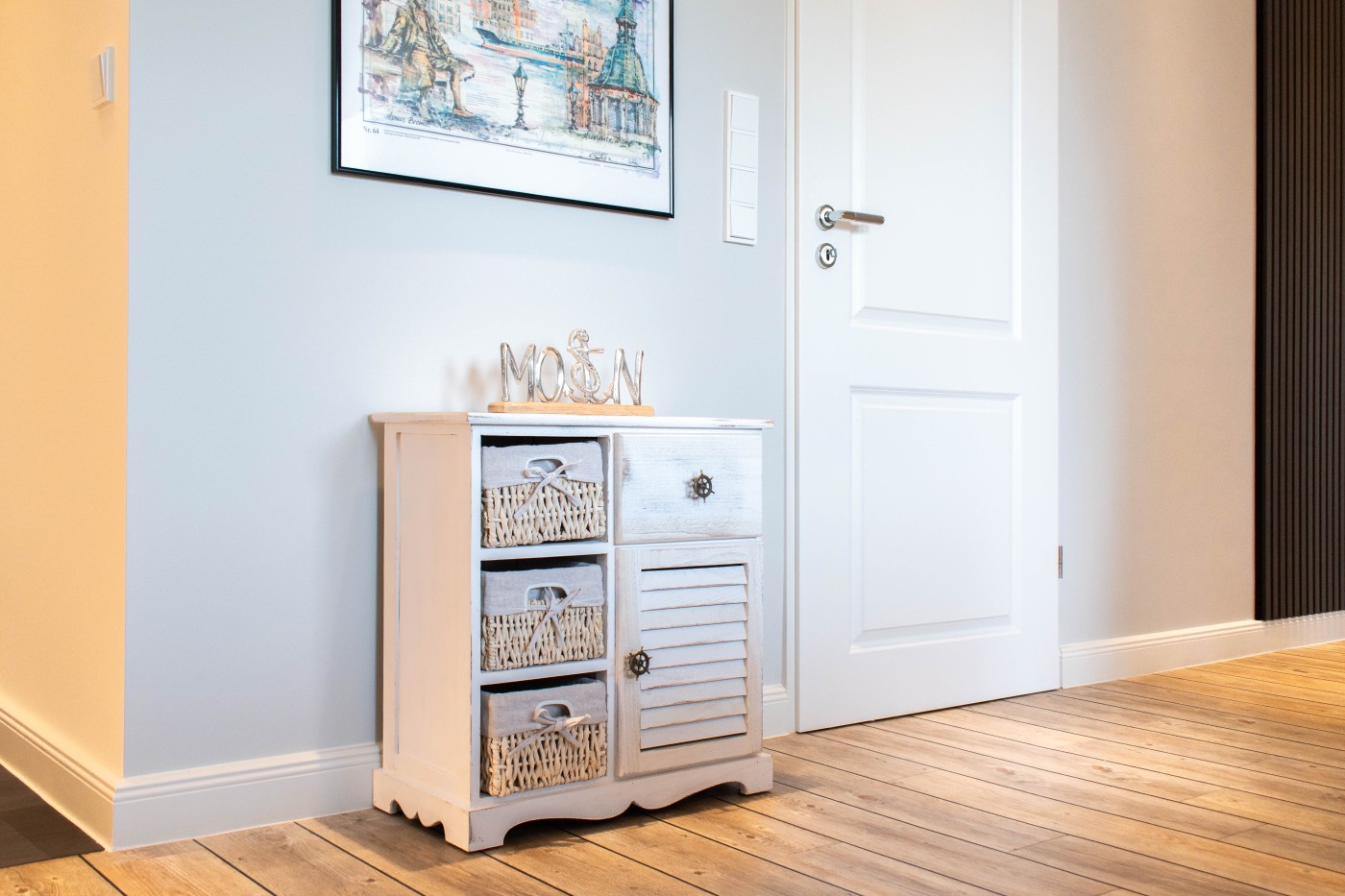 Die Ferienwohnung besticht auf 55 m² durch helles Interieur, warme Holztöne und harmonische Farbakzente. In den maritimen Dekoelementen und den Wandbildern finden sich die Nähe zum Meer und die Begeisterung für die Schifffahrt wieder, einfach echt nordisch.