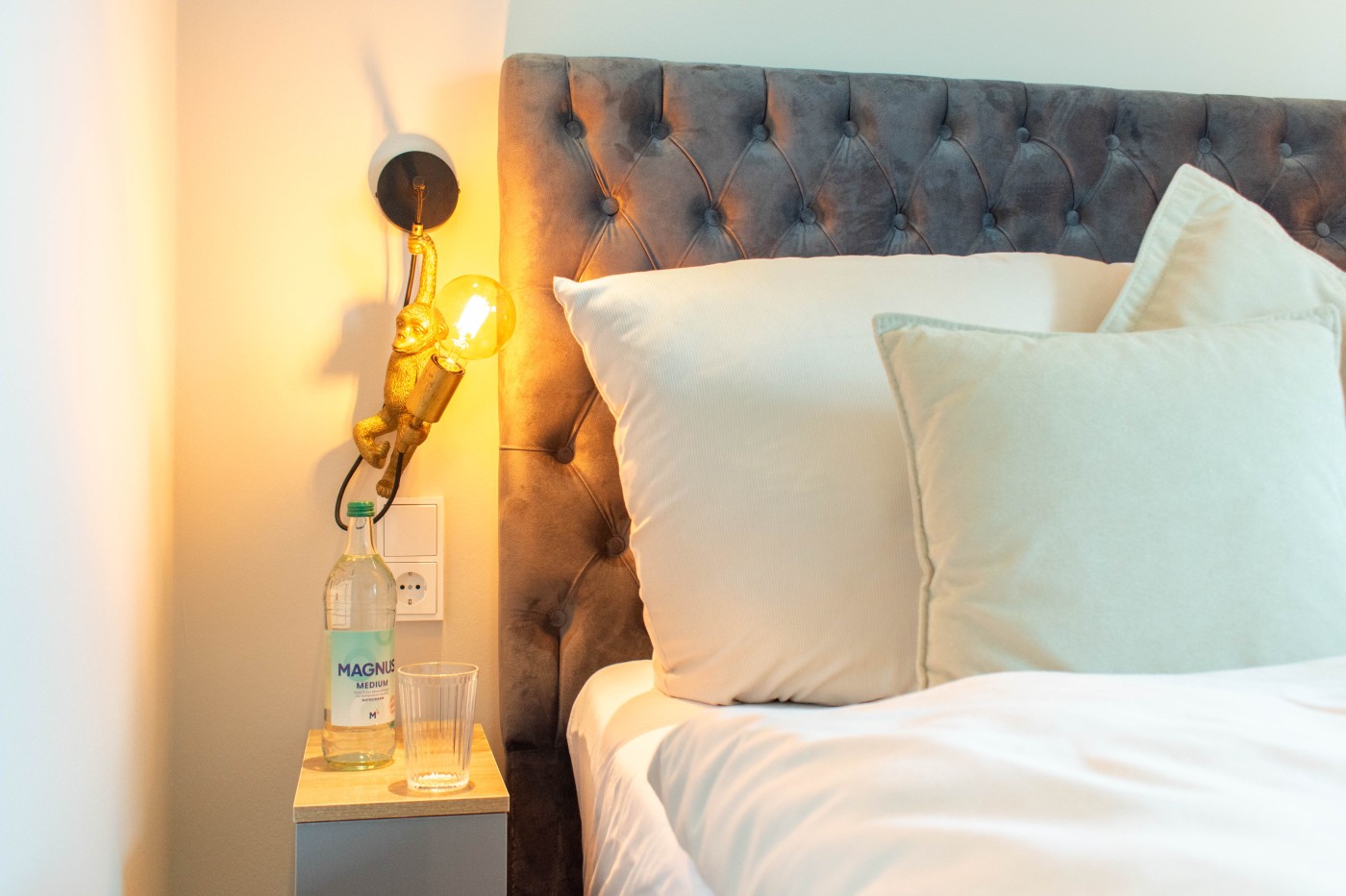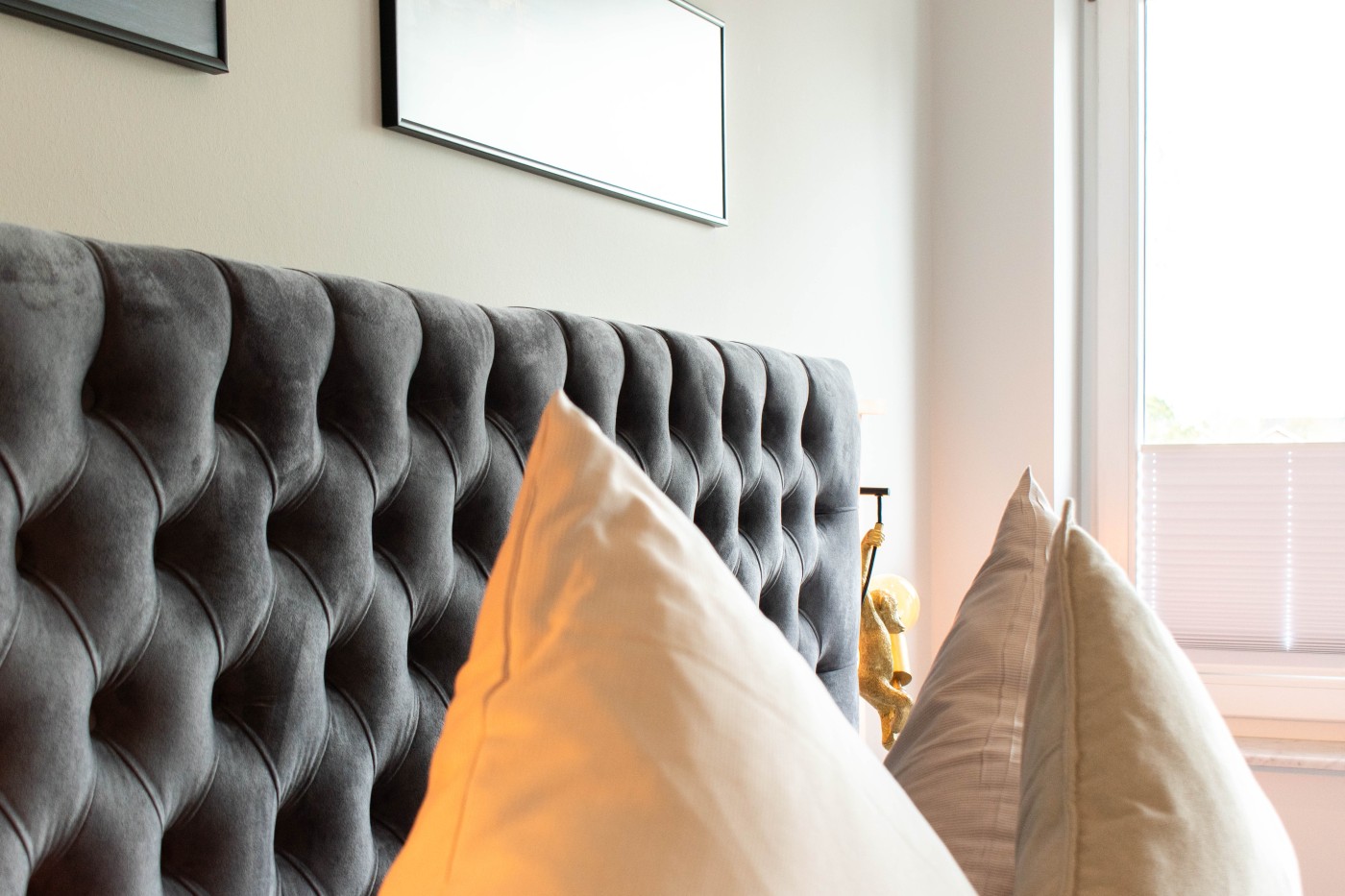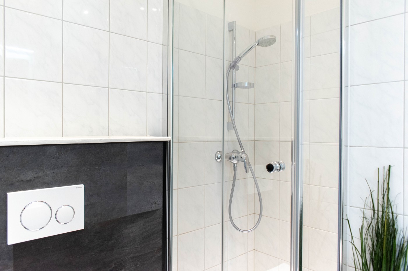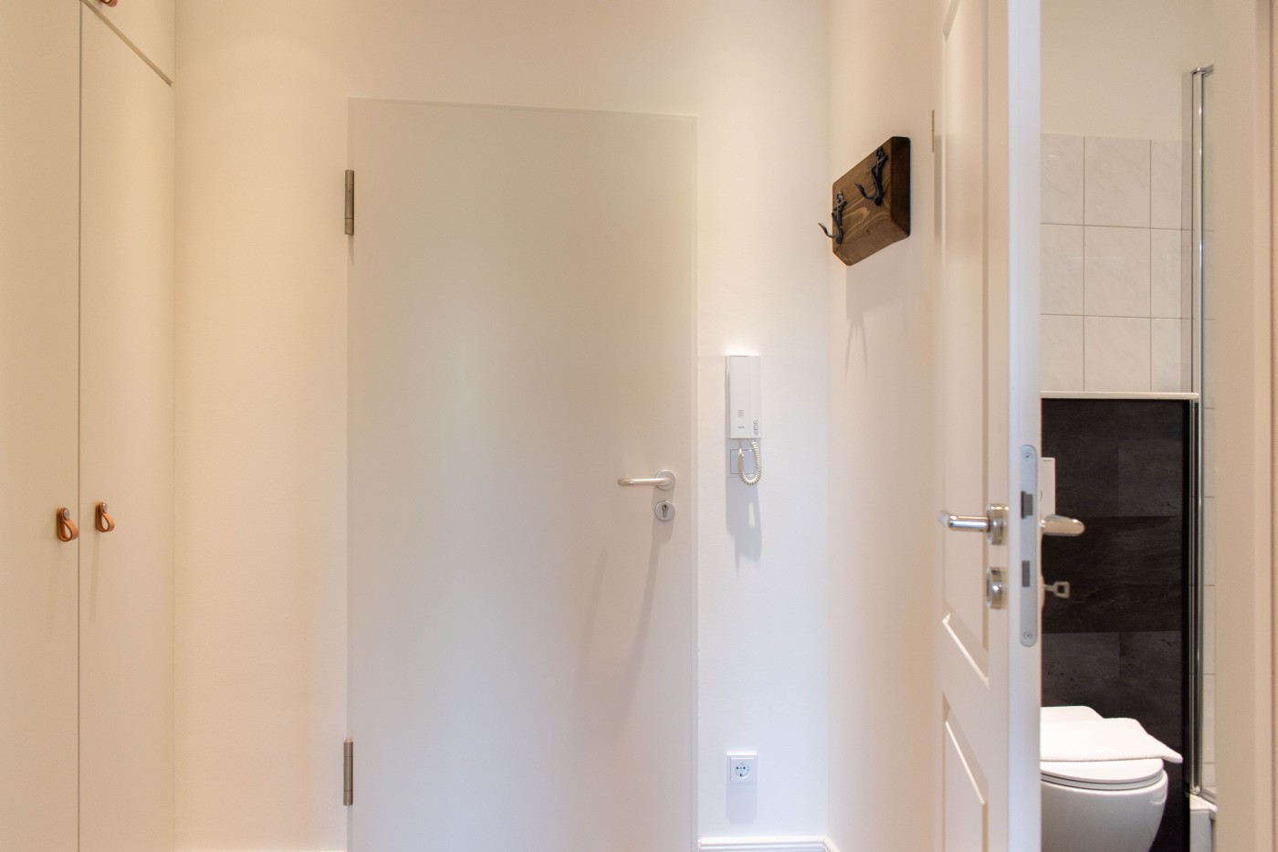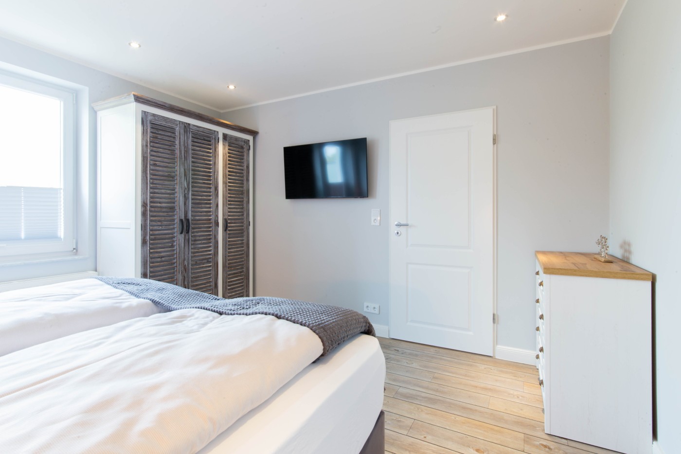 Drei Zimmer mit zwei separaten Schlafbereichen, moderner Küche und stilvollem Badezimmer bietet Platz für bis zu vier Gäste. Beide Schlafzimmer sind mit komfortablen Boxspringbetten (1,80er Breite & 1,60er Breite) ausgestattet. Der einladende Wohnbereich verfügt über eine gemütliche Couch und einen Esstisch mit vier Stühlen. Die offene gestaltete Küche ist bestens ausgestattet und lässt keine Wünsche offen. Vom Wohnzimmer und von dem kleineren Schlafzimmer gelangen Sie auf den möblierten Balkon, von dem aus Sie einen schönen seitlichen Meerblick genießen können. Das moderne Badezimmer ist mit einer Dusche und einem WC ausgestattet. Für Ihr Reisegepäck gibt es reichlich Stauraum im Kleiderschrank und im Flureinbauschrank.