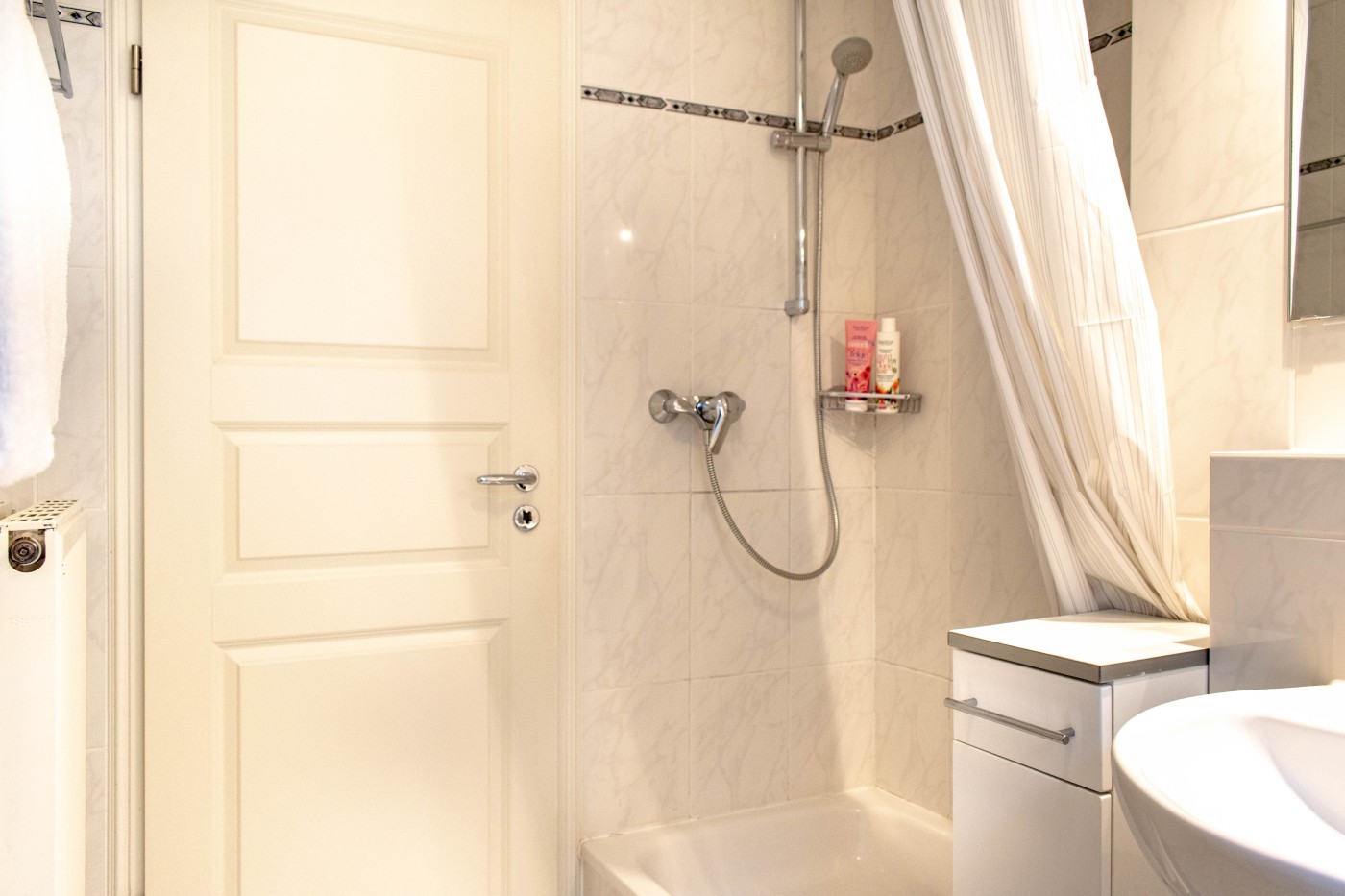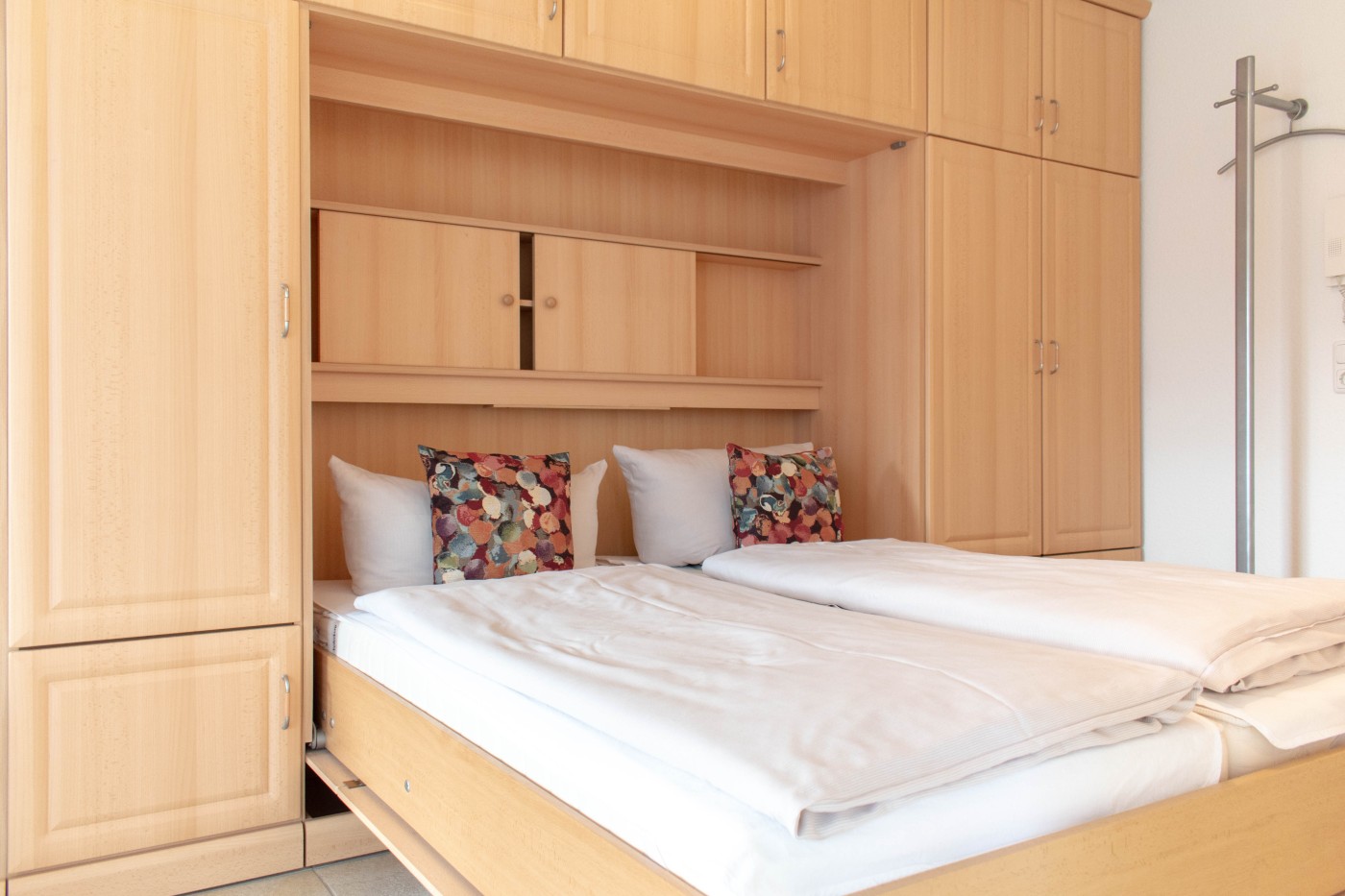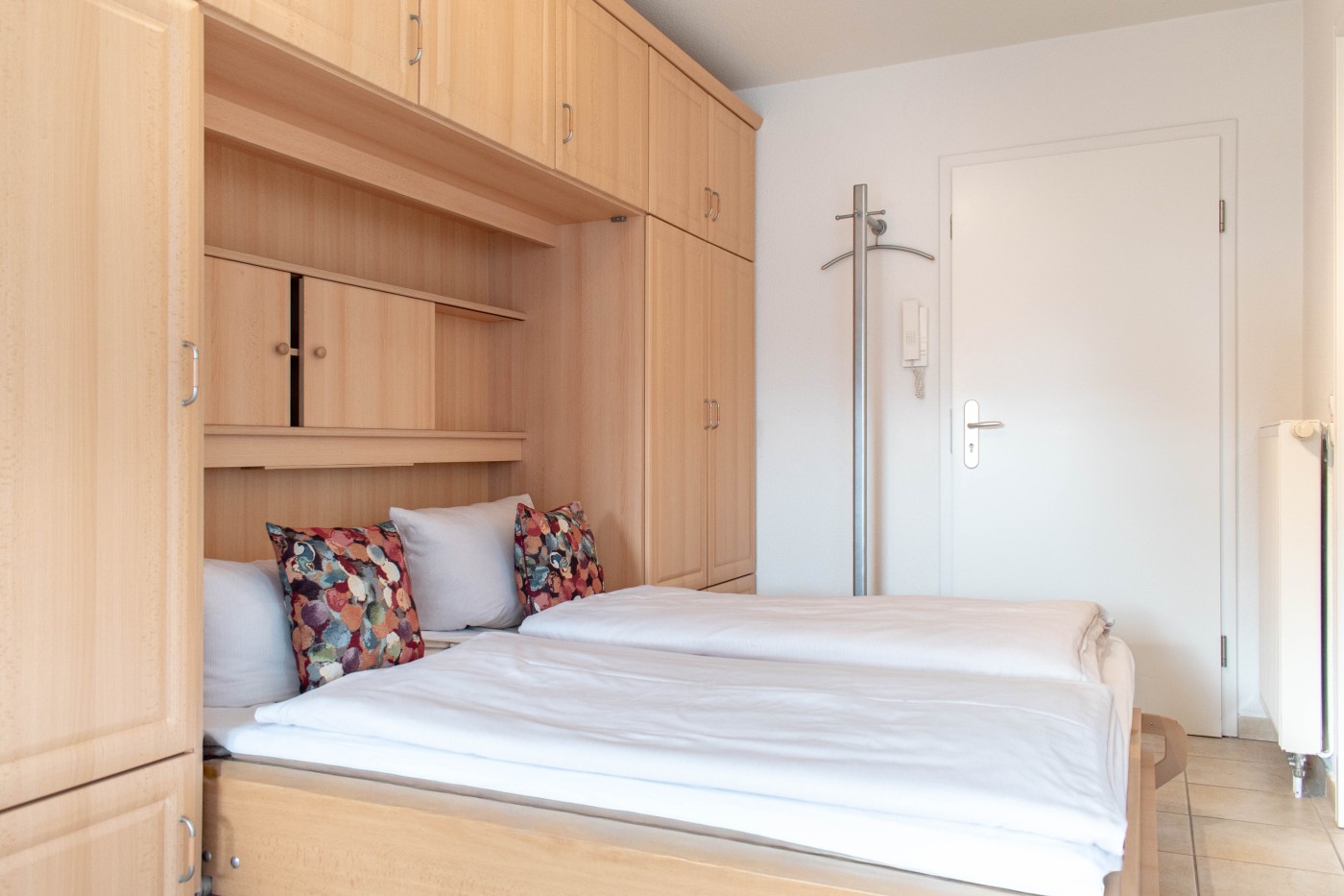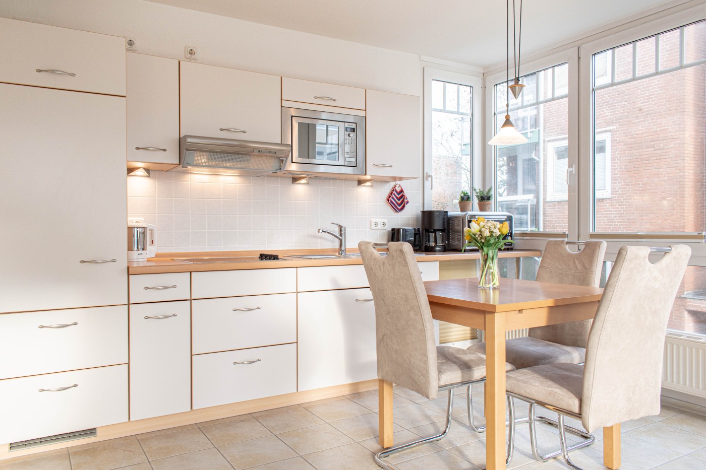 Die Ferienwohnung Dorfmeyer ist gemütlich und individuell ausgestattet. Sie befindet sich in der ersten Etage, welche man bequem mit dem Fahrstuhl erreichen kann. Der Wohnraum verfügt über ein gemütliches Sofa und zwei Sessel für einen kuschligen Fernsehabend. Die lichtdurchflutete Küche des Appartements ist voll ausgestattet und lässt keine Wünsche offen. Das Bad ist mit Dusche und mit einem WC ausgestattet. Ein rückenfreundliches und komfortables Schrankbett (2,00 x 1.60m) bietet angenehme Nächte und eine optimale Raumnutzung am Tag. Vom Wohnraum ereichen Sie den Balkon mit einmaligem Blick auf das Meer.