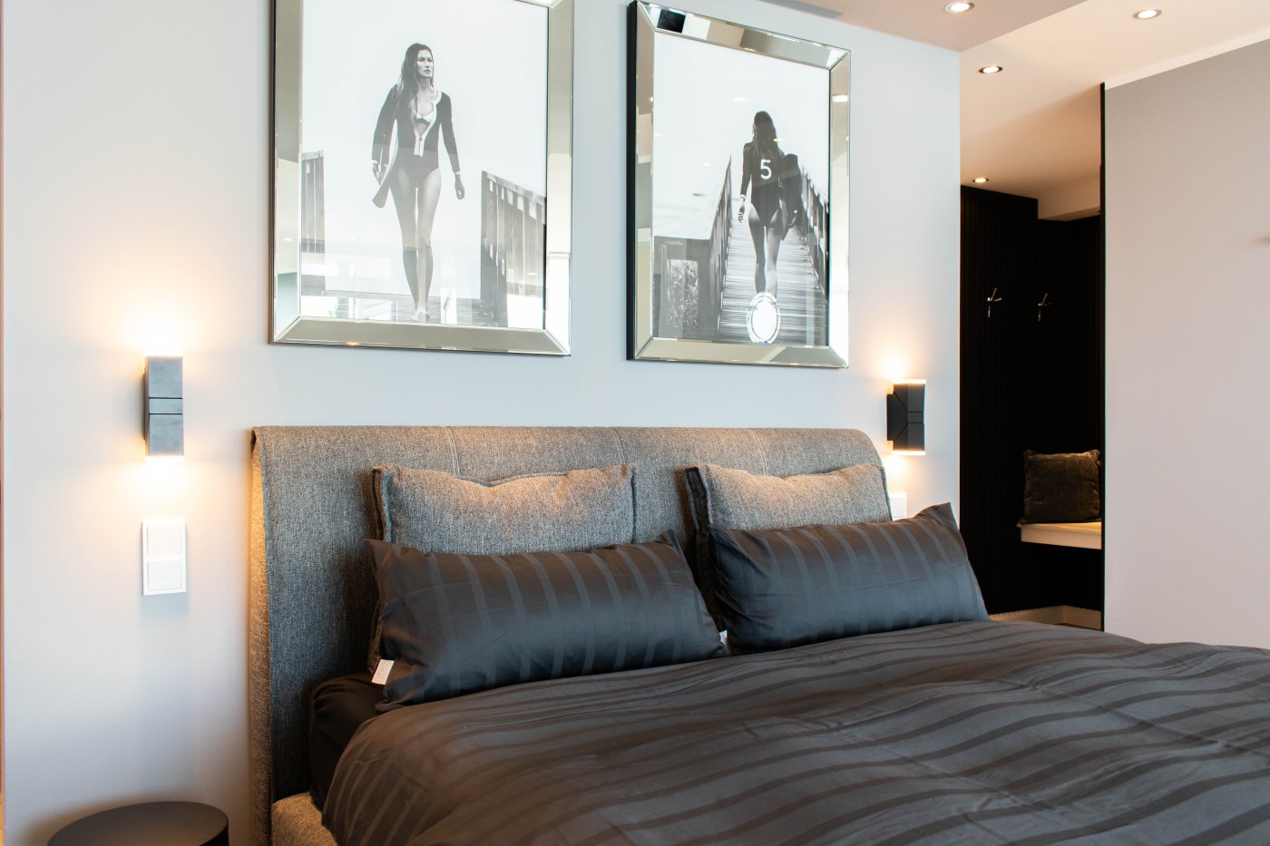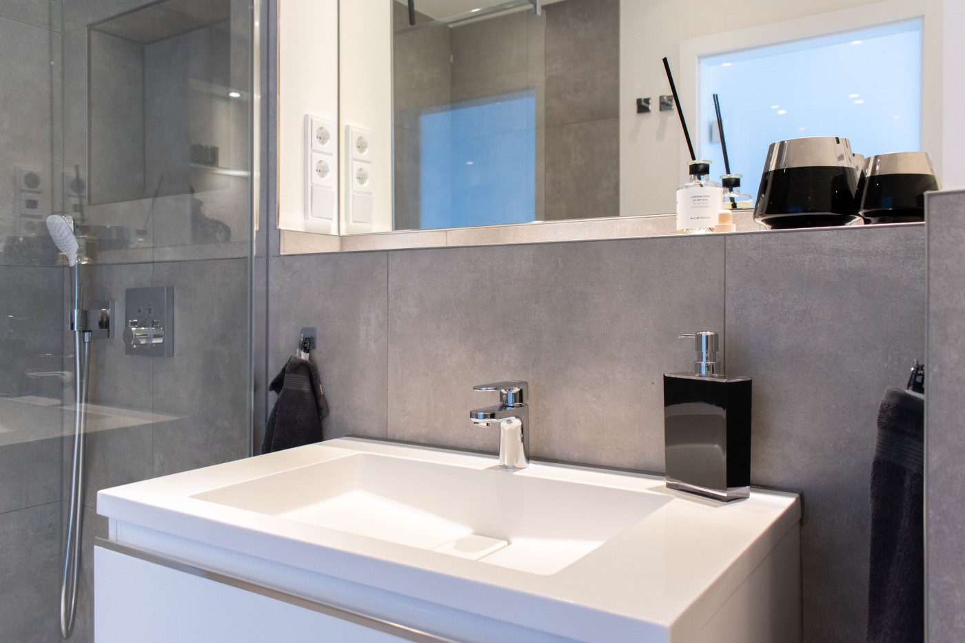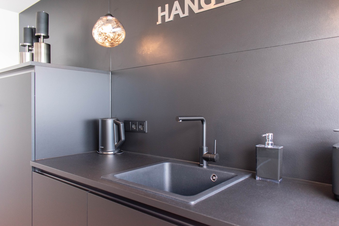 Die elegante Einrichtung arbeitet mit sorgfältig ausgewählten Elementen, die in Farbe und Form so perfekt aufeinander abgestimmt sind, dass sie einzeln für sich stehen und dennoch ein ganzheitliches, harmonisches Bild ergeben. Die Kombination aus edlen Materialien und sanften Grautönen schafft ein harmonisches und zeitloses Ambiente. Die schwarze Küchenzeile wirkt elegant und fügt sich perfekt in das Gesamtbild der Ferienwohnung ein.