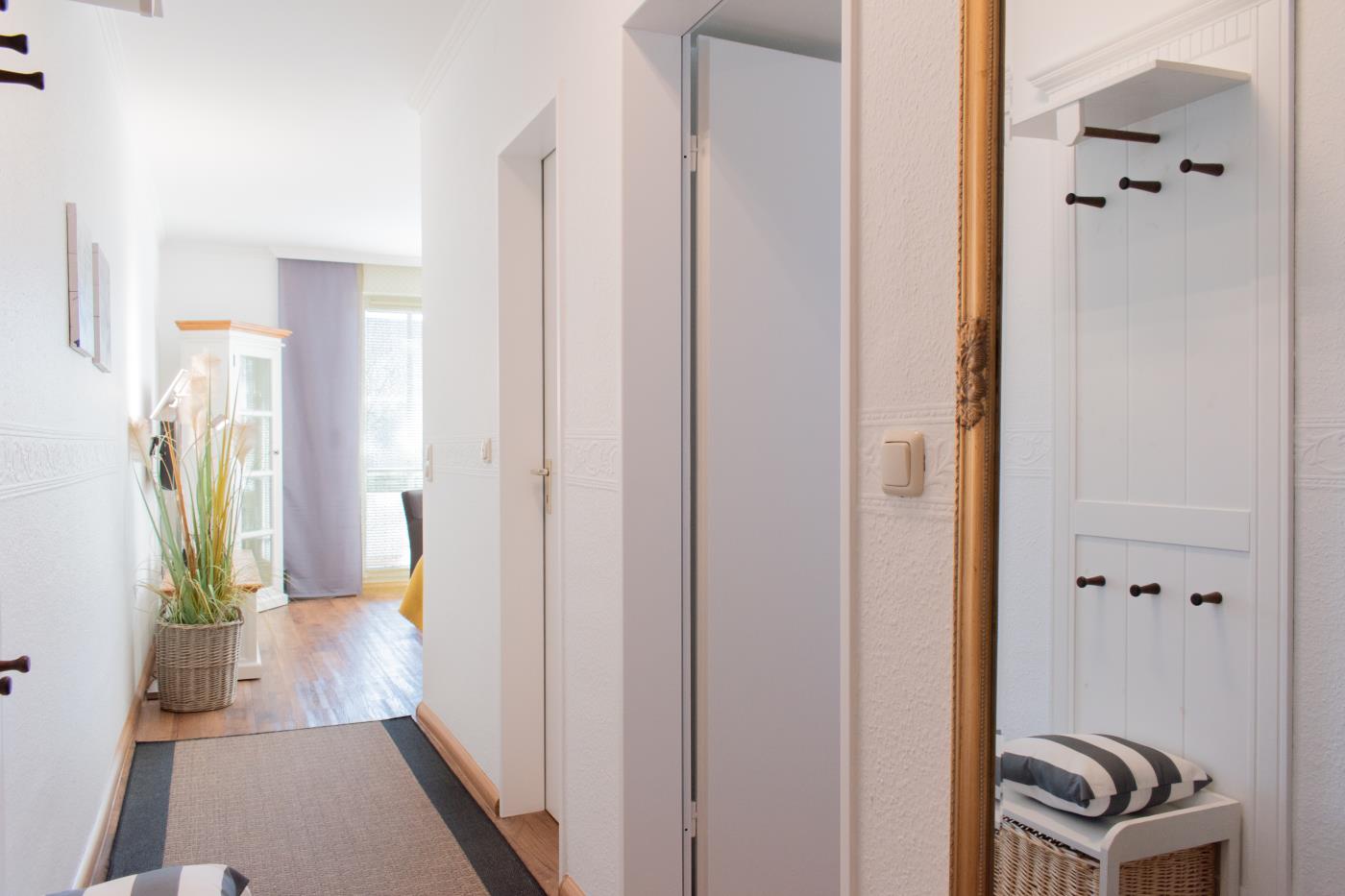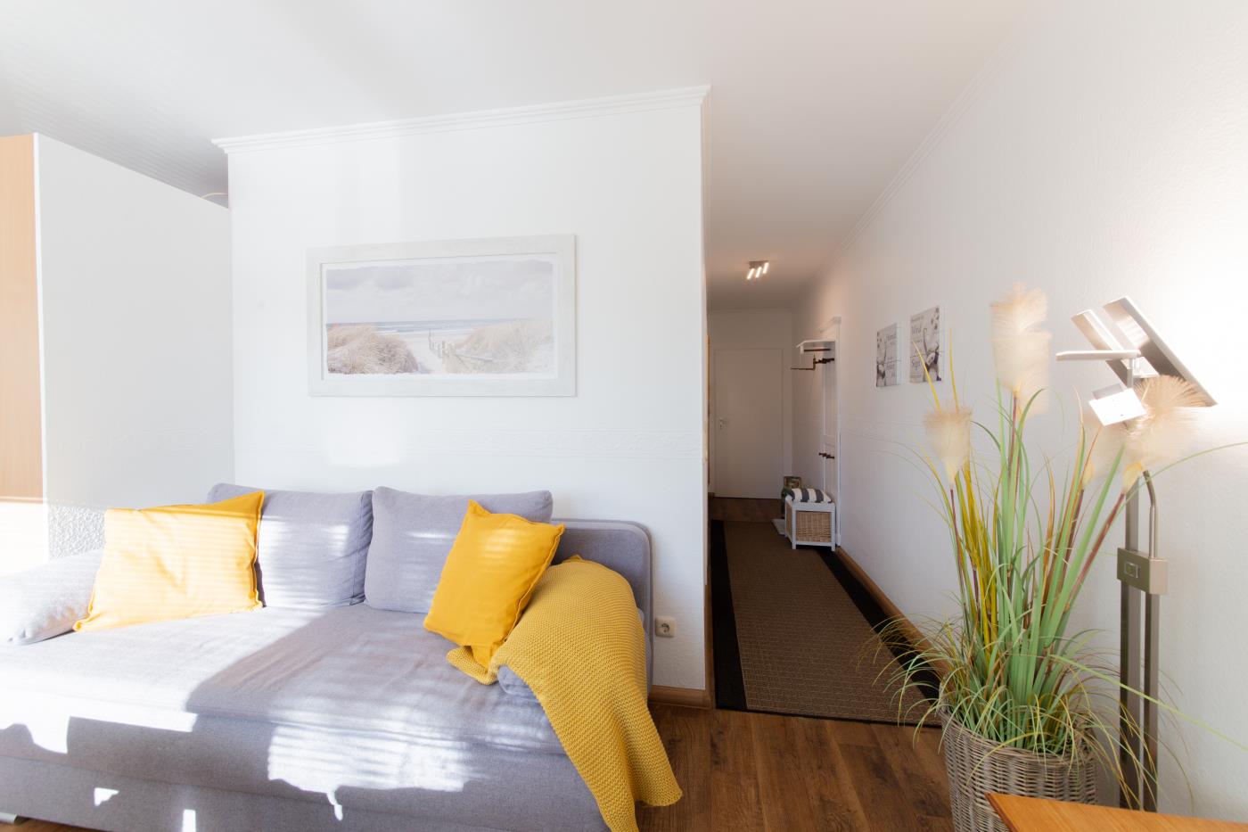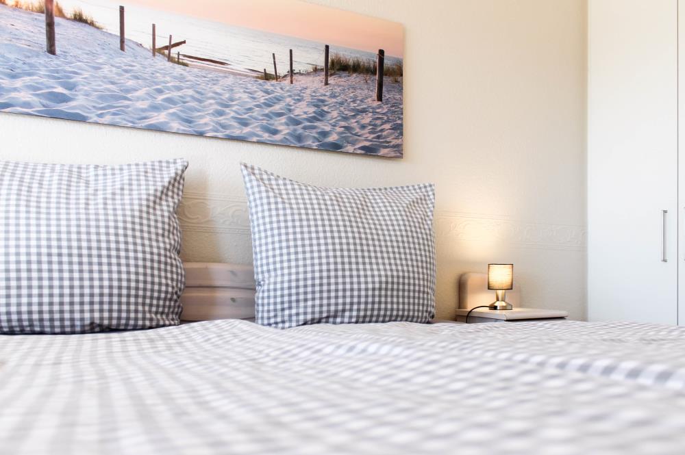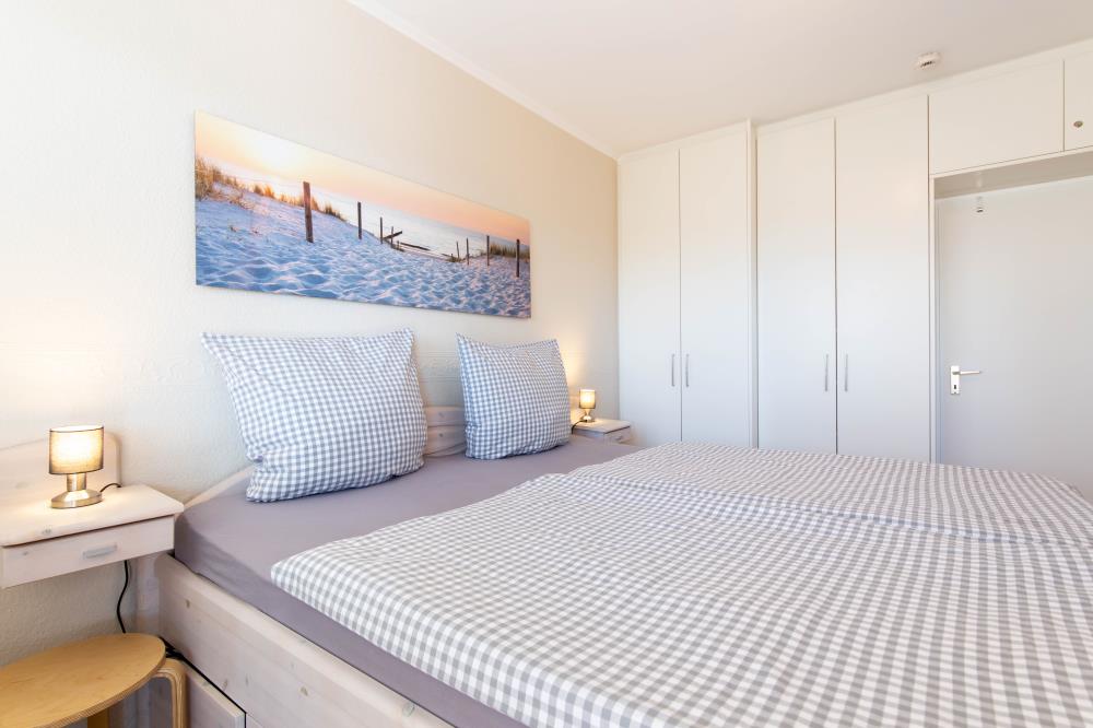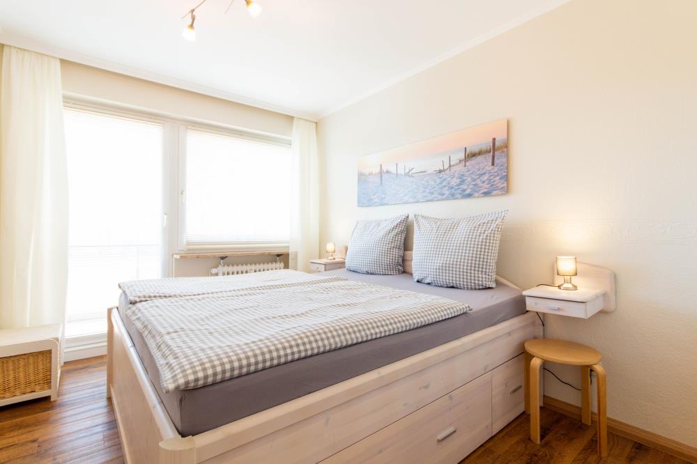 Zweizimmerwohnung mit separatem Schlafbereich, Küche und Balkon – ideal für bis zu drei Gäste und ein Kleinkind. Das Schlafzimmer ist mit einem gemütlichen Doppelbett (1,80 m) und einem großen Kleiderschrank ausgestattet, der ausreichend Platz für Ihre Kleidung bietet. Im hellen Wohn- und Schlafbereich finden Sie eine bequeme Ausziehcouch (1,40 m) vor, während die offene, komplett ausgestattete Küche zum gemeinsamen Kochen einlädt. Vom Wohnzimmer aus gelangen Sie auf den großzügigen, möblierten Süd-West-Balkon mit Strandkorb und zwei Zugängen – perfekt zum Entspannen und Sonne genießen. Das Badezimmer verfügt über Dusche und WC. Die elektrischen Rollläden sorgen in allen Räumen für angenehme Ruhe und erholsamen Schlaf.