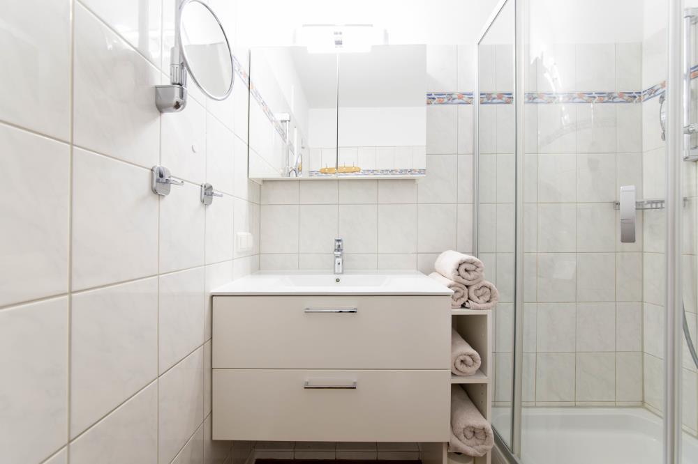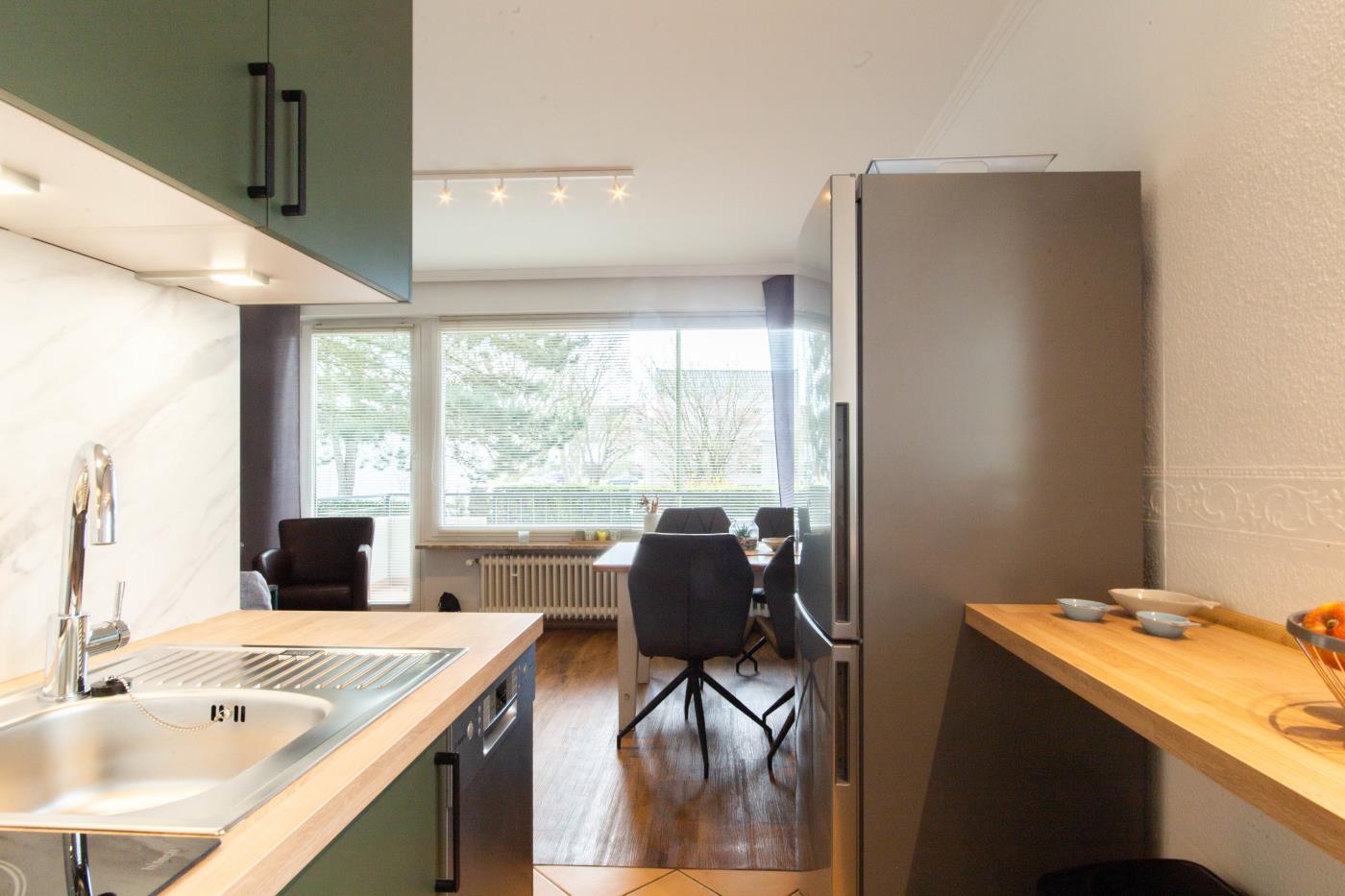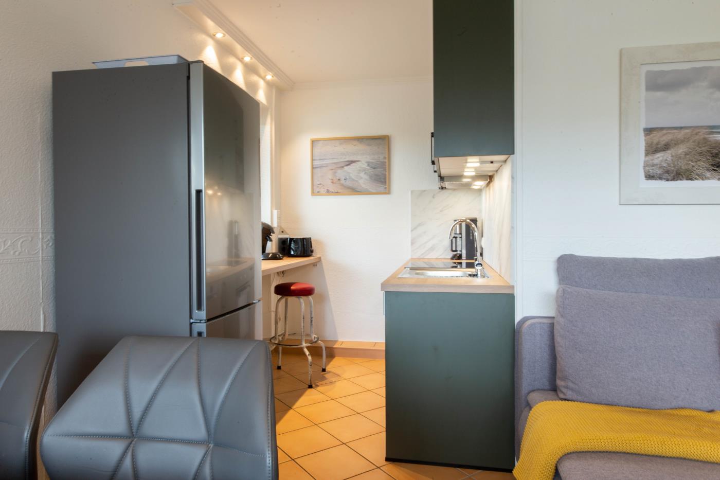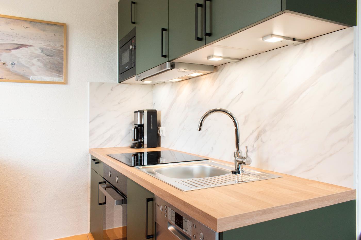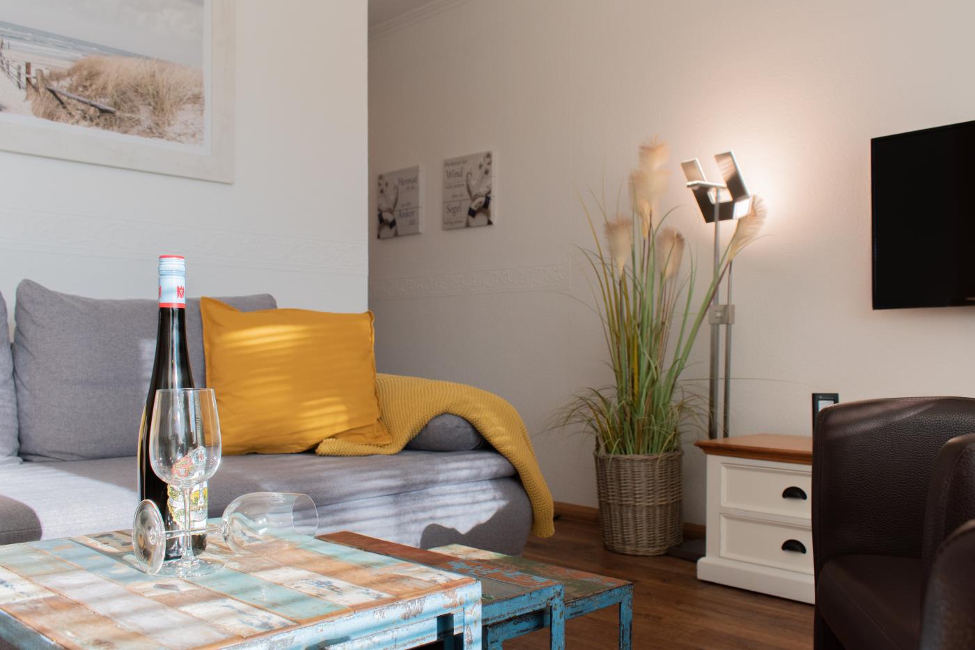 Zweizimmerwohnung mit separatem Schlafbereich, Küche und Balkon – ideal für bis zu drei Gäste und ein Kleinkind. Das Schlafzimmer ist mit einem gemütlichen Doppelbett (1,80 m) und einem großen Kleiderschrank ausgestattet, der ausreichend Platz für Ihre Kleidung bietet. Im hellen Wohn- und Schlafbereich finden Sie eine bequeme Ausziehcouch (1,40 m) vor, während die offene, komplett ausgestattete Küche zum gemeinsamen Kochen einlädt. Vom Wohnzimmer aus gelangen Sie auf den großzügigen, möblierten Süd-West-Balkon mit Strandkorb und zwei Zugängen – perfekt zum Entspannen und Sonne genießen. Das Badezimmer verfügt über Dusche und WC. Die elektrischen Rollläden sorgen in allen Räumen für angenehme Ruhe und erholsamen Schlaf.