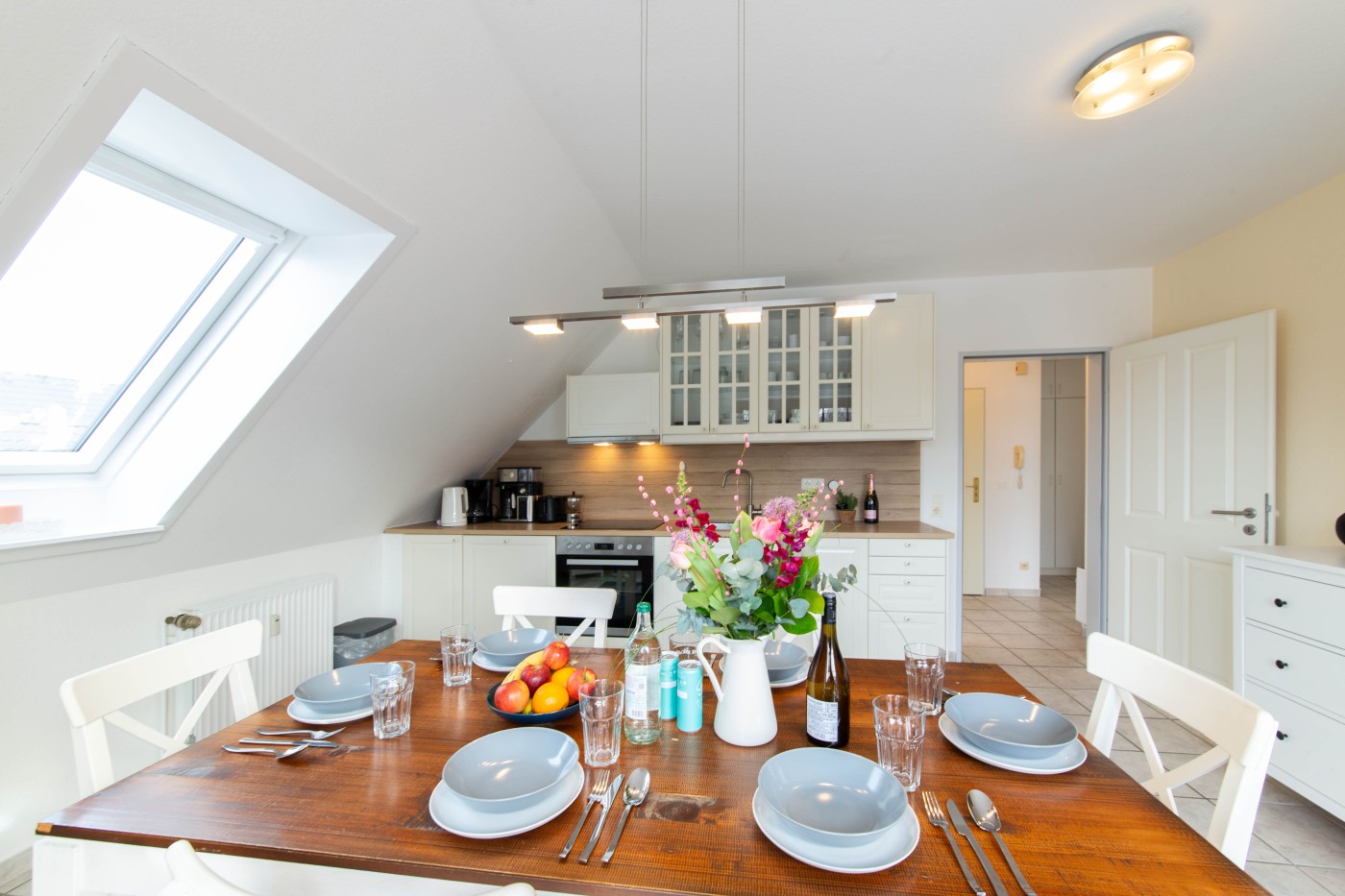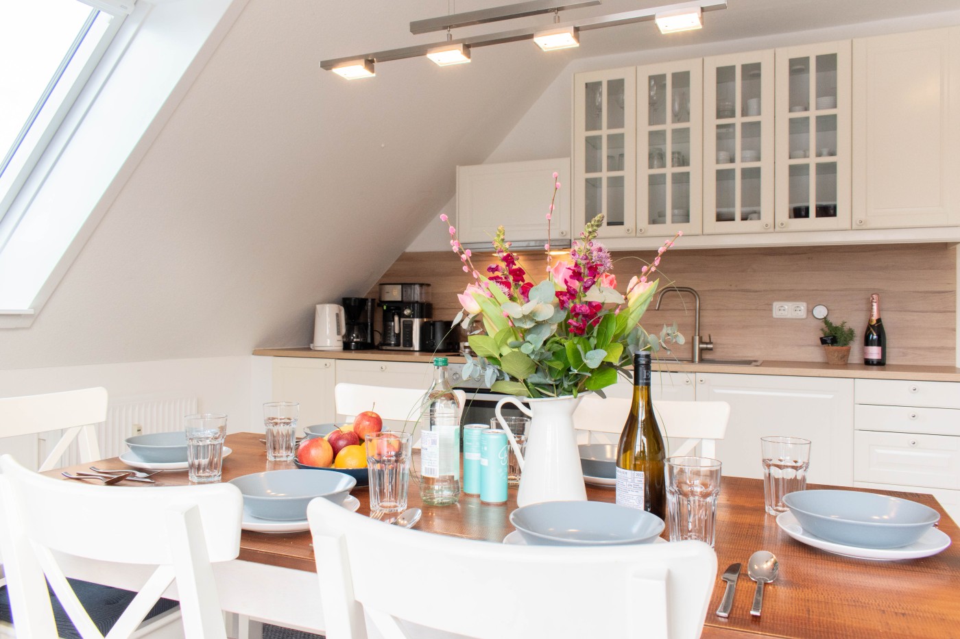 Die Wohnung überzeugt mit nordischem Flair und der liebevollen, durchdachten Einrichtung. Die voll ausgestattete Küche bietet beste Voraussetzungen für gesellige Kochabende, am großen Esstisch finden sechs Personen Platz. Der angrenzende, größere Balkon ist Richtung Westen ausgerichtet. Das separate Wohnzimmer verfügt über zwei Schlafsofas (je 1,60 x 2,00 m) und bietet Zugang zum zweiten Balkon. Dieser ist etwas kleiner und Richtung Süden ausgerichtet. Das separate Schlafzimmer verfügt über ein gemütliches Doppelbett (1,80 m Breite) und einem großen Kleiderschrank mit reichlich Stauraum. Durch das Veluxfenster über dem Bett können Sie noch vor dem Einschlafen den Nachthimmel beobachten, abdunkeln lässt es sich mit einem Plissee. Das Tageslichtbad ist mit einer großen Eckdusche und einem WC ausgestattet. Eine Waschmaschine und ein Trockner stehen Ihnen im Gemeinschaftskeller der Anlage zur Verfügung, perfekt für den Familienurlaub an der Ostsee.