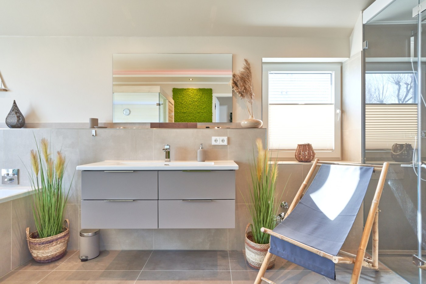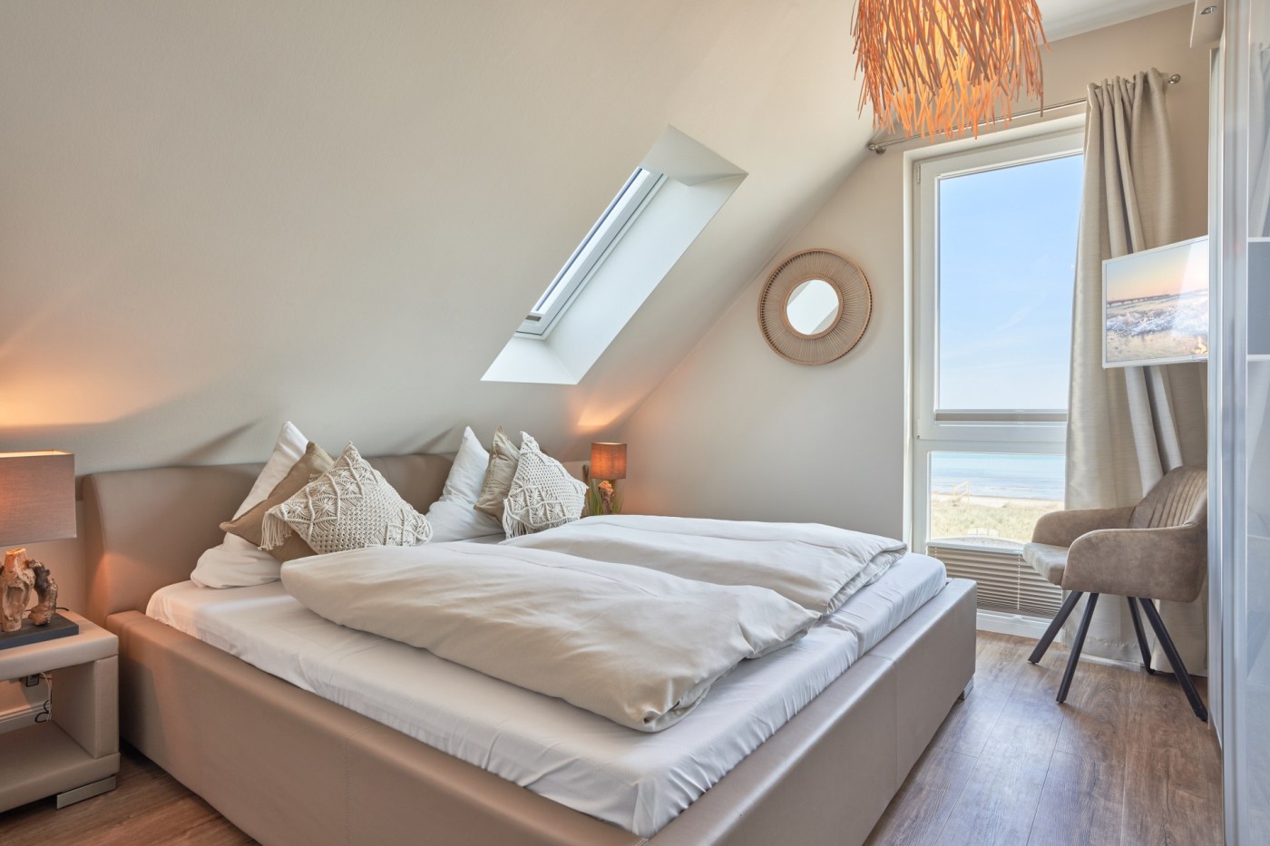 Das Interieur der Ferienwohnung Ocean House vereint nordische Klarheit mit sanfter Boho-Leichtigkeit. Helle Farben, natürliche Materialien und stilvolle Akzente schaffen ein harmonisches Ambiente, das gleichzeitig modern, edel und gemütlich wirkt – ein Ort, der inspiriert und zum Wohlfühlen einlädt.