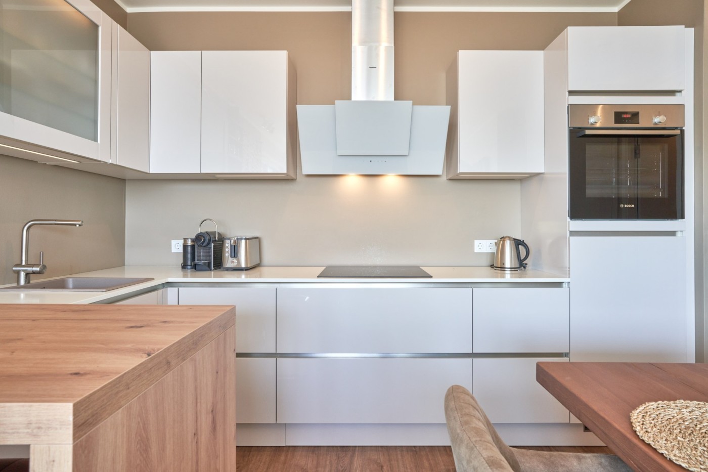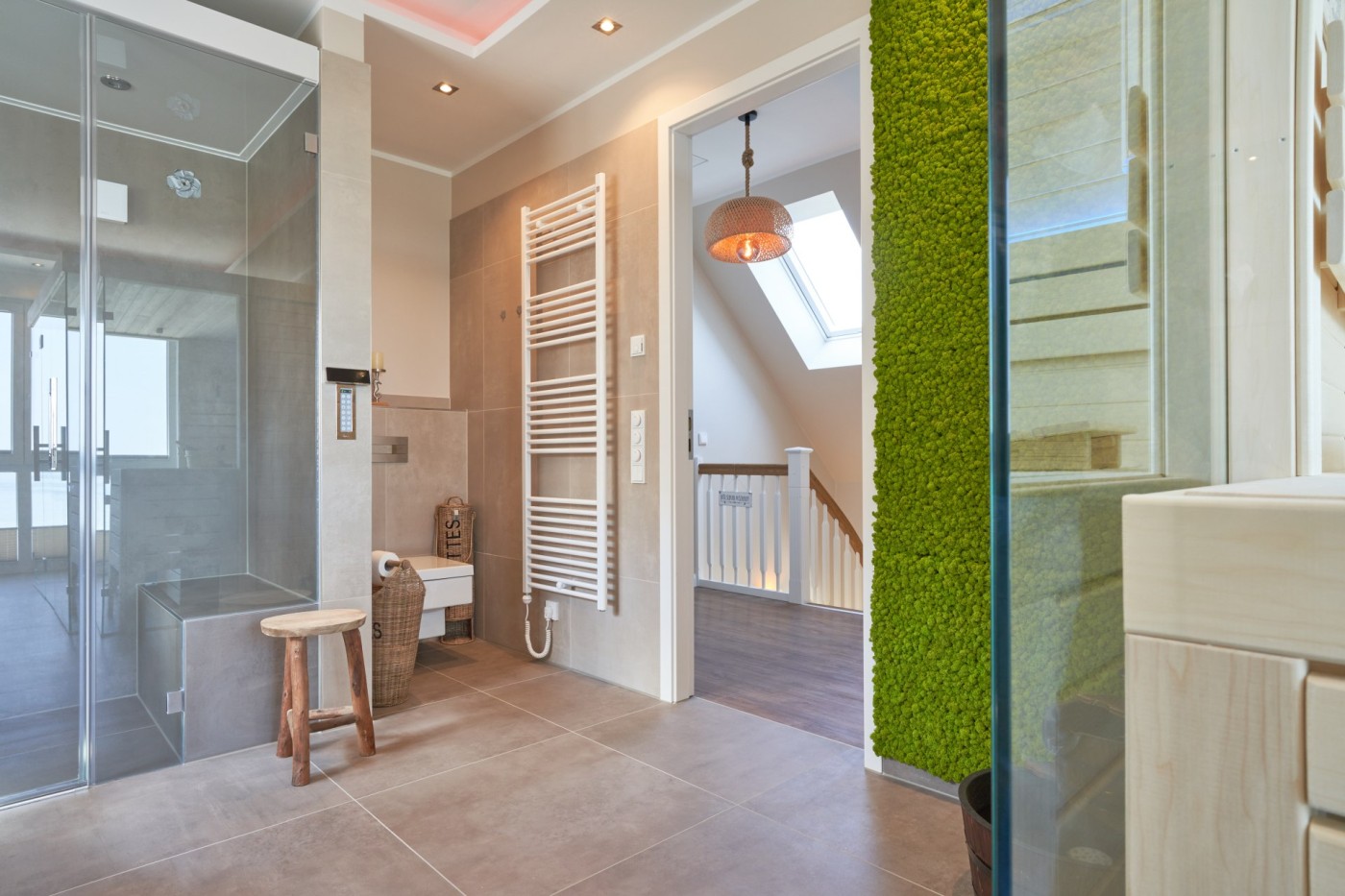 Die Maisonette-Wohnung überzeugt mit einem stilvollen Raumkonzept, hochwertigen Materialien und liebevollen Details. Im liebevoll gestalteten Wohnzimmer mit Kamin lassen sich gemütliche Abende verbringen, während man das Rauschen der Wellen hört oder den Blick auf die Ostsee genießt. Zwei komfortable Schlafzimmer, jeweils ausgestattet mit einem Boxspringbett (1,80 x 2,00 m), einem Smart-TV und beleuchteten Kleiderschränken, sorgen für erholsame Nächte und höchsten Komfort für bis zu vier Personen. Die moderne Küche mit Bartresen und Hockern ist vollständig und hochwertig ausgestattet, inklusive Induktionsherd, Backofen, Geschirrspüler und Kaffeemaschine – und lädt dazu ein, auch im Urlaub kulinarische Momente zu genießen. Ob ein entspanntes Frühstück mit Meerblick oder ein gemeinsames Abendessen im stilvollen Ambiente, hier fehlt es an nichts. Die elegante, beleuchtete Holztreppe führt in die obere Etage und unterstreicht das durchdachte Design der Wohnung. Ein besonderes Highlight sind die zwei modernen Bäder, die mit stilvollem Design und Komfort überzeugen. Eines davon verfügt über eine Sauna und eine Whirlpool-Badewanne und einen stilvollen Wasserbrunnen, die zusammen einen echten Wellnessbereich entstehen lassen - und selbst von hier genießen Sie den direkten Blick auf die Ostsee. Beide Bäder sind mit einer Deckenbeleuchtung in Farblichttherapie ausgestattet sind - perfekt, um nach einem Tag am Meer zur Ruhe zu kommen. Im Obergeschoss befindet sich außerdem ein Homeoffice Arbeitsplatz sowie ein Getränkekühlschrank. Auf dem Balkon genießen Sie den Blick auf die Promenade und die Ostsee. Ein wunderbarer Ort, um den Tag bei einem Glas Wein und dem Klang der Wellen ausklingen zu lassen.
