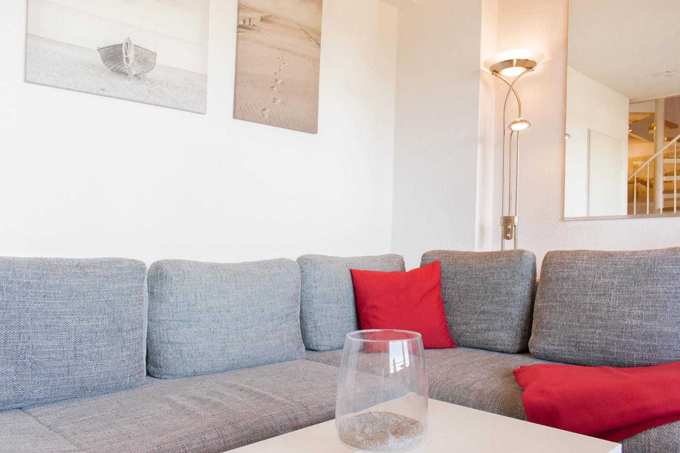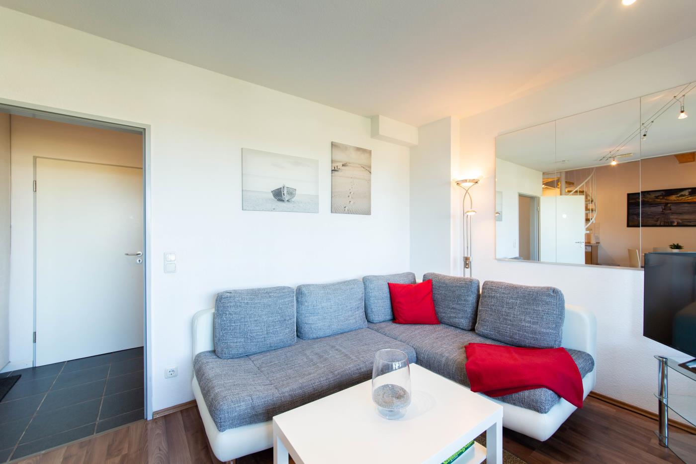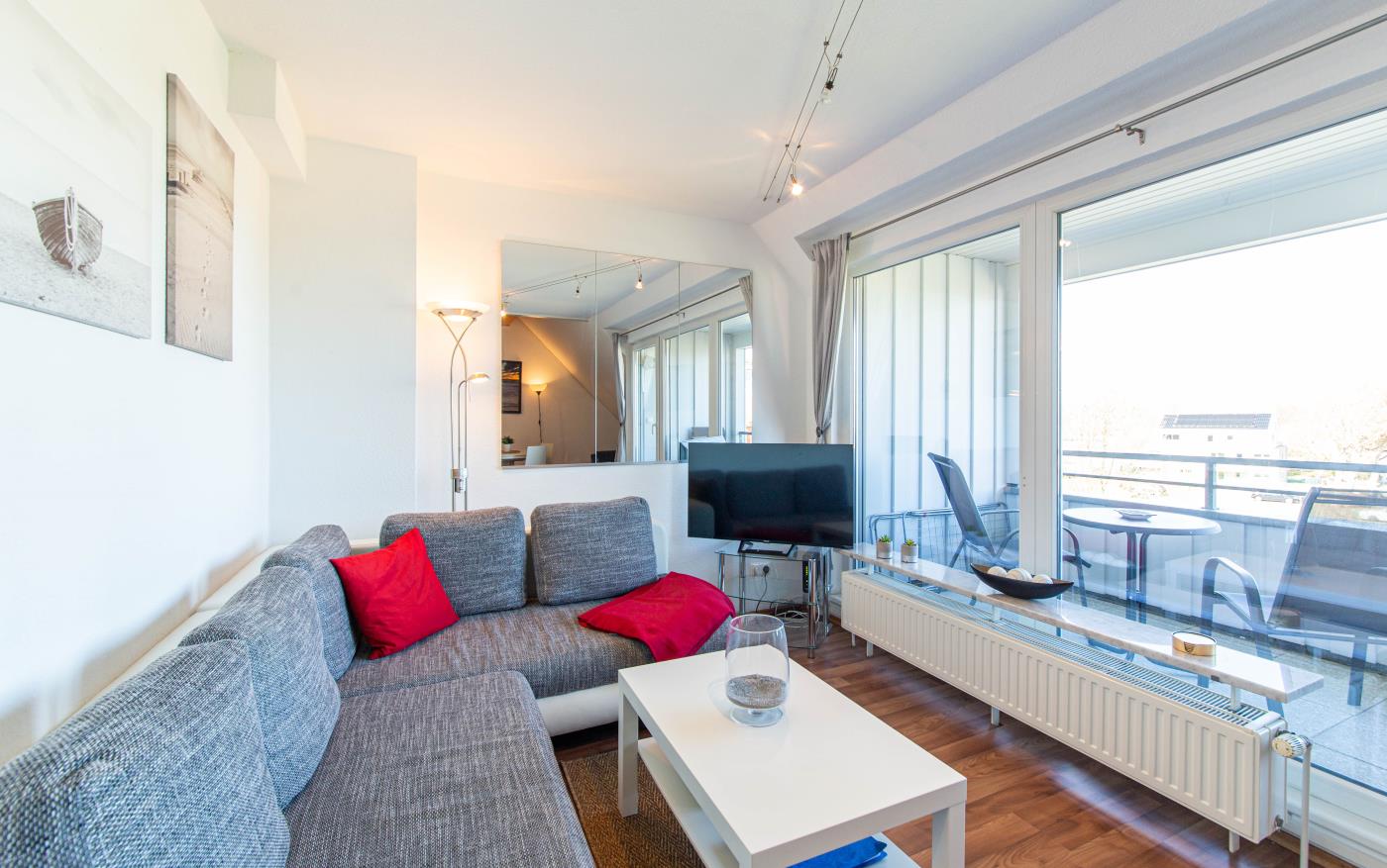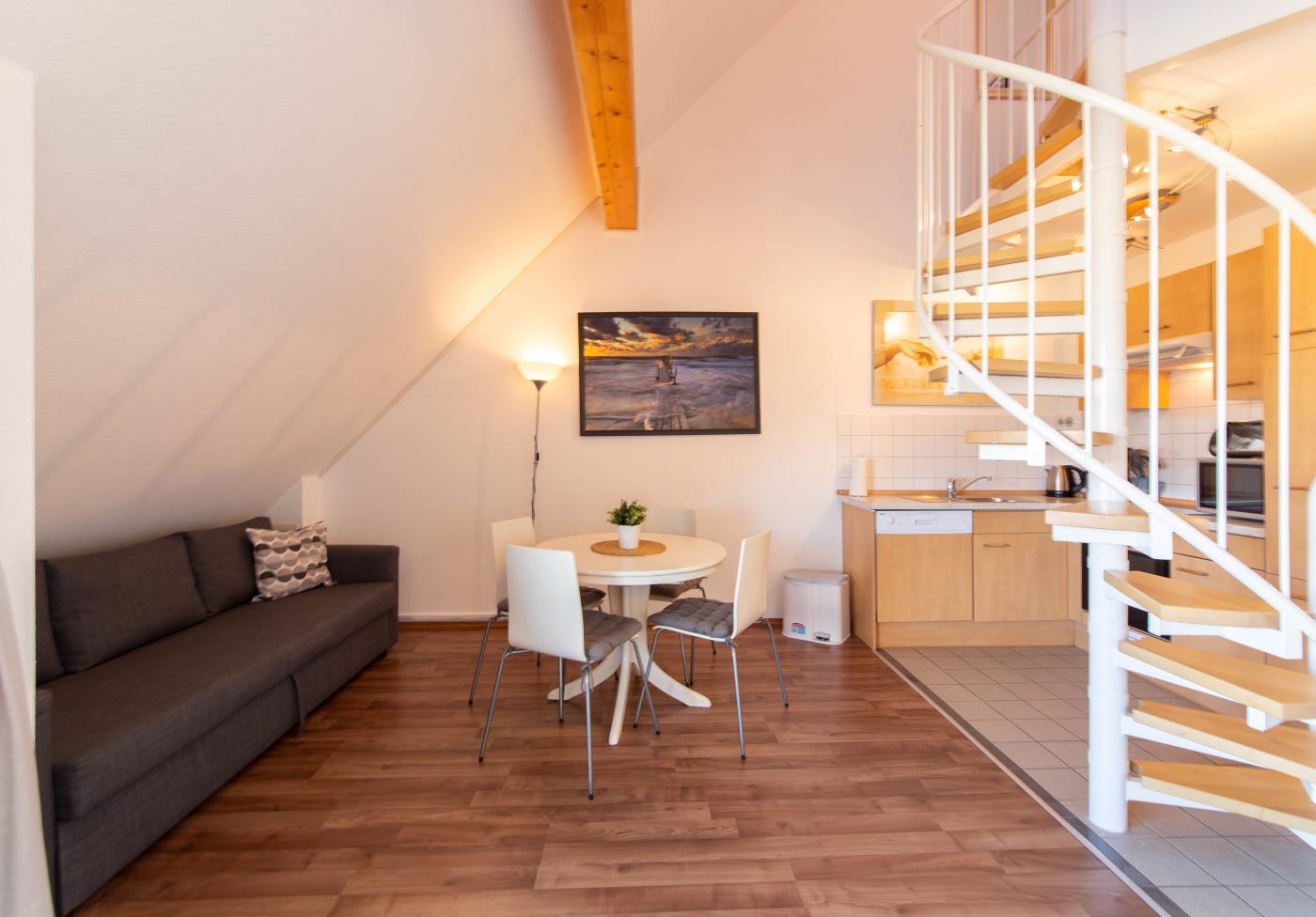 Anderthalb Zimmer mit Schlafbereich, Balkon und Küche bieten Platz für vier Gäste. Der eine Schlafbereich befindet sich auf einer offenen Empore und verfügt über ein gemütliches Doppelbett (1,80er Breite) und einem Kleiderschrank. Im Wohnbereich dient eine gemütliche Schlafcouch (1,40er Breite) als Schlafmöglichkeit. Die offene Küche ist komplett ausgestattet und lässt keine Wünsche offen. Vom Wohnzimmer aus erreicht man den überdachten Balkon mit seitlichem Meerblick, welcher zum Verweilen und Relaxen einlädt. Das Badezimmer verfügt über eine Dusche und ein WC. Desweiteren befindet sich im Appartement eine Waschmaschine, welche kostenfrei von dem Gast mitgenutzt werden kann. Elektrische Rollläden im unteren Bereich sorgen für einen angenehmen Schlafkomfort.