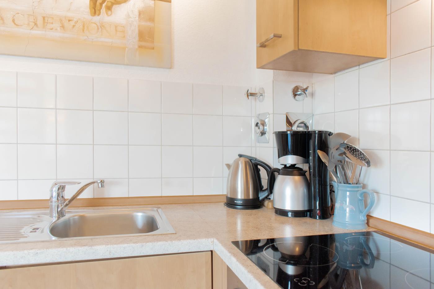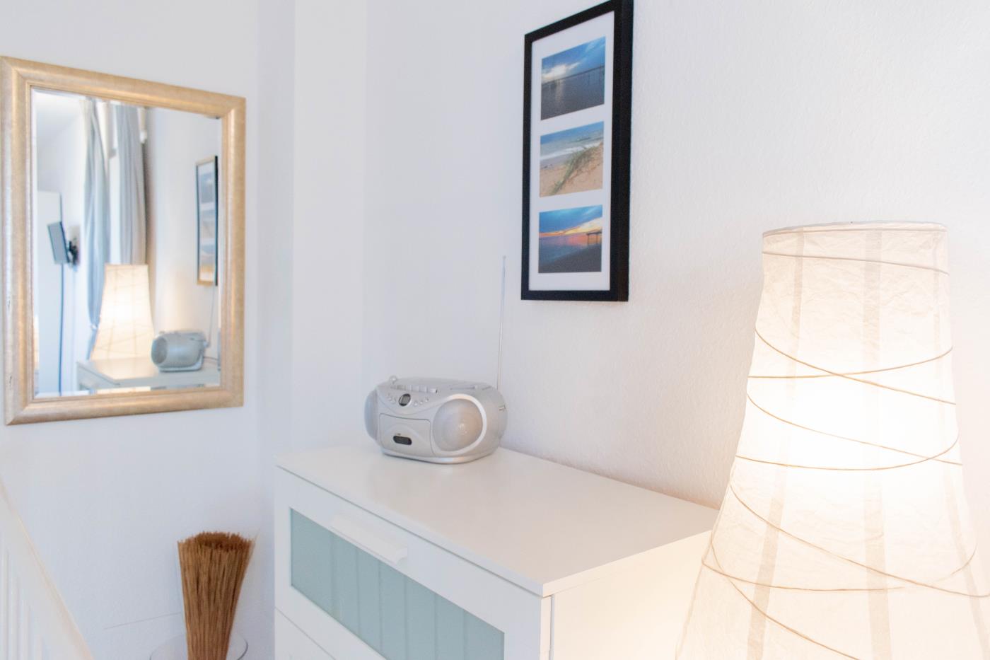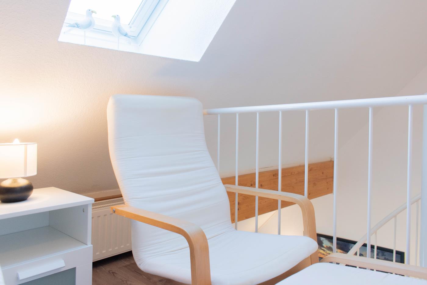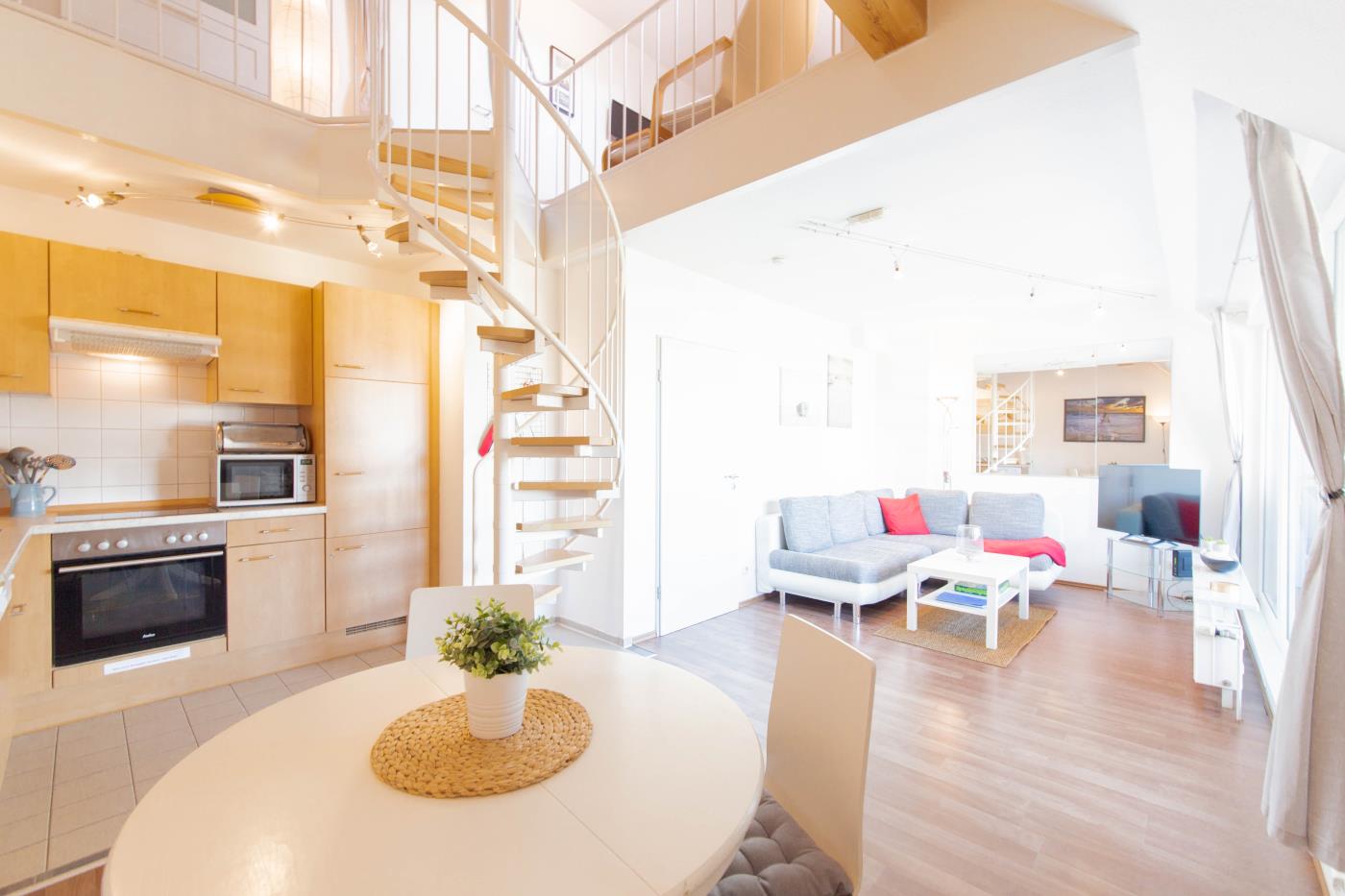 Anderthalb Zimmer mit Schlafbereich, Balkon und Küche bieten Platz für vier Gäste. Der eine Schlafbereich befindet sich auf einer offenen Empore und verfügt über ein gemütliches Doppelbett (1,80er Breite) und einem Kleiderschrank. Im Wohnbereich dient eine gemütliche Schlafcouch (1,40er Breite) als Schlafmöglichkeit. Die offene Küche ist komplett ausgestattet und lässt keine Wünsche offen. Vom Wohnzimmer aus erreicht man den überdachten Balkon mit seitlichem Meerblick, welcher zum Verweilen und Relaxen einlädt. Das Badezimmer verfügt über eine Dusche und ein WC. Desweiteren befindet sich im Appartement eine Waschmaschine, welche kostenfrei von dem Gast mitgenutzt werden kann. Elektrische Rollläden im unteren Bereich sorgen für einen angenehmen Schlafkomfort.