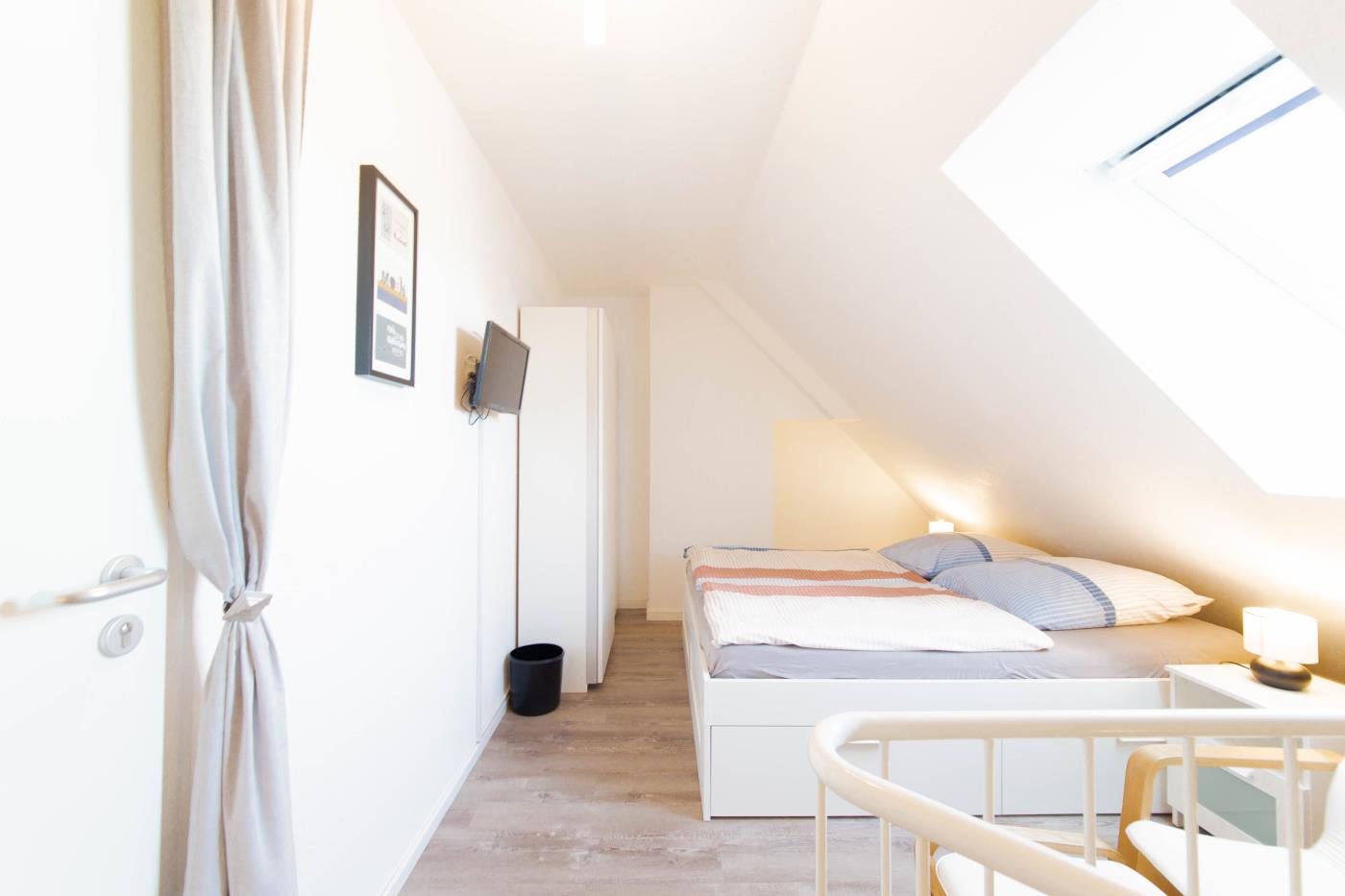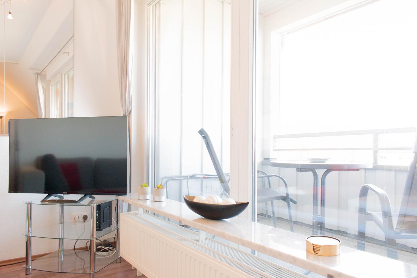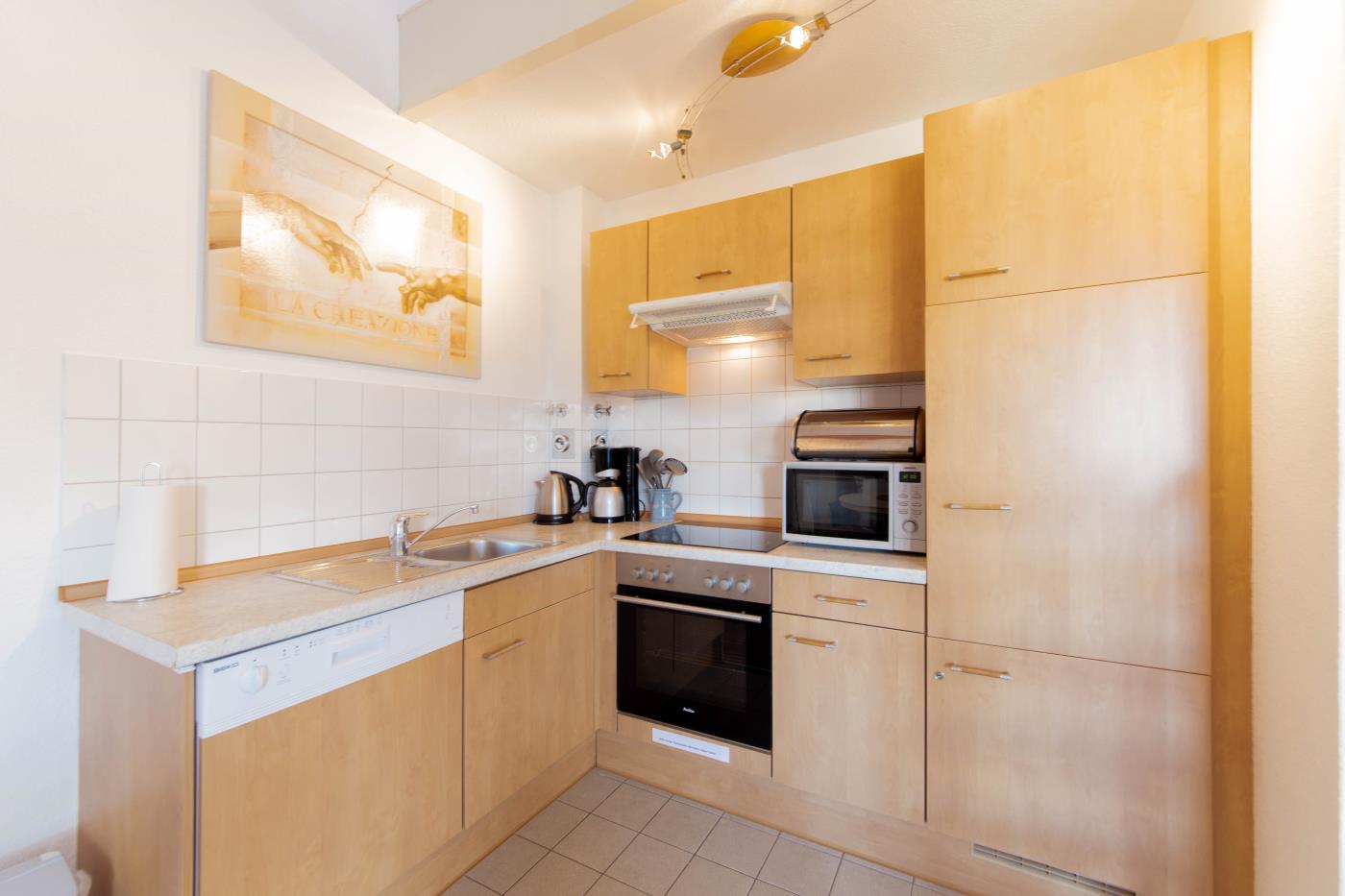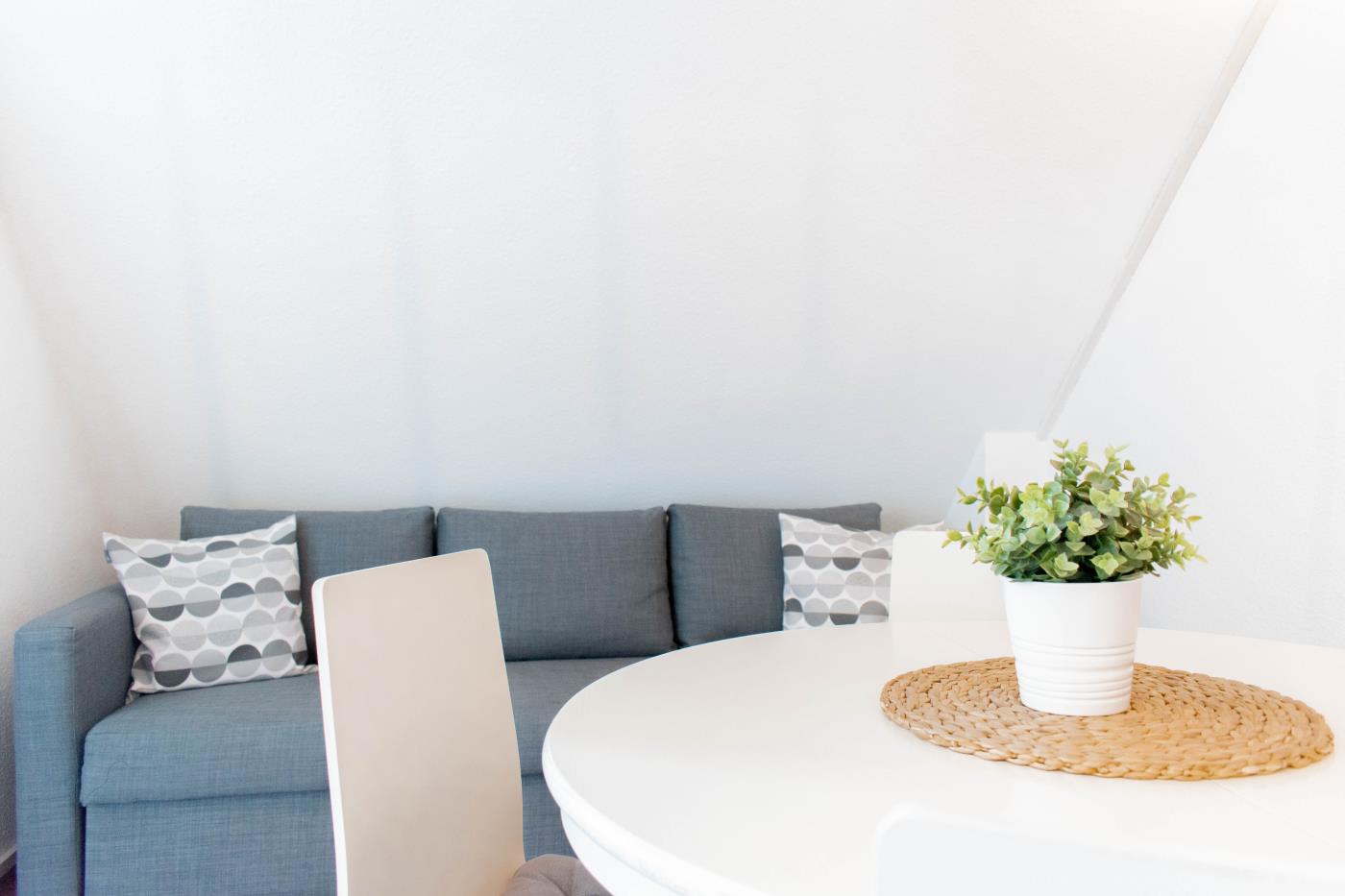 Anderthalb Zimmer mit Schlafbereich, Balkon und Küche bieten Platz für vier Gäste. Der eine Schlafbereich befindet sich auf einer offenen Empore und verfügt über ein gemütliches Doppelbett (1,80er Breite) und einem Kleiderschrank. Im Wohnbereich dient eine gemütliche Schlafcouch (1,40er Breite) als Schlafmöglichkeit. Die offene Küche ist komplett ausgestattet und lässt keine Wünsche offen. Vom Wohnzimmer aus erreicht man den überdachten Balkon mit seitlichem Meerblick, welcher zum Verweilen und Relaxen einlädt. Das Badezimmer verfügt über eine Dusche und ein WC. Desweiteren befindet sich im Appartement eine Waschmaschine, welche kostenfrei von dem Gast mitgenutzt werden kann. Elektrische Rollläden im unteren Bereich sorgen für einen angenehmen Schlafkomfort.