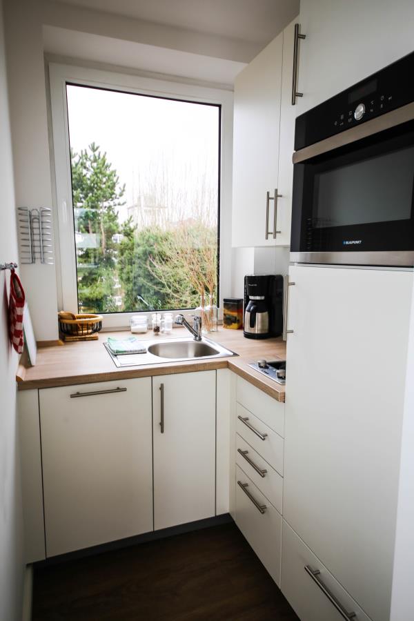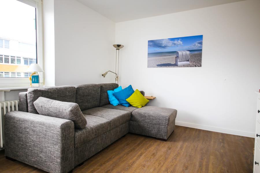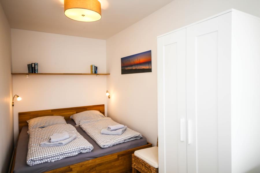 Zweizimmer mit separatem Schlafbereich, Balkon und eine offene Küche bieten Platz für vier Gäste. Das separate Schlafzimmer verfügt über ein bequemes Doppelbett (1,80er Breite) und einen Kleiderschrank mit viel Stauraum. Im Wohn- / Schlafbereich steht eine gemütliche Ausziehcouch (1,40 er Breite) zur Verfügung. Der möblierte Balkon mit Meerblick lädt zum Relaxen ein. Die Küche ist voll ausgestattet und lässt keine Wünsche offen.