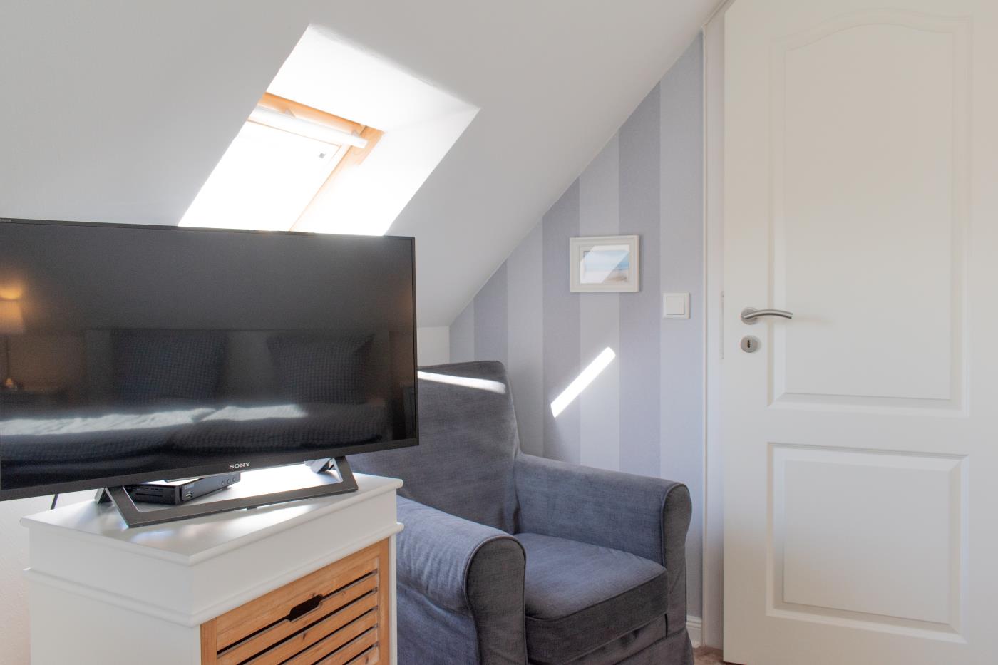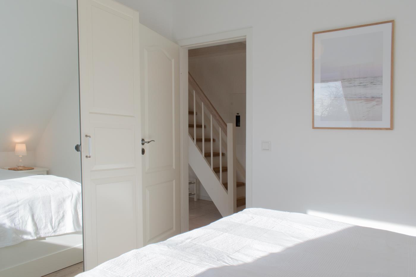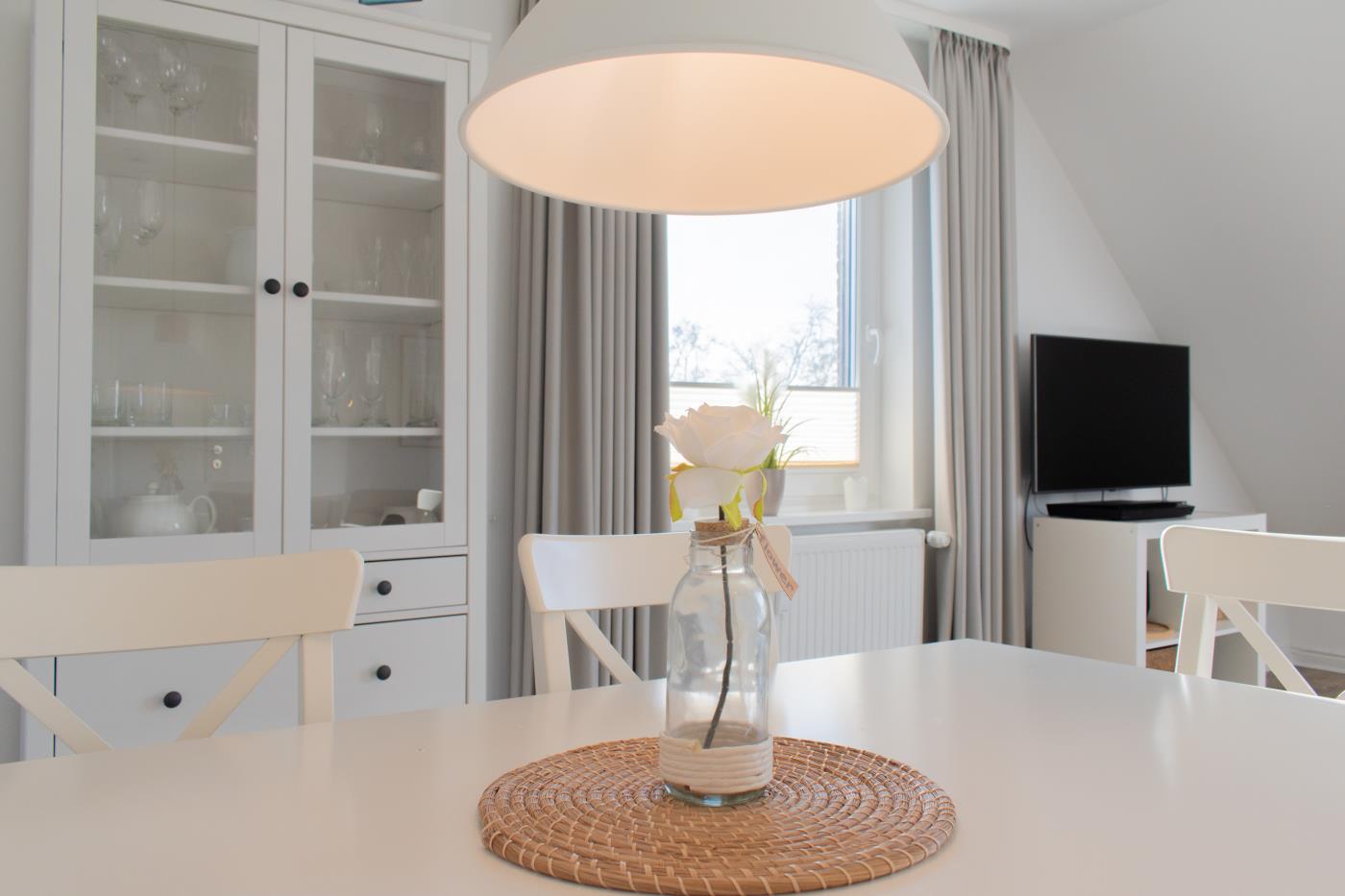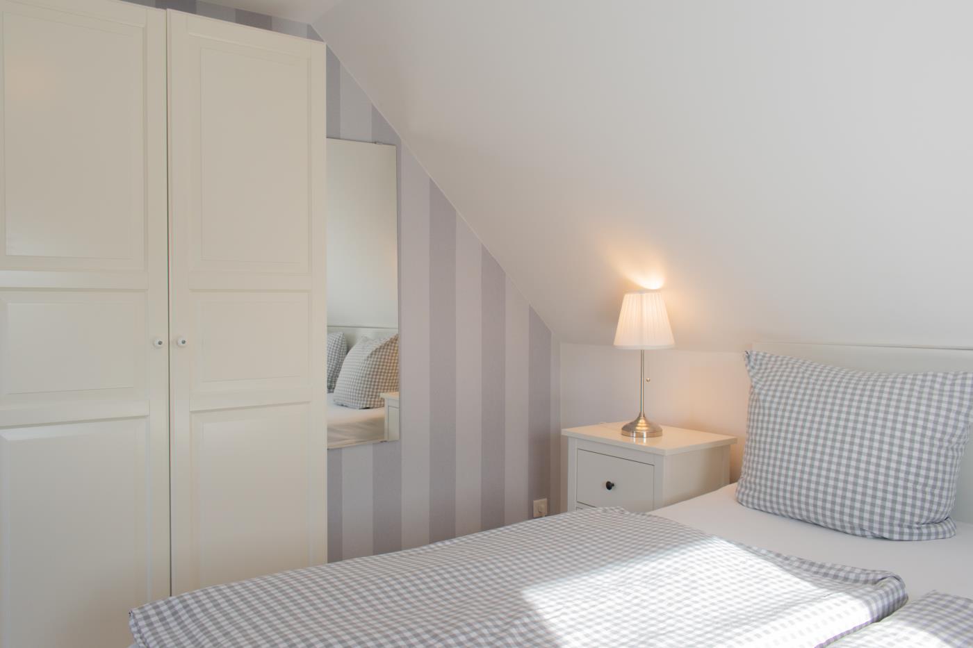 Drei Zimmer mit separaten Schlafbereichen, Duschbad und Küche bietet Platz für fünf Gäste. Das separate Schlafzimmer im Untergeschoss beinhaltet ein gemütliches Doppelbett (1,80er Breite) und einen Kleiderschrank. Der große und helle Wohn-Essbereich verfügt über zwei gemütliche Sofas, zwei Fußhocker und einem großen Esstisch, der ausziehbar ist und so Platz für bis zu sechs Personen bietet. Die Küche ist komplett ausgestattet und lässt keine Wünsche offen. Aus dem Eingangsflur gelangen Sie über eine Treppe (nicht für Gehbehinderte geeignet) in ein zweites, großes Schlafzimmer mit einem Doppelbett (1,80er Breite) und einem Einzelbett (0,90er Breite). Von hier aus haben Sie seitlichen Meerblick. Das Schlafzimmer ist durch eine Tür vom Treppenaufgang getrennt. Das Badezimmer verfügt über eine Dusche und ein WC. Eine Waschmaschine steht den Gästen im Appartement zur Verfügung.