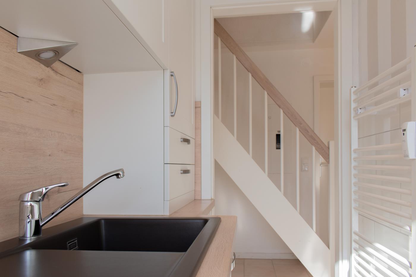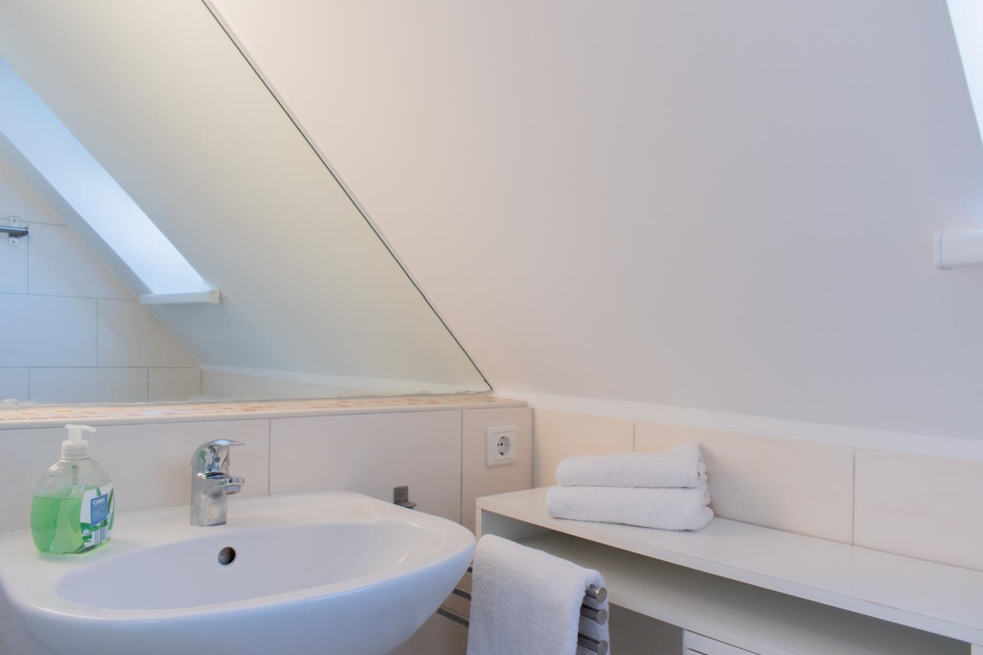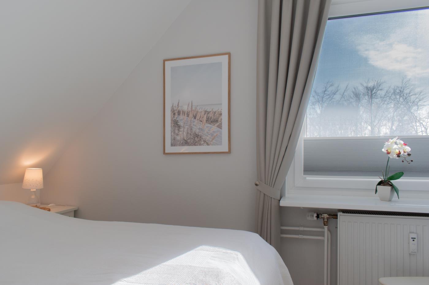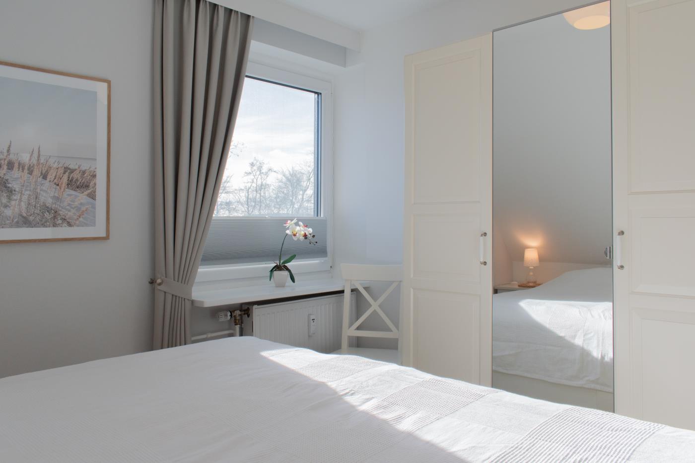 Drei Zimmer mit separaten Schlafbereichen, Duschbad und Küche bietet Platz für fünf Gäste. Das separate Schlafzimmer im Untergeschoss beinhaltet ein gemütliches Doppelbett (1,80er Breite) und einen Kleiderschrank. Der große und helle Wohn-Essbereich verfügt über zwei gemütliche Sofas, zwei Fußhocker und einem großen Esstisch, der ausziehbar ist und so Platz für bis zu sechs Personen bietet. Die Küche ist komplett ausgestattet und lässt keine Wünsche offen. Aus dem Eingangsflur gelangen Sie über eine Treppe (nicht für Gehbehinderte geeignet) in ein zweites, großes Schlafzimmer mit einem Doppelbett (1,80er Breite) und einem Einzelbett (0,90er Breite). Von hier aus haben Sie seitlichen Meerblick. Das Schlafzimmer ist durch eine Tür vom Treppenaufgang getrennt. Das Badezimmer verfügt über eine Dusche und ein WC. Eine Waschmaschine steht den Gästen im Appartement zur Verfügung.