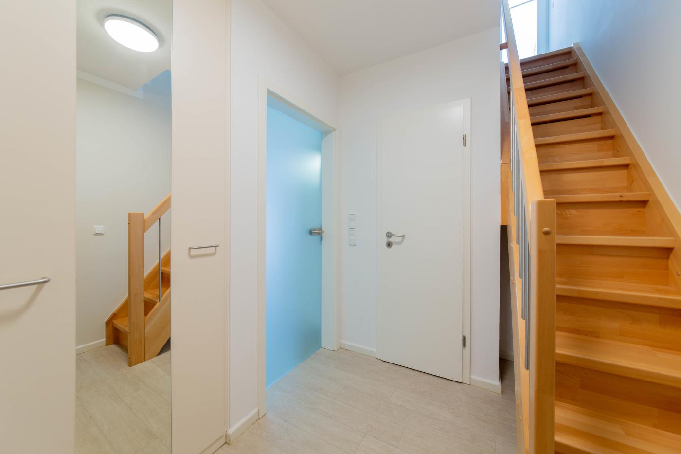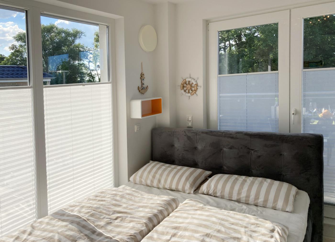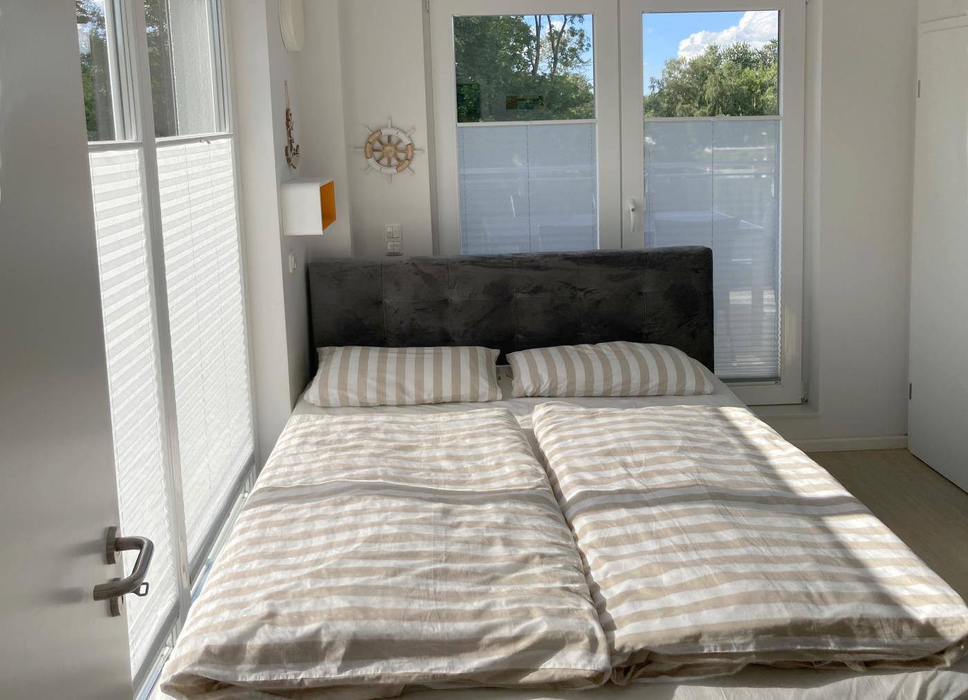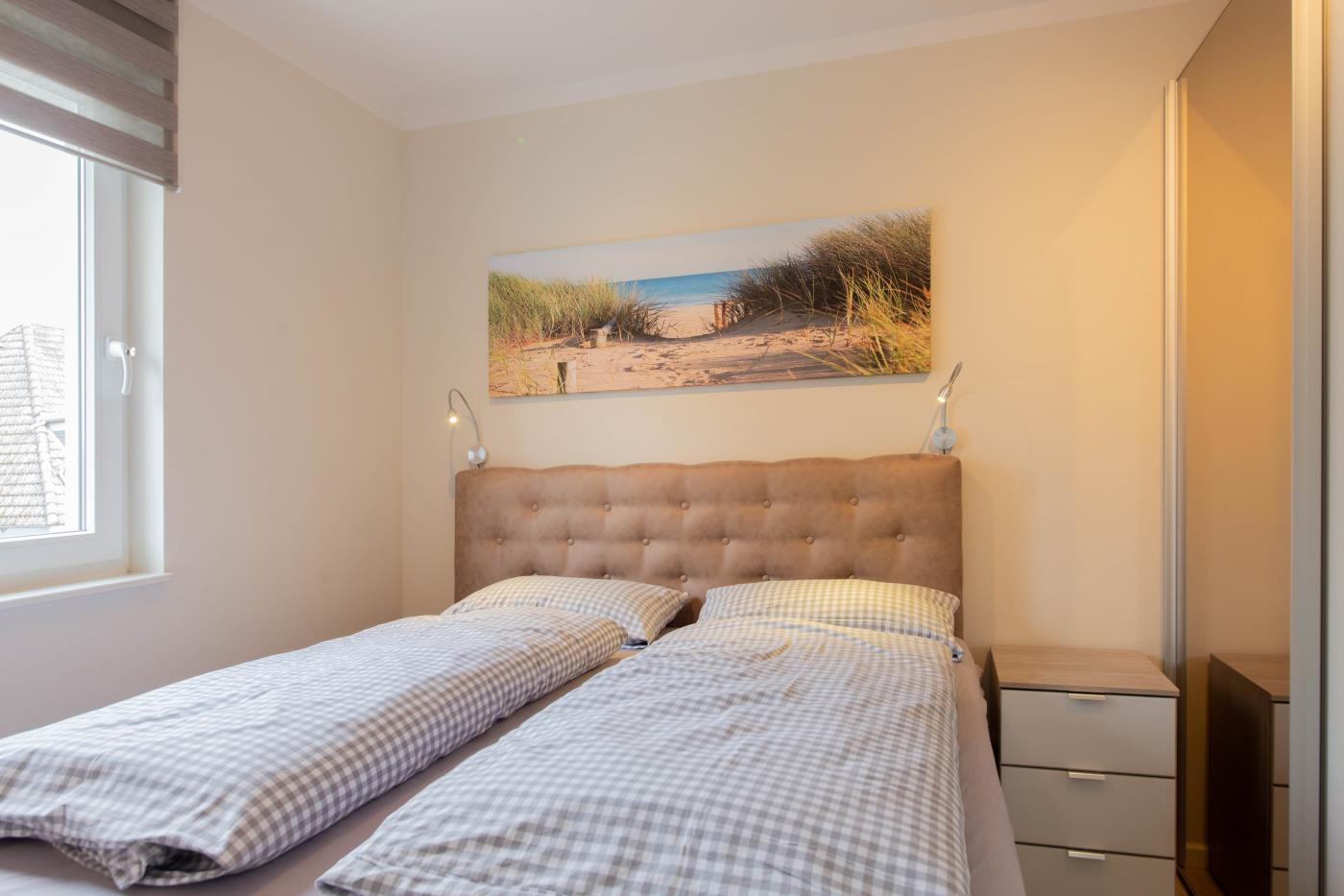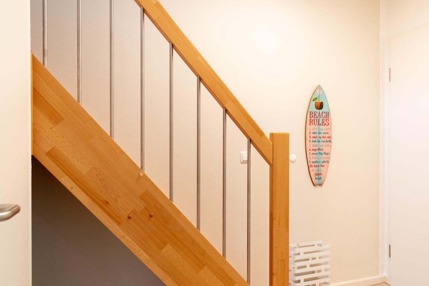 Die Dreizimmerwohnung mit einer Dachterrasse bietet Platz für fünf Gäste. Die Wohnfläche erstreckt sich über zwei Ebenen. Das separate Schlafzimmer im Obergeschoss beinhaltet ein gemütliches Boxspring-Doppelbett (1,60er Breite) und einen großen Kleiderschrank mit viel Stauraum. Ein separates Duschbad und eine großzügige, möblierte Dachterrasse runden die obere Ebene ab. Zudem gibt es einen eigenen weiteren Wohnungseingang auf dieser Etage, sodass das Gepäck einfach durch den großen Hausflur in den oberen Teil des Appartements transportiert werden kann. Auf der Dachterrasse befinden sich zwei Wellnessliegen und ein Essplatz. Im unteren Bereich befindet sich das Wohnzimmer mit einer weiteren Schlafmöglichkeit in Form einer komfortablen Ausziehcouch (1,30er Breite). Von dort aus gelangt man in das weitere Schlafzimmer mit einem gemütlichen Boxspringbett (1,60er Breite). Die offene Küche ist komplett ausgestattet und lässt keine Wünsche offen. Vom Wohnzimmer aus erreicht man den zweiten Balkon mit Sitzgelegenheiten. Auch auf der unteren Ebene befindet sich ein Badezimmer mit einer Dusche und einem WC. Ein Safe verwahrt Ihre Wertsachen sicher. Die gesamte Ferienwohnung hat elektrische Rollläden für einen entspannenden Schlafkomfort.