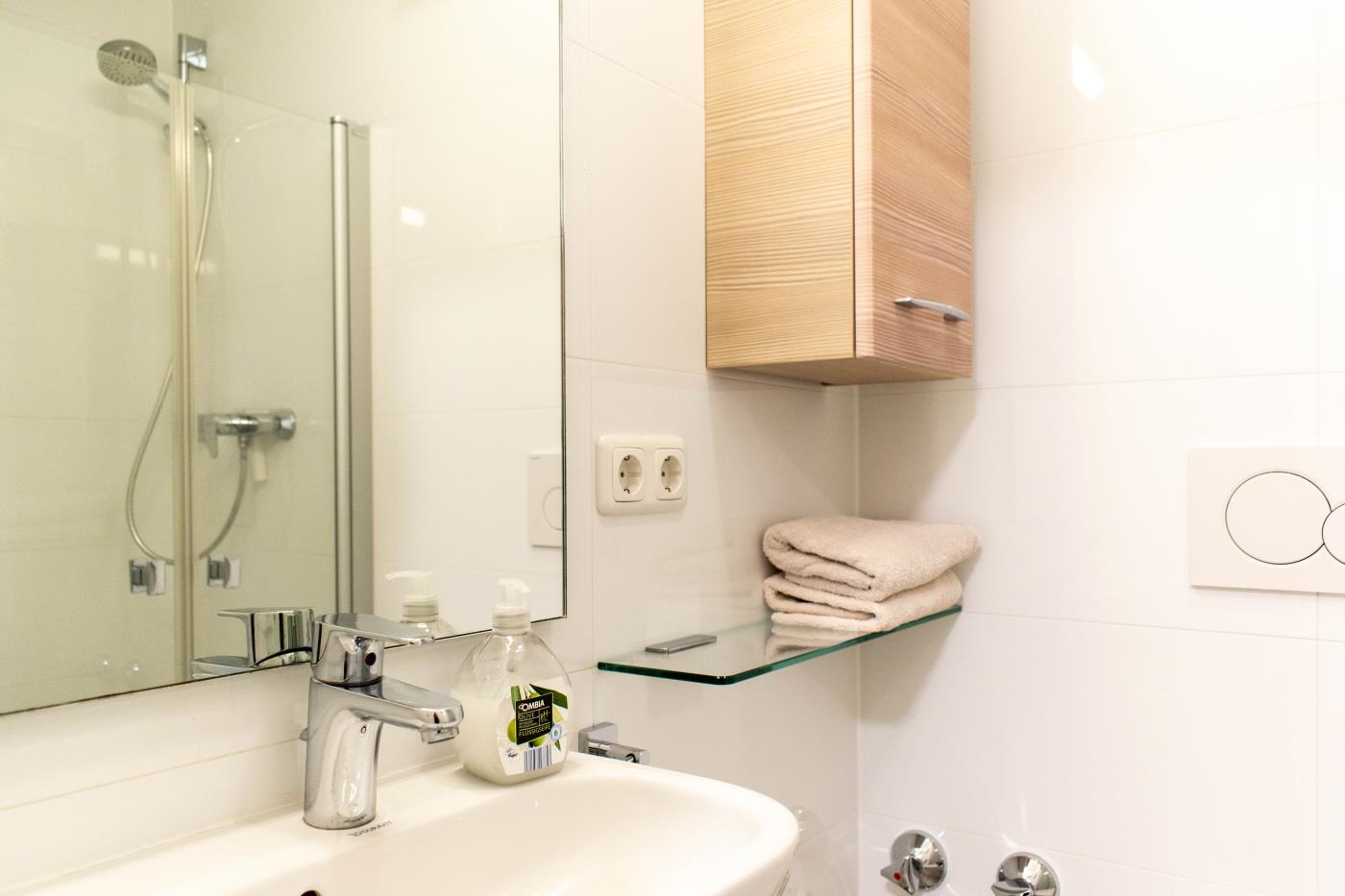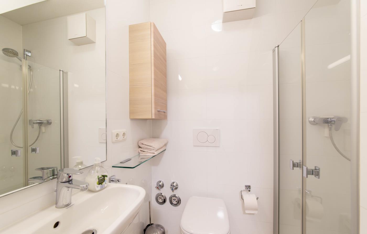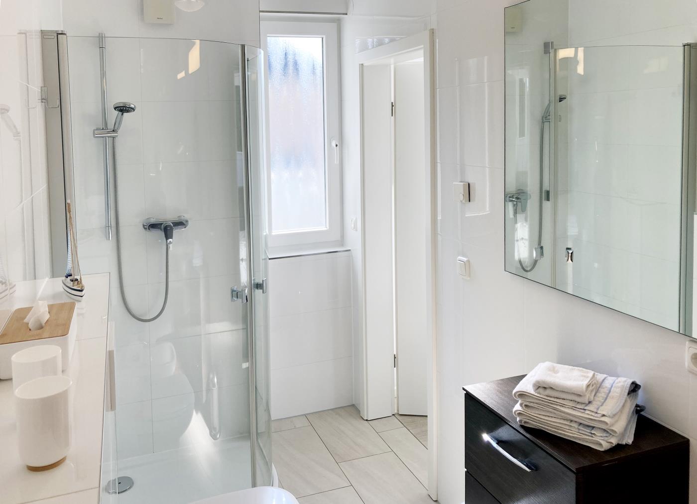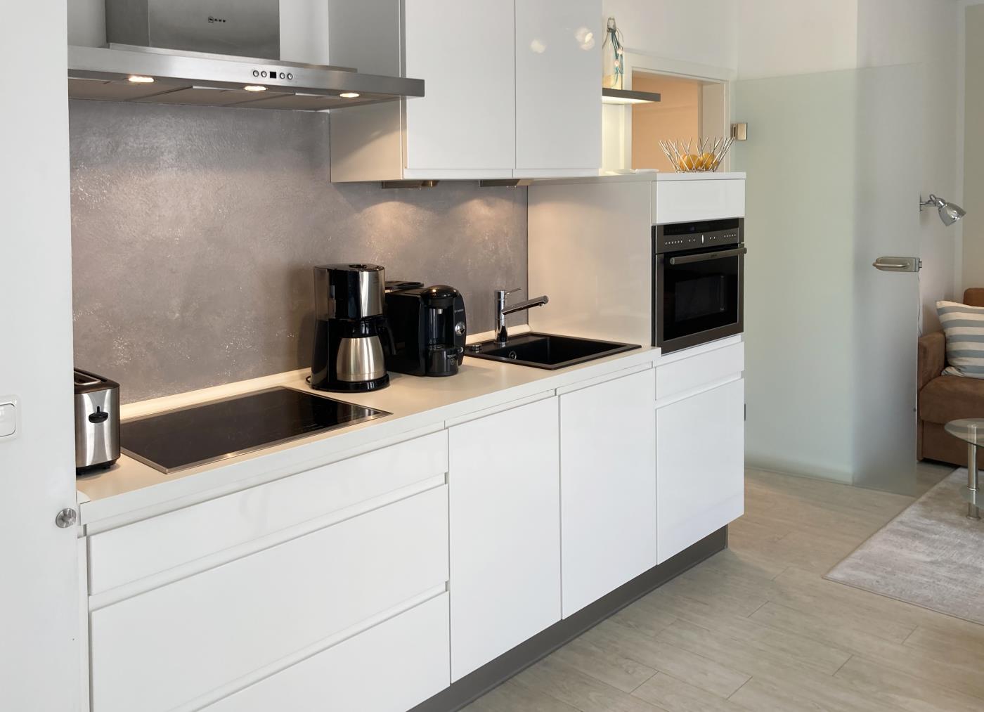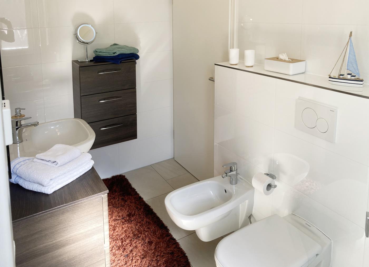 Die Dreizimmerwohnung mit einer Dachterrasse bietet Platz für fünf Gäste. Die Wohnfläche erstreckt sich über zwei Ebenen. Das separate Schlafzimmer im Obergeschoss beinhaltet ein gemütliches Boxspring-Doppelbett (1,60er Breite) und einen großen Kleiderschrank mit viel Stauraum. Ein separates Duschbad und eine großzügige, möblierte Dachterrasse runden die obere Ebene ab. Zudem gibt es einen eigenen weiteren Wohnungseingang auf dieser Etage, sodass das Gepäck einfach durch den großen Hausflur in den oberen Teil des Appartements transportiert werden kann. Auf der Dachterrasse befinden sich zwei Wellnessliegen und ein Essplatz. Im unteren Bereich befindet sich das Wohnzimmer mit einer weiteren Schlafmöglichkeit in Form einer komfortablen Ausziehcouch (1,30er Breite). Von dort aus gelangt man in das weitere Schlafzimmer mit einem gemütlichen Boxspringbett (1,60er Breite). Die offene Küche ist komplett ausgestattet und lässt keine Wünsche offen. Vom Wohnzimmer aus erreicht man den zweiten Balkon mit Sitzgelegenheiten. Auch auf der unteren Ebene befindet sich ein Badezimmer mit einer Dusche und einem WC. Ein Safe verwahrt Ihre Wertsachen sicher. Die gesamte Ferienwohnung hat elektrische Rollläden für einen entspannenden Schlafkomfort.