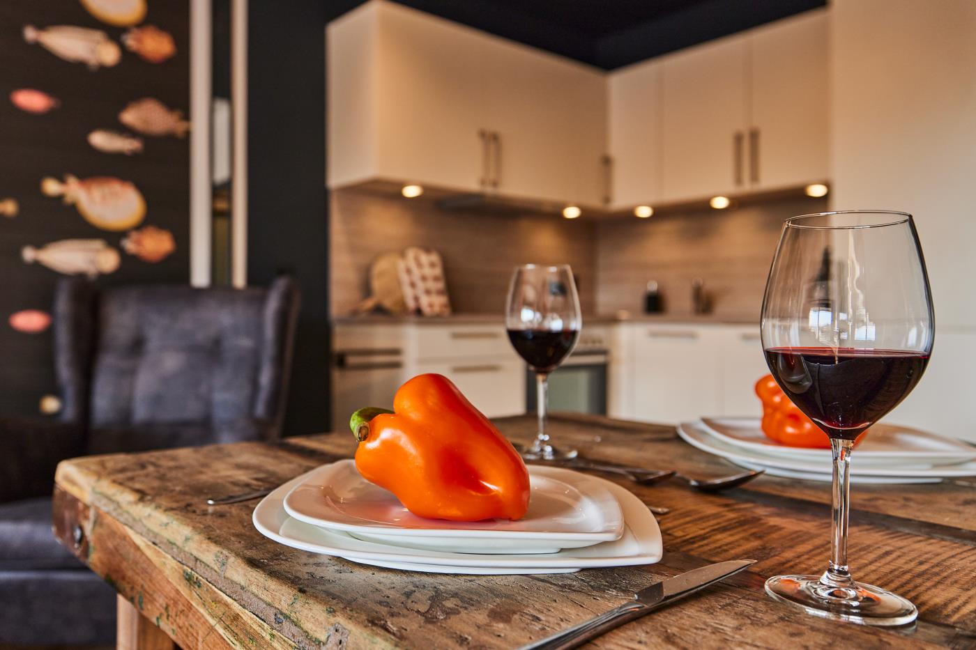 Drei Zimmer mit zwei separaten Schlafzimmern, Balkon und Küche bieten Platz für bis zu vier Feriengäste. Große Fenster im Wohnzimmer sorgen für eine helle und freundliche Atmosphäre. Das große Schlafzimmer ist mit einem Doppelbett (2 m Breite) und einem 55-Zoll-LED-TV ausgestattet. Angrenzend an das erste Schlafzimmer befindet sich der zweite, innenliegende Schlafbereich mit einem Etagenbett und einer geräumigen Garderobe. Das blickfangende Sofa im Wohnzimmer lädt zu gemeinsamen Abenden vor dem Fernseher ein. Für die Leseratten bietet sich der bequeme Ohrensessel an. So steht einem kuschligen Lesemarathon mit einem guten Buch nichts im Wege. Der Balkon verzückt mit seiner Westlage, wodurch Sie von hier traumhafte Sonnenuntergänge genießen dürfen. Die Küche ist mit allem ausgestattet, was im Urlaub benötigt wird. Das komplett sanierte Wohlfühl-Duschbad mit Design-Armaturen verfügt über eine bodentiefe Dusche, ein WC und einen modernen Handtuchheizkörper. Eine Waschmaschine und ein Trockner können gegen Gebühr im Haus mitgenutzt werden.