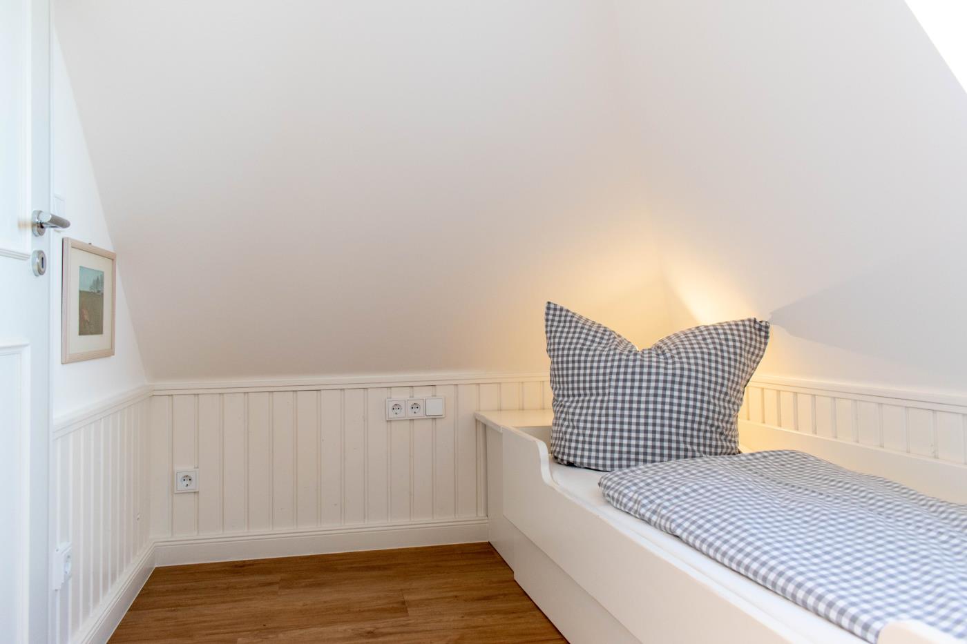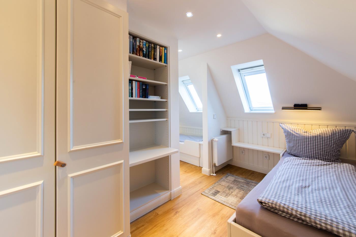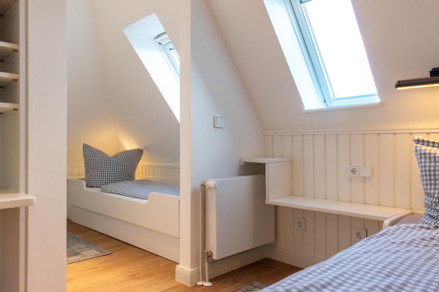 Drei Zimmer mit separaten Schlafbereichen, Balkon und Küche bietet Platz für fünf Gäste. Die Ferienwohnung verfügt über zwei Ebenen. In der unteren Ebene befindet sích der Wohnbereich, in dem eine gemütliche Ausziehcouch (1,60er Breite) als Schlafmöglichkeit dient. Von dort aus können Sie auf den möblierten Balkon mit tollem Meerblick gelangen. Die Küche ist komplett ausgestattet und lässt keine Wünsche offen. Des Weiteren befindet sich hier ein Gäste-WC. In der oberen Etage finden Sie das separate Schlafzimmer mit einem Doppelbett (1,80er Breite) und einem bequemen Einzelbetten (0,90er Breite). Das Einzelbett befindet sich im Durchgangszimmer zum Bad en Suite mit einer großen Dusche. Der Garten mit Sitzecke, Liegen und Kinderspielplatz steht Ihnen zur Mitnutzung zur Verfügung.