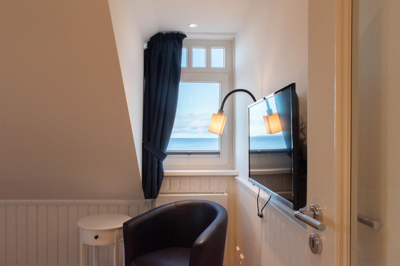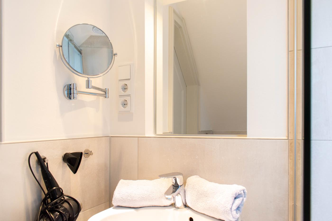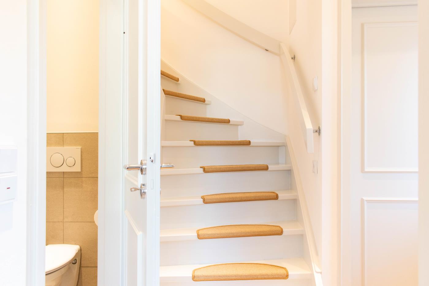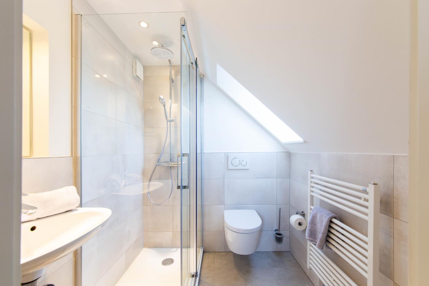 Drei Zimmer mit separaten Schlafbereichen, Balkon und Küche bietet Platz für fünf Gäste. Die Ferienwohnung verfügt über zwei Ebenen. In der unteren Ebene befindet sích der Wohnbereich, in dem eine gemütliche Ausziehcouch (1,60er Breite) als Schlafmöglichkeit dient. Von dort aus können Sie auf den möblierten Balkon mit tollem Meerblick gelangen. Die Küche ist komplett ausgestattet und lässt keine Wünsche offen. Des Weiteren befindet sich hier ein Gäste-WC. In der oberen Etage finden Sie das separate Schlafzimmer mit einem Doppelbett (1,80er Breite) und einem bequemen Einzelbetten (0,90er Breite). Das Einzelbett befindet sich im Durchgangszimmer zum Bad en Suite mit einer großen Dusche. Der Garten mit Sitzecke, Liegen und Kinderspielplatz steht Ihnen zur Mitnutzung zur Verfügung.