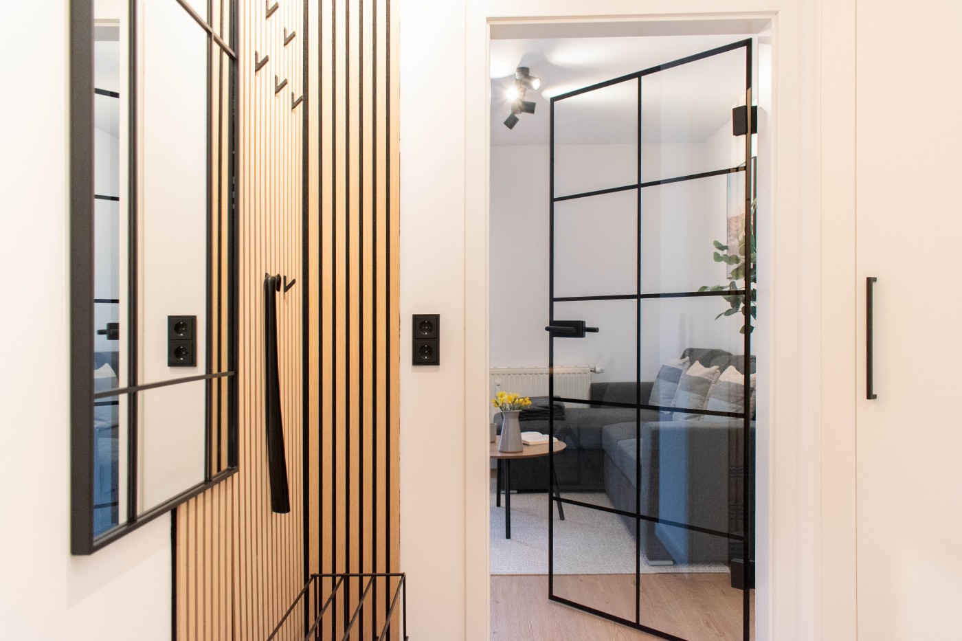 Die Formen der stylischen Einrichtung sind schlicht, das Design ist geradlinig und klar, das Farbschema ist angenehm und unaufgeregt. Es wurden natürliche Materialien und viel Holz verwendet, moderne Grau- und Schwarztöne kreieren eine beruhigende Atmosphäre.
