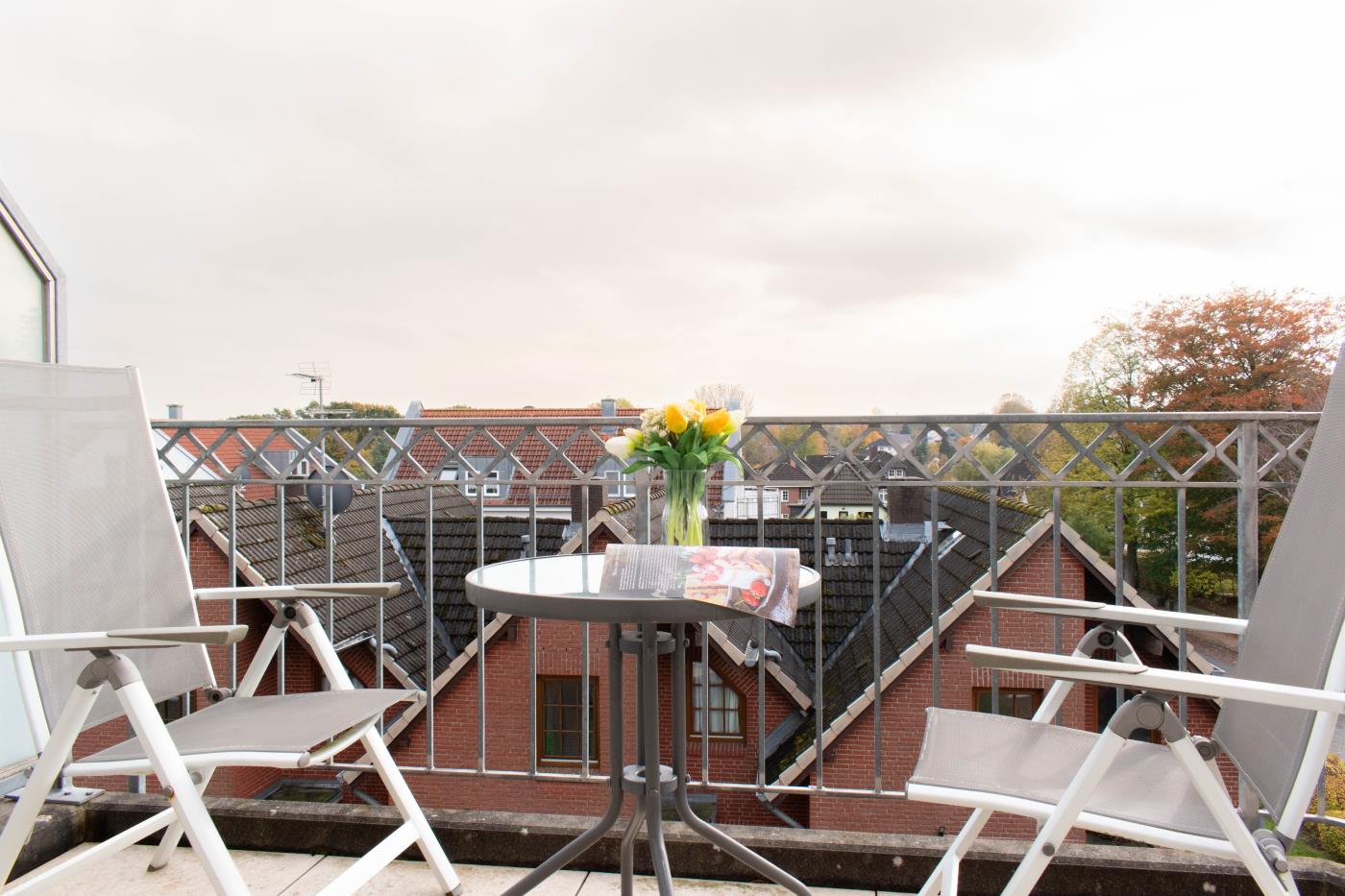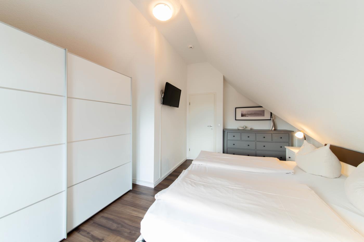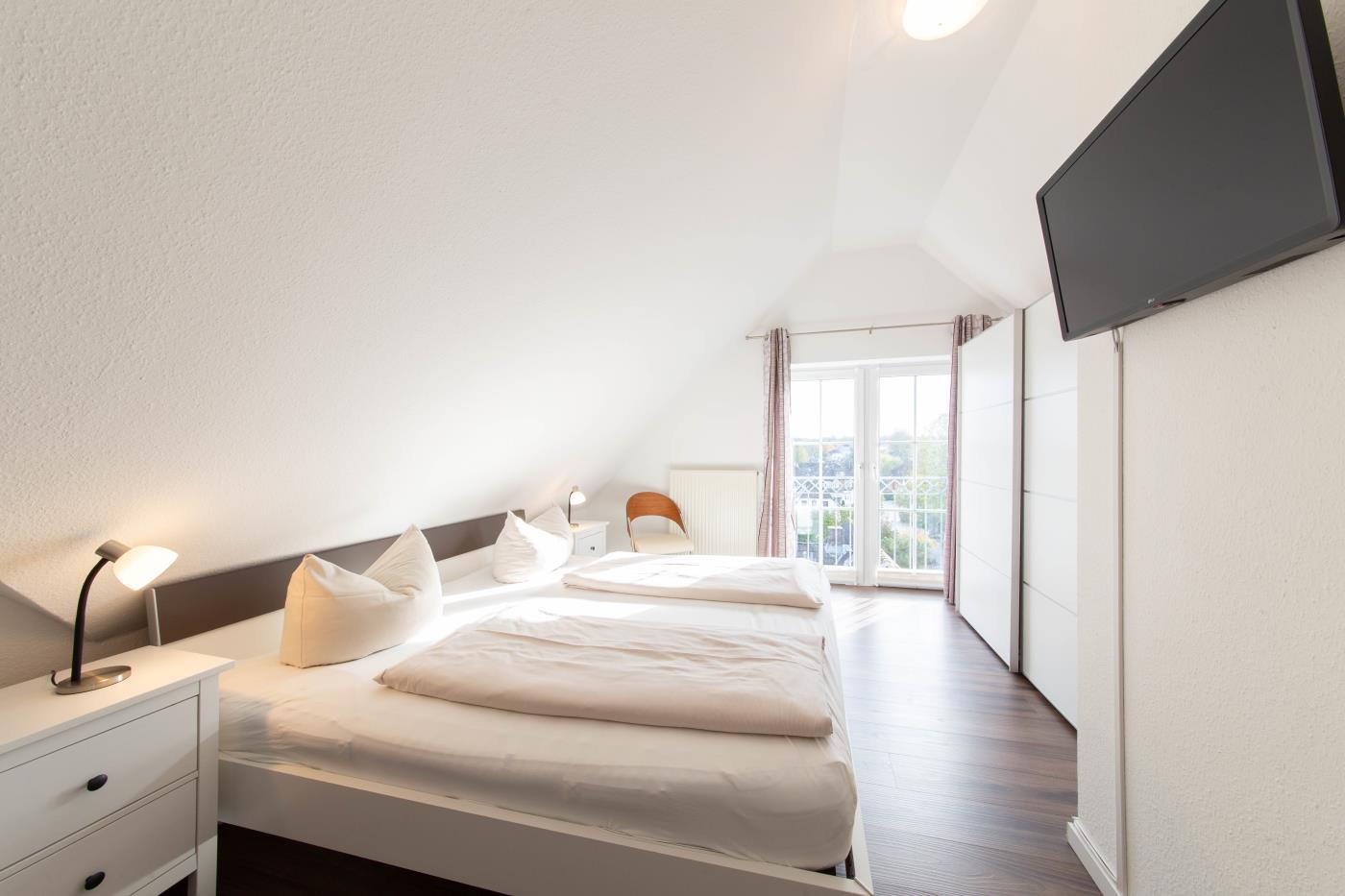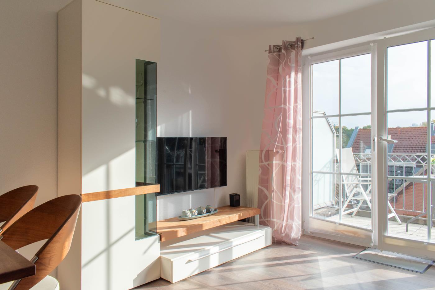 Die Maisonettewohnung verfügt über drei Zimmer, ein Vollbad und ein Gäste-WC. Im unteren Stockwerk erwartet Sie ein geräumiger Wohnbereich mit einem gemütlichen Sofa. Der Flat TV lässt Sie auch im Urlaub keine Folge Ihrer Lieblingsserie verpassen. Durch die bodentiefen Fenster erreichen Sie einen nach Süden ausgerichteten Balkon. Perfekt für das gemeinsame Mittagessen an der frischen Luft! In den Wohnbereich integriert, steht Ihnen eine vollausgestattete Küche zur Verfügung. Das Badezimmer dieser Etage hat eine großzügige Walk-In-Dusche. In der oberen Etage finden Sie ein Schlafzimmer mit einem sehr großen Doppelbett (2 Meter Breite) und einen weiteren Flat-TV vor. Das zweite Schlafzimmer bietet Ihnen zwei Einzelbetten. Hier können Sie nicht nur lustige Game-Duelle auf der PS3 genießen, sondern Sie erhaschen auch einen Blick auf die schöne Ostsee. Des Weiteren befindet sich hier das Gäste-WC.