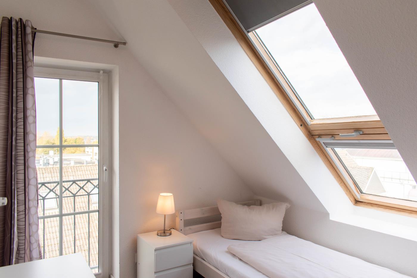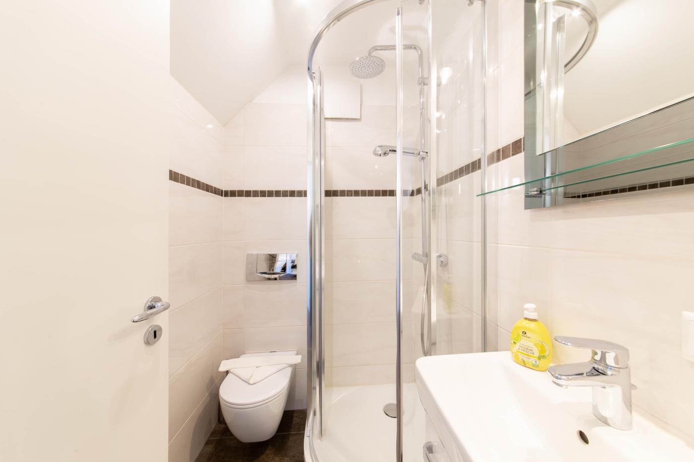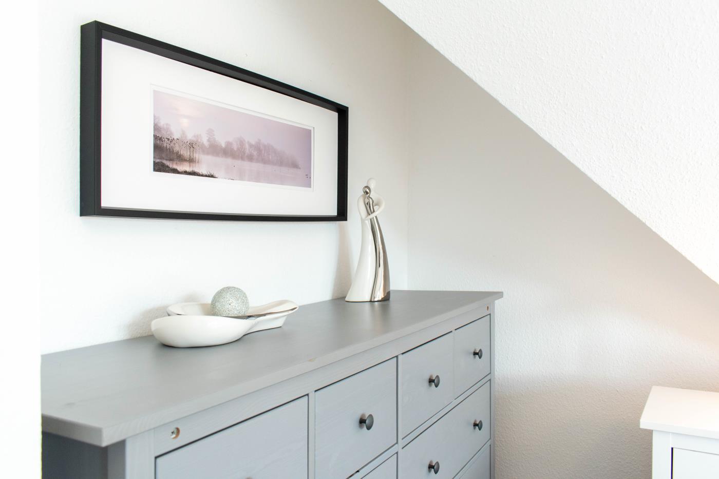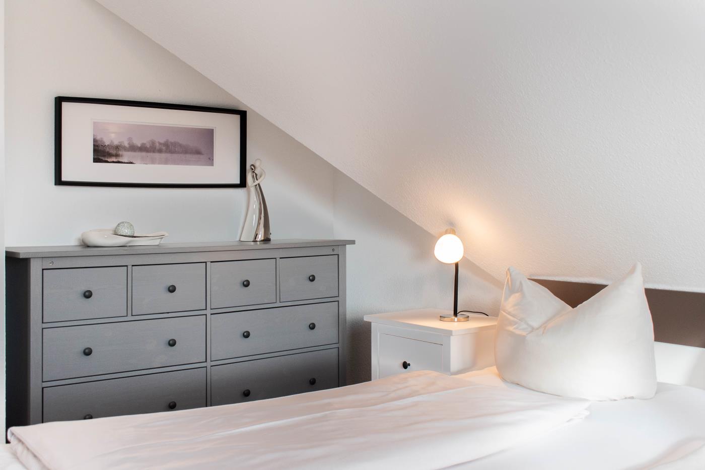 Die Maisonettewohnung verfügt über drei Zimmer, ein Vollbad und ein Gäste-WC. Im unteren Stockwerk erwartet Sie ein geräumiger Wohnbereich mit einem gemütlichen Sofa. Der Flat TV lässt Sie auch im Urlaub keine Folge Ihrer Lieblingsserie verpassen. Durch die bodentiefen Fenster erreichen Sie einen nach Süden ausgerichteten Balkon. Perfekt für das gemeinsame Mittagessen an der frischen Luft! In den Wohnbereich integriert, steht Ihnen eine vollausgestattete Küche zur Verfügung. Das Badezimmer dieser Etage hat eine großzügige Walk-In-Dusche. In der oberen Etage finden Sie ein Schlafzimmer mit einem sehr großen Doppelbett (2 Meter Breite) und einen weiteren Flat-TV vor. Das zweite Schlafzimmer bietet Ihnen zwei Einzelbetten. Hier können Sie nicht nur lustige Game-Duelle auf der PS3 genießen, sondern Sie erhaschen auch einen Blick auf die schöne Ostsee. Des Weiteren befindet sich hier das Gäste-WC.