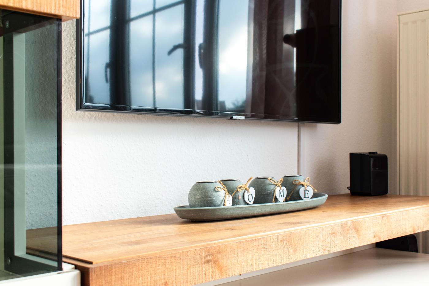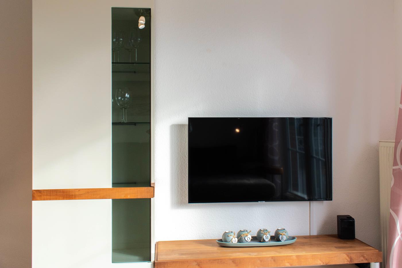 Egal ob Romanze oder lieber zocken. In dieser Ferienwohnung kommen alle auf Ihre Kosten. Flat-TVs stehen Ihnen in dem Wohnzimmer, sowie in den beiden Schlafzimmern zur Verfügung. Ein WLAN Zugang ist ebenfalls vorhanden.