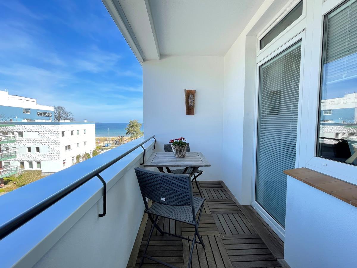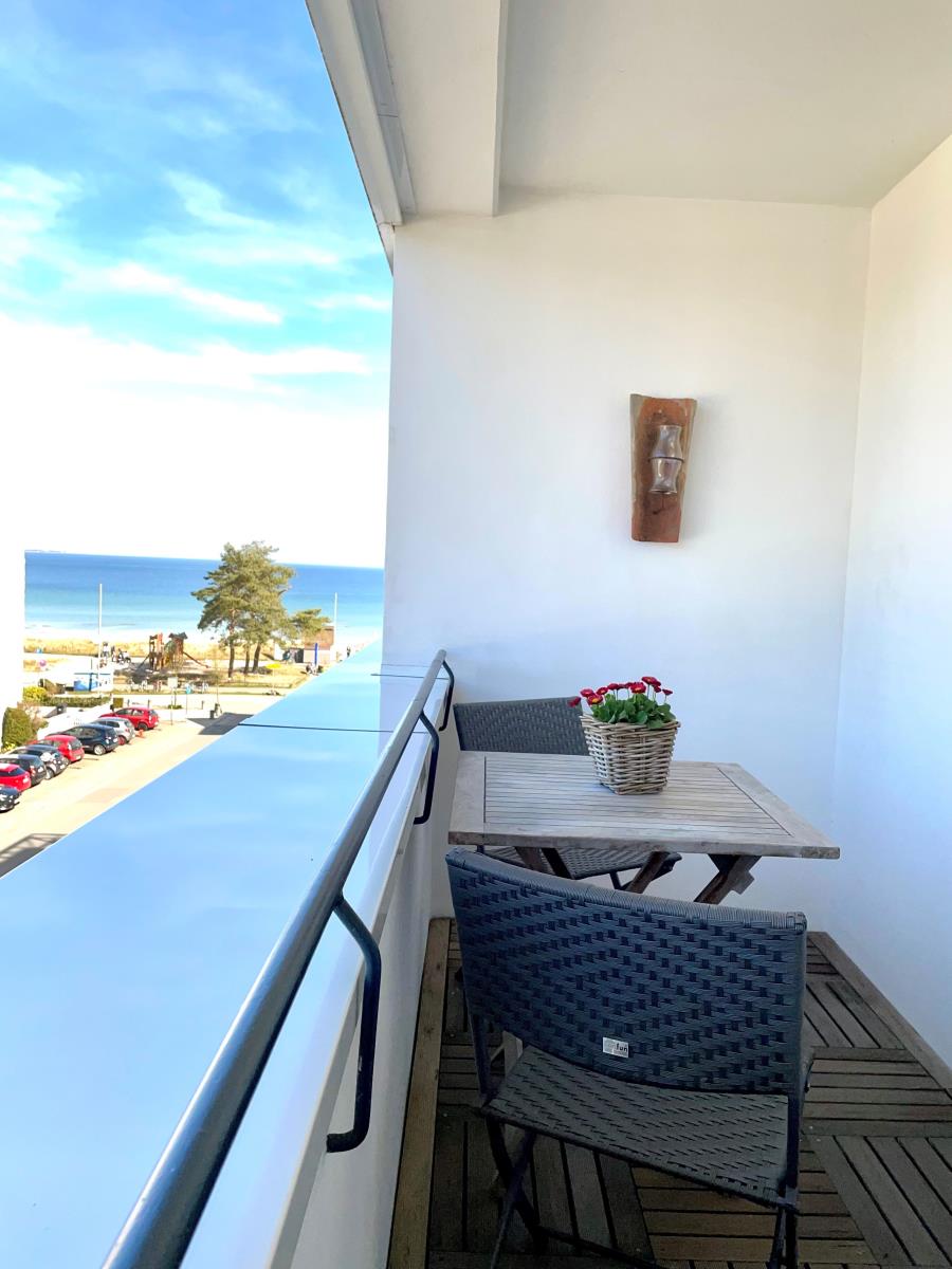 Direkte Strandlage und Teilmeerblick vom Balkon auf die Ostsee.
