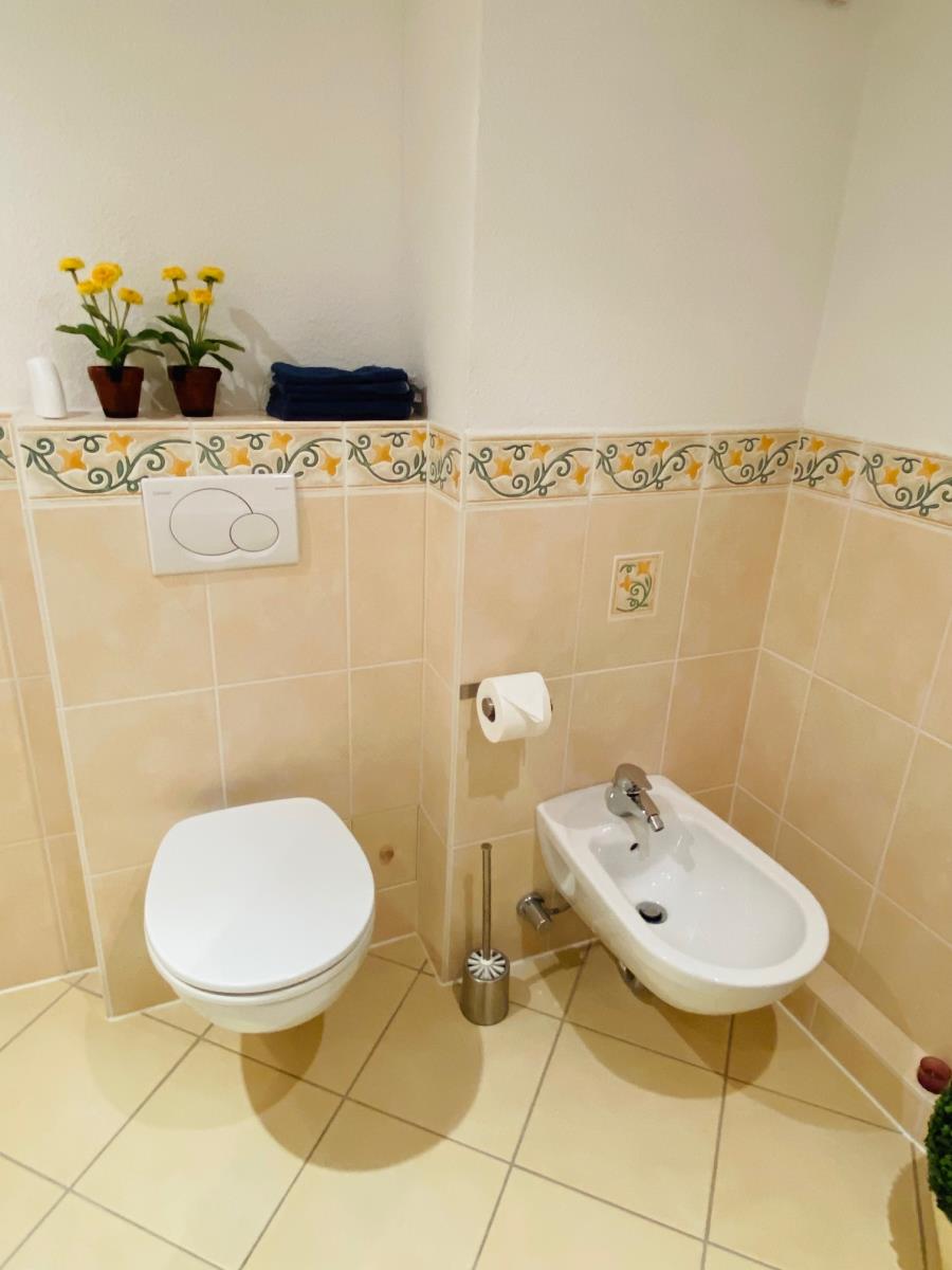 Das moderne Bad ist mit einer Dusche, WC, BD, Waschbecken und Handtuchheizkörper ausgestattet.
