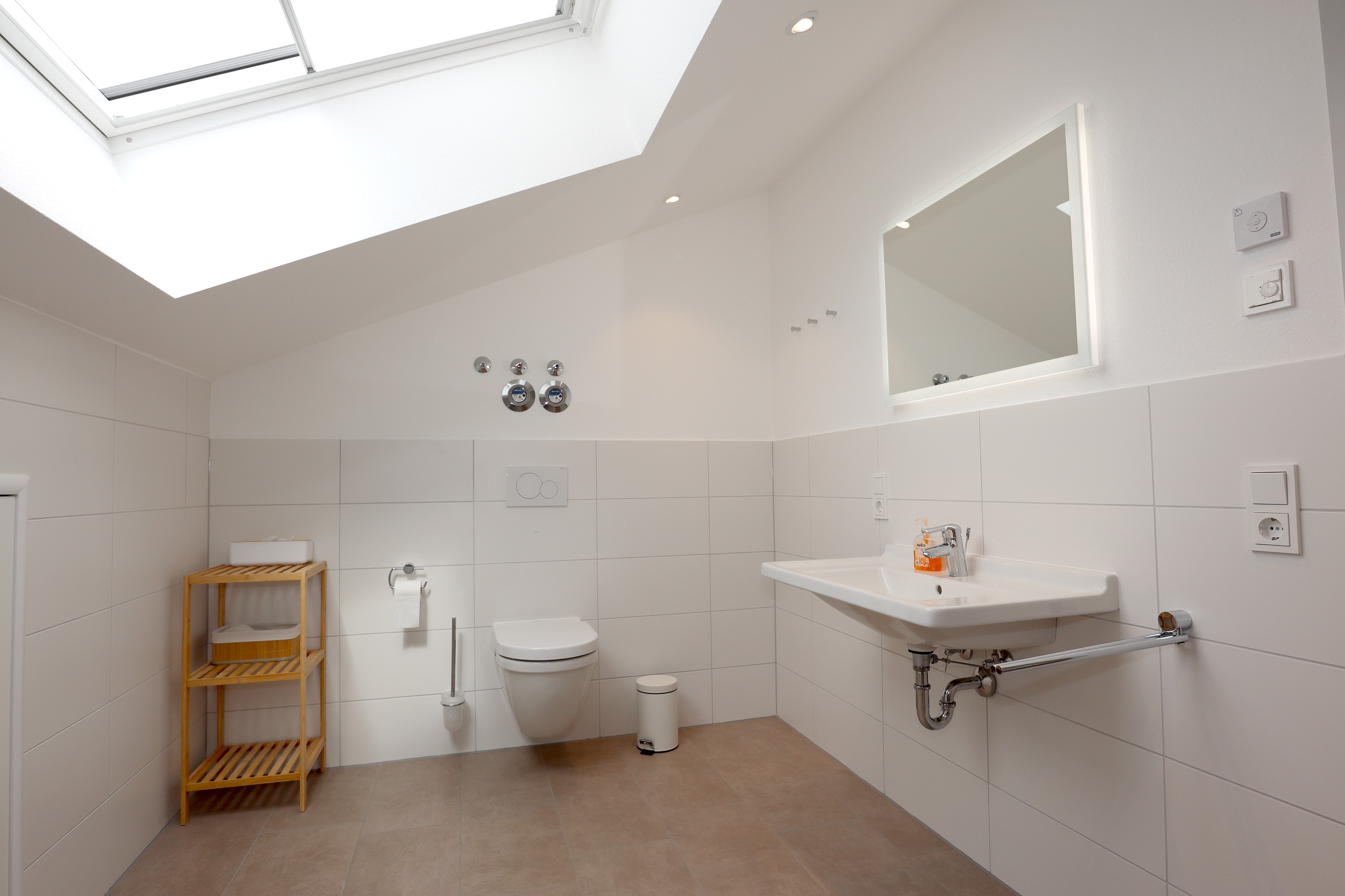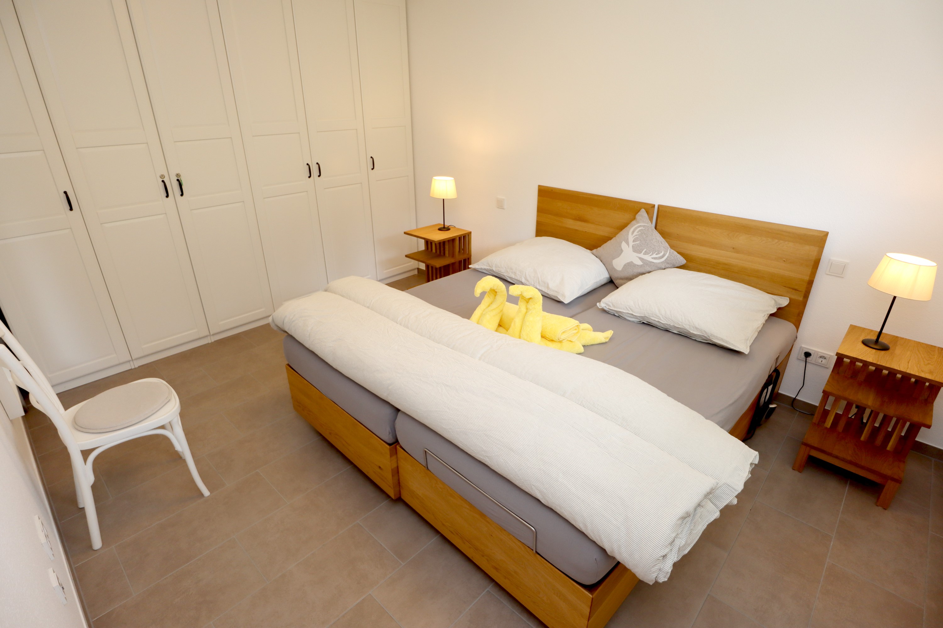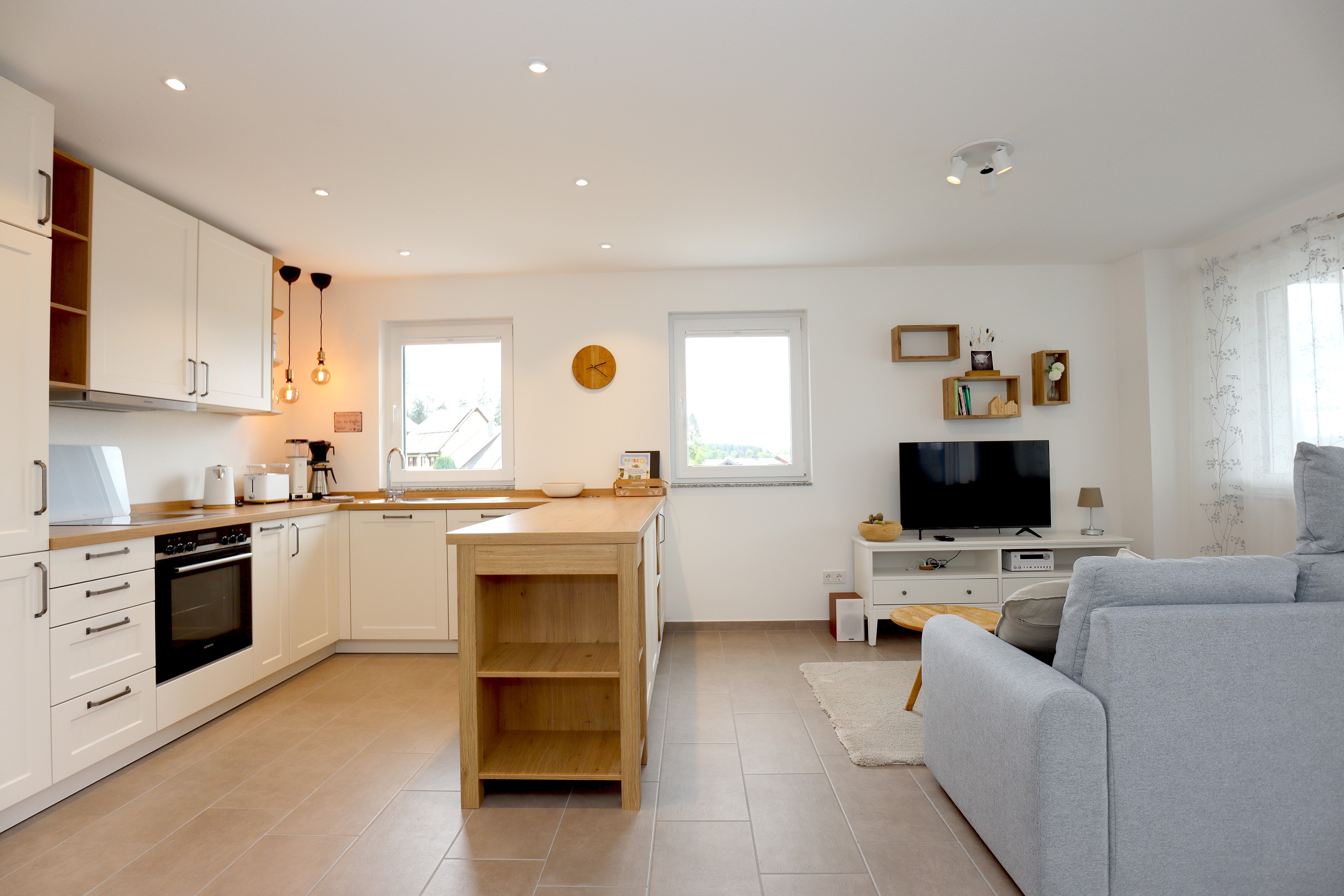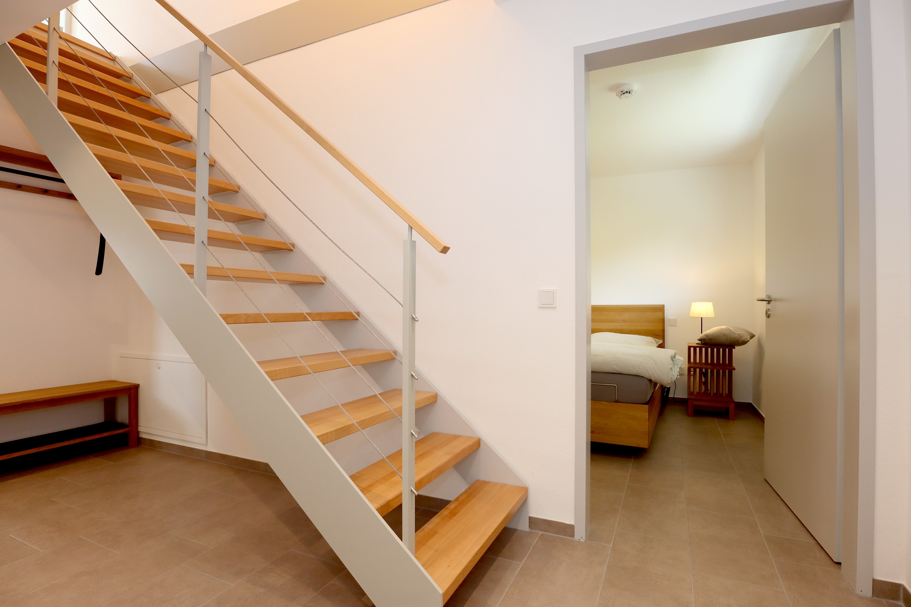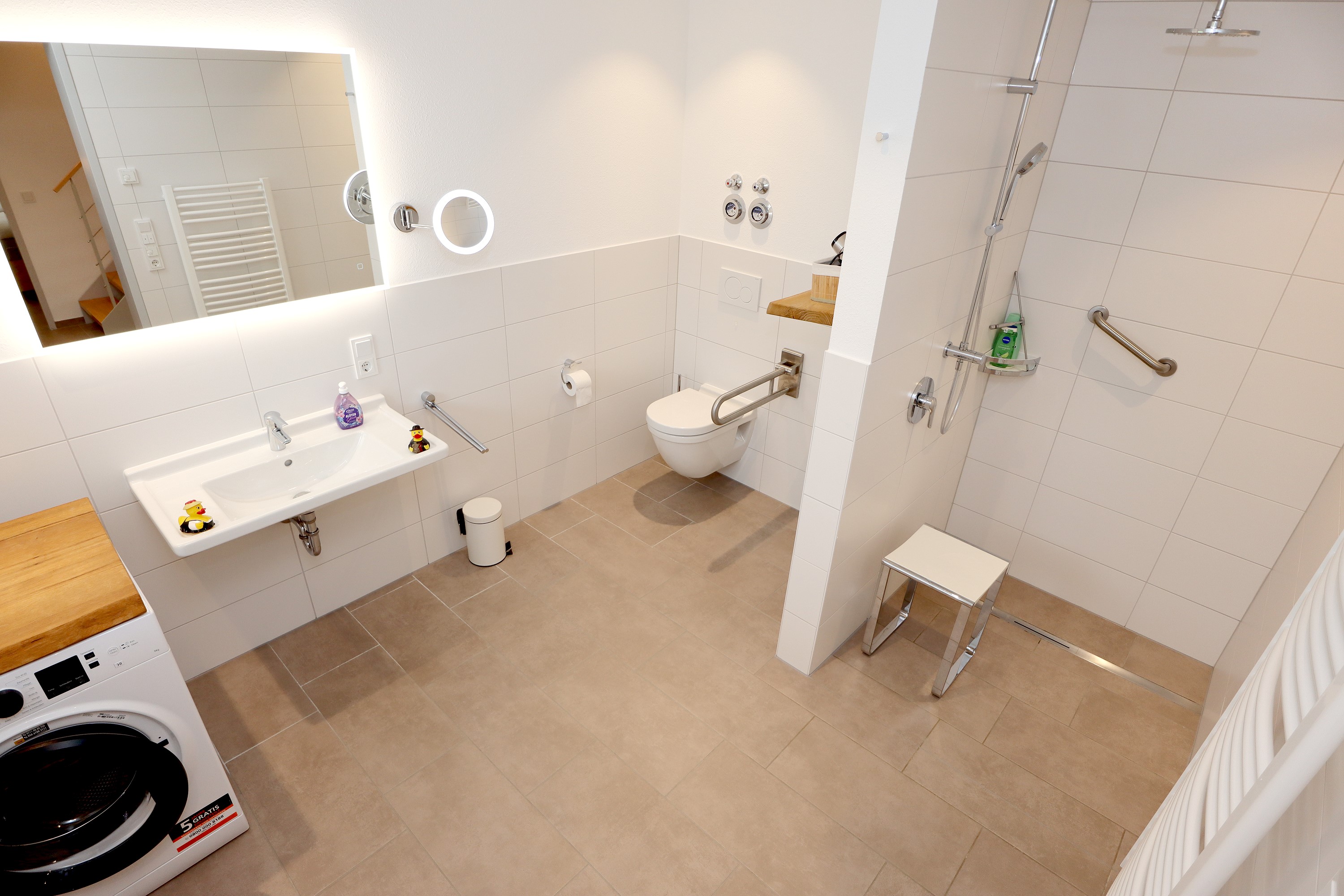 Großes Wohnzimmer mit Schlafsofa, TV und Stereoanlage Essbereich für vier Personen Voll ausgestattete Küche mit Ceranfeld, Backofen, Spülmaschine, Kühlschrank, Kaffeemaschine, Espressokocher und weiteren Extras Schlafzimmer mit höhenverstellbarem Komfortbett (Einzel- oder Doppelbett möglich) Modernes, barrierefreies Badezimmer mit Regendusche und Waschmaschine Stockwerk mit extra Zimmer, Bad mit Badewanne, Sofa und DachterrasseUmgebung