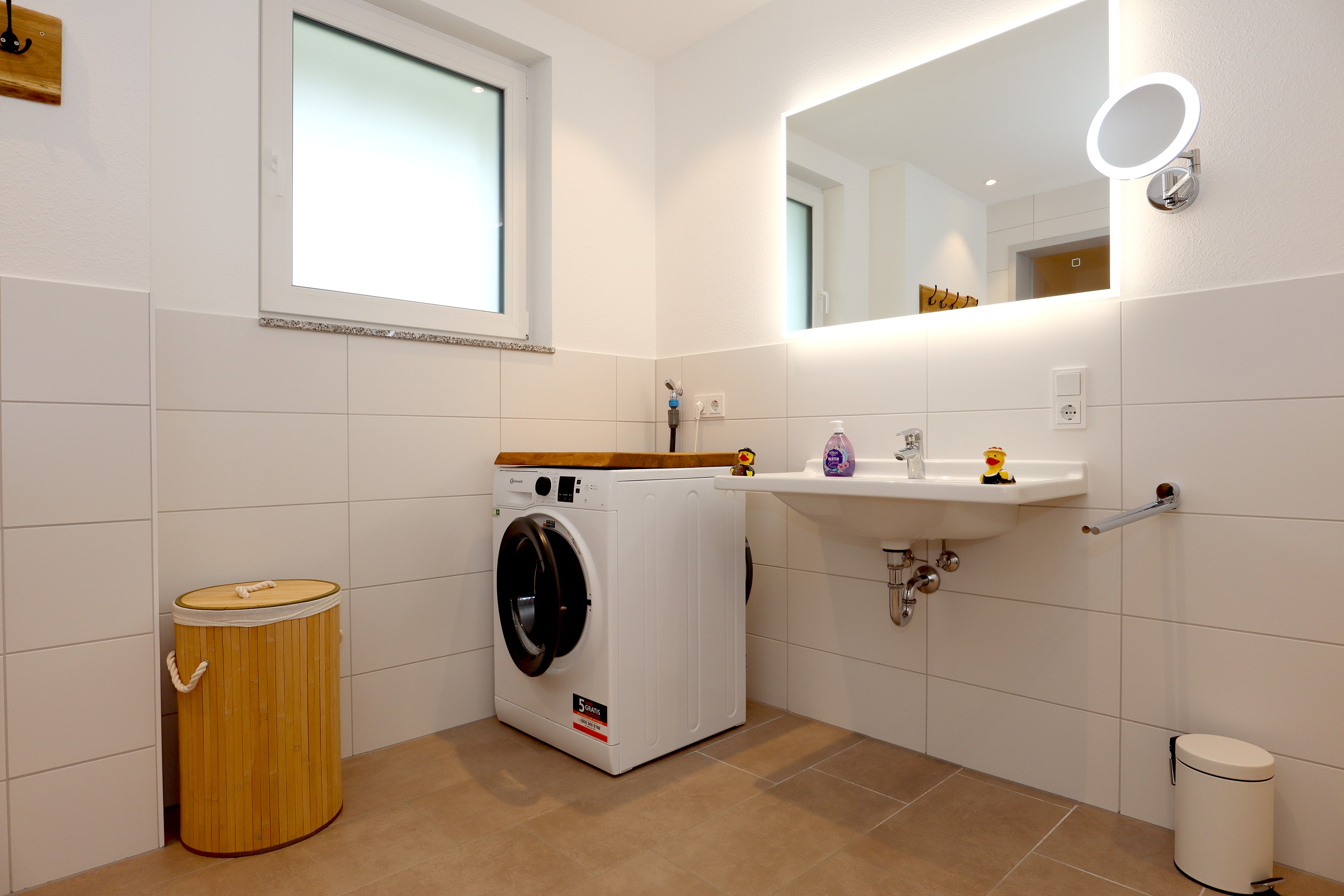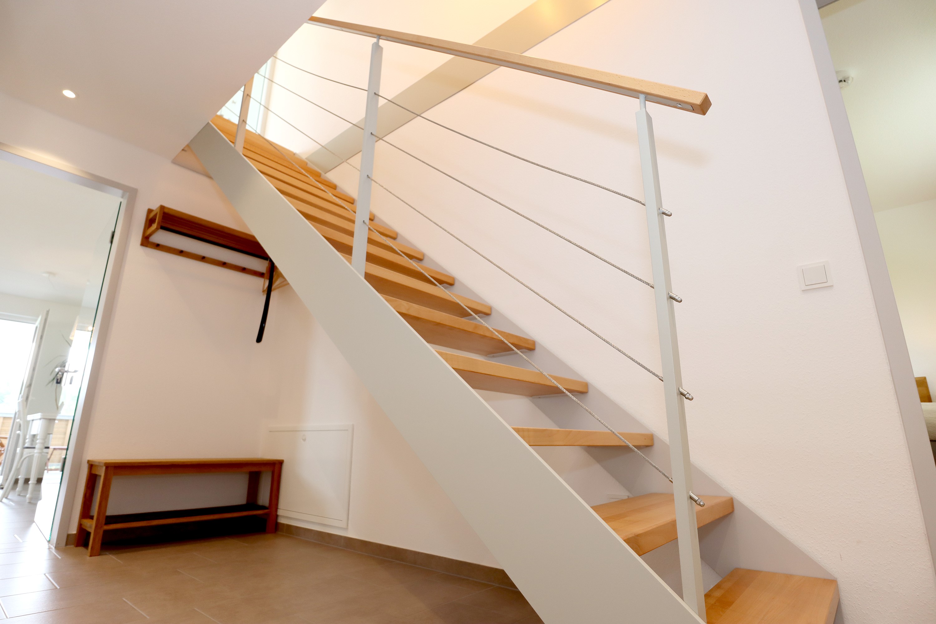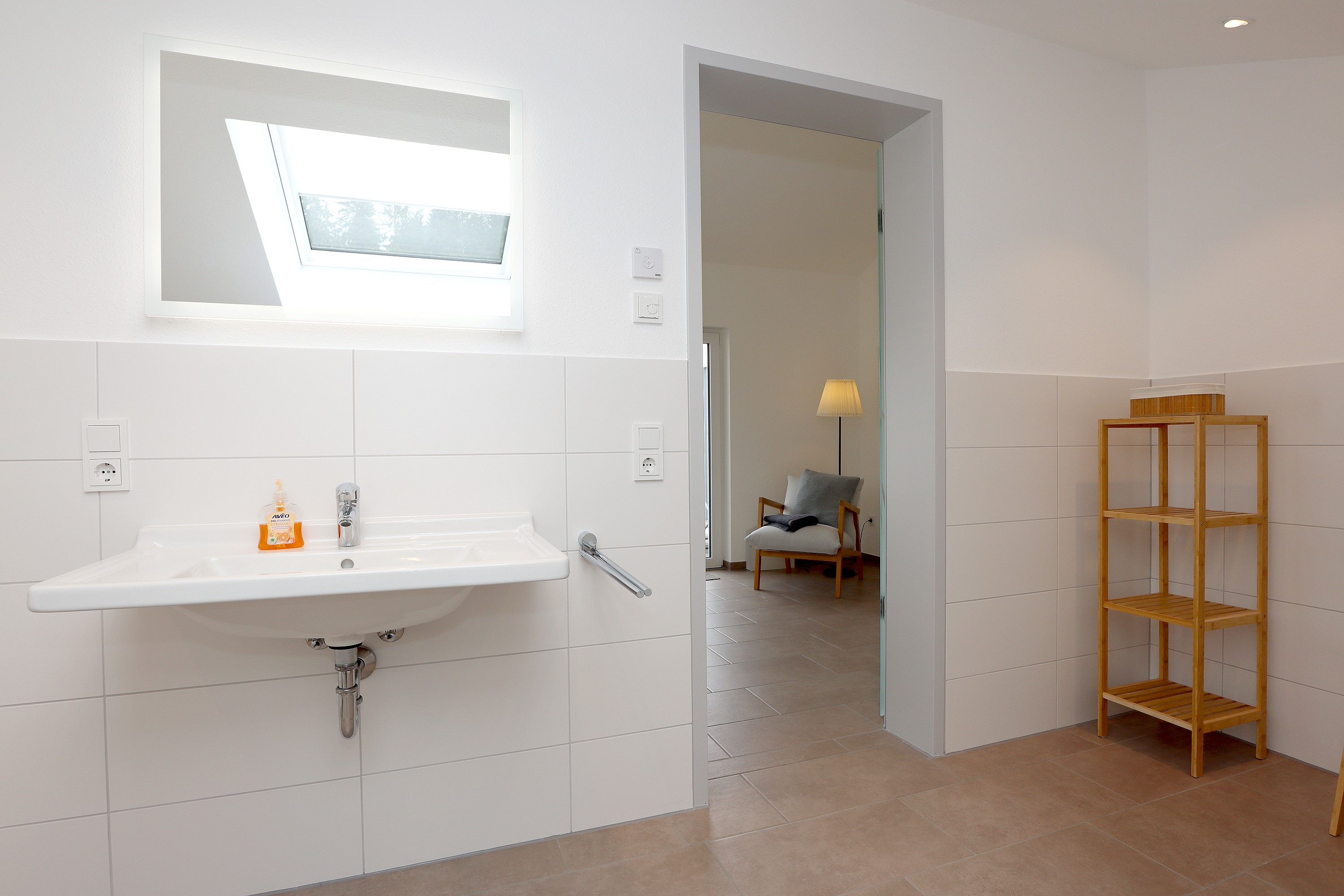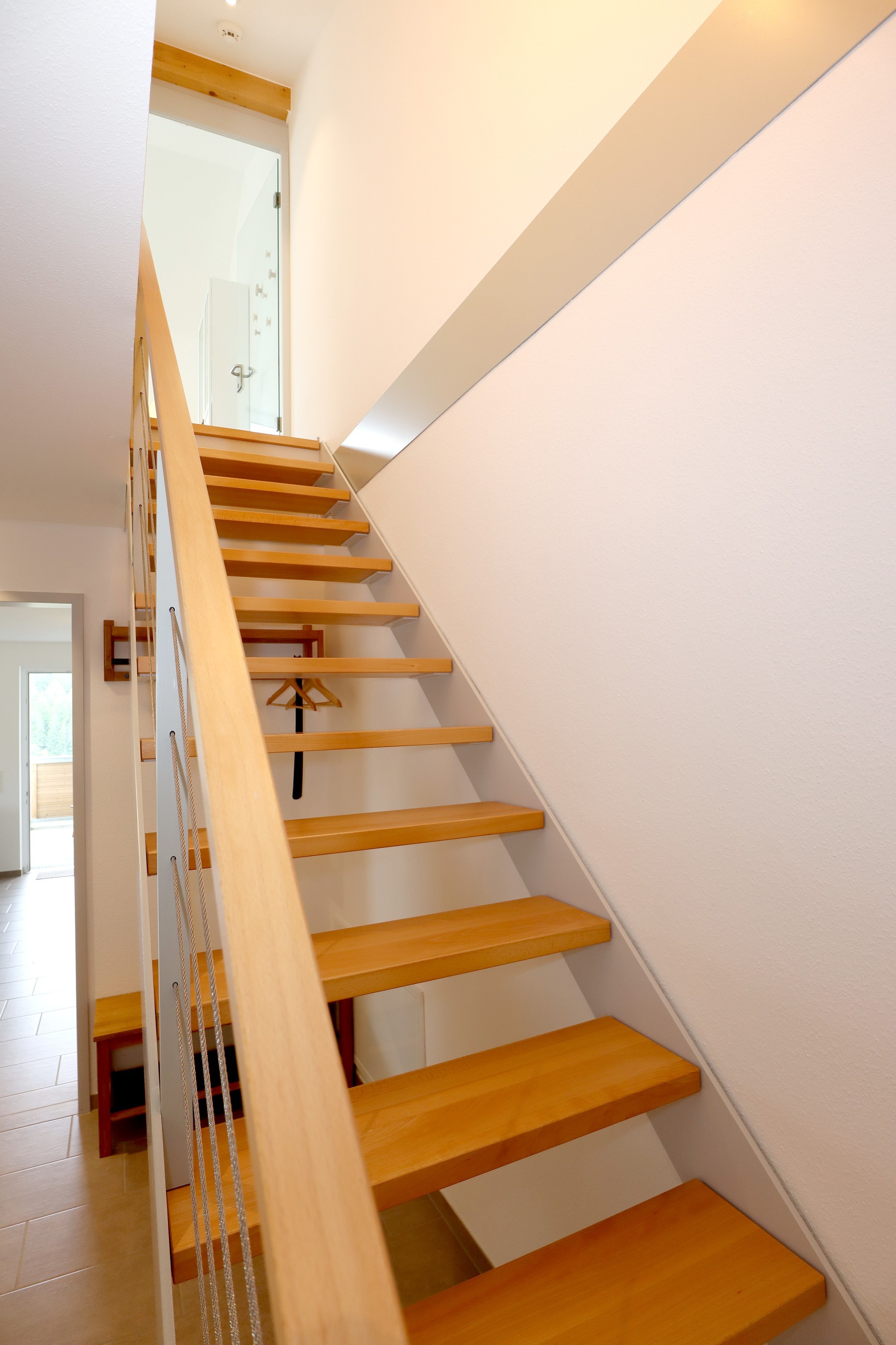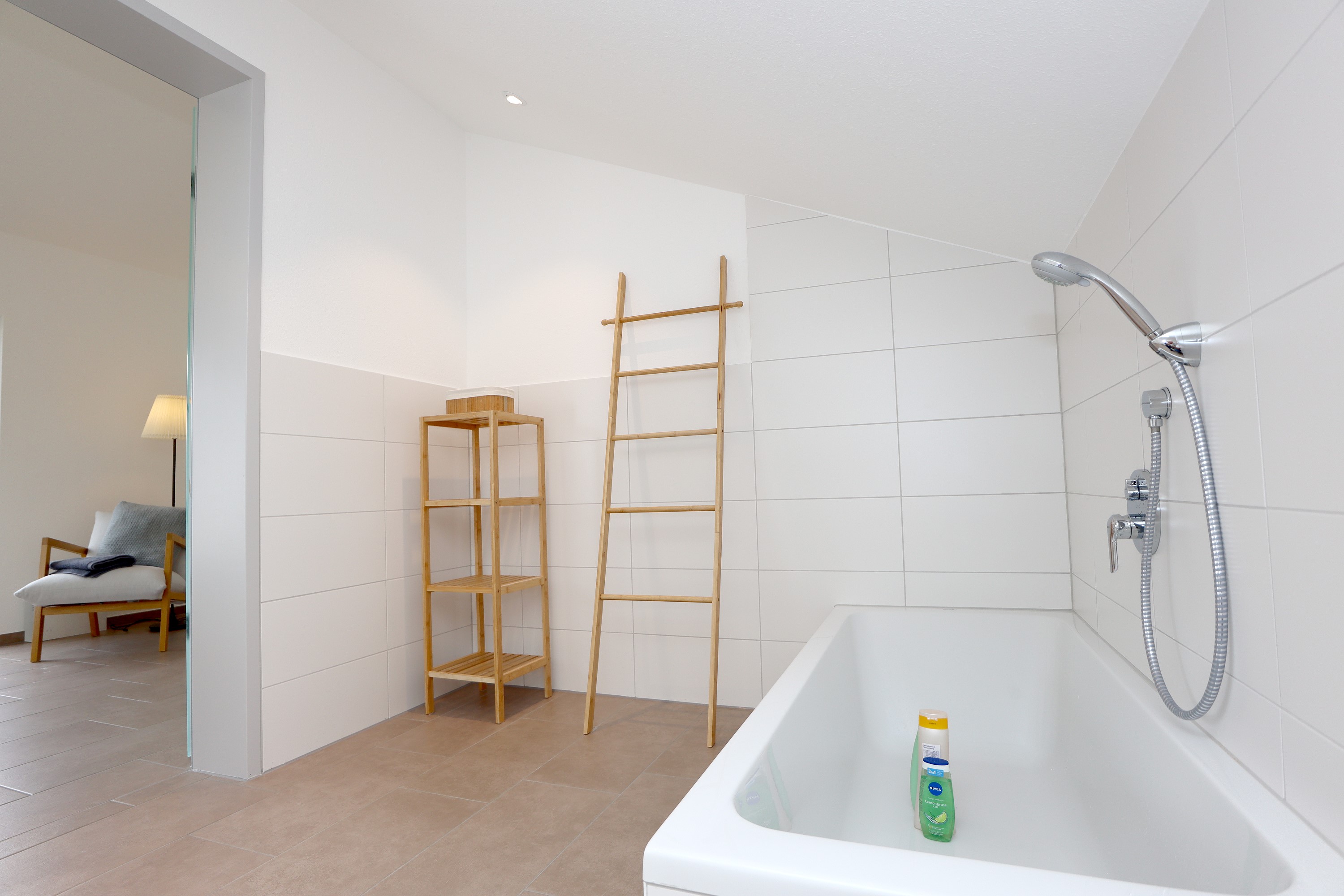 Großes Wohnzimmer mit Schlafsofa, TV und Stereoanlage Essbereich für vier Personen Voll ausgestattete Küche mit Ceranfeld, Backofen, Spülmaschine, Kühlschrank, Kaffeemaschine, Espressokocher und weiteren Extras Schlafzimmer mit höhenverstellbarem Komfortbett (Einzel- oder Doppelbett möglich) Modernes, barrierefreies Badezimmer mit Regendusche und Waschmaschine Stockwerk mit extra Zimmer, Bad mit Badewanne, Sofa und DachterrasseUmgebung