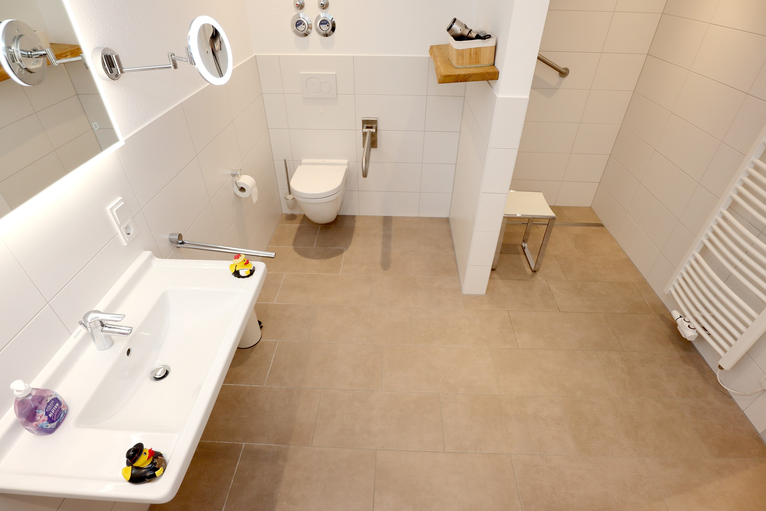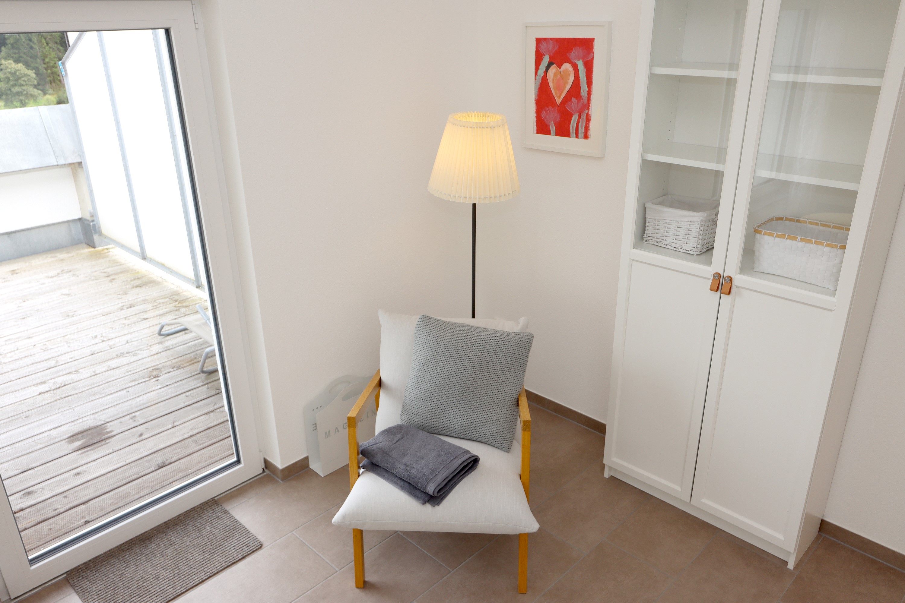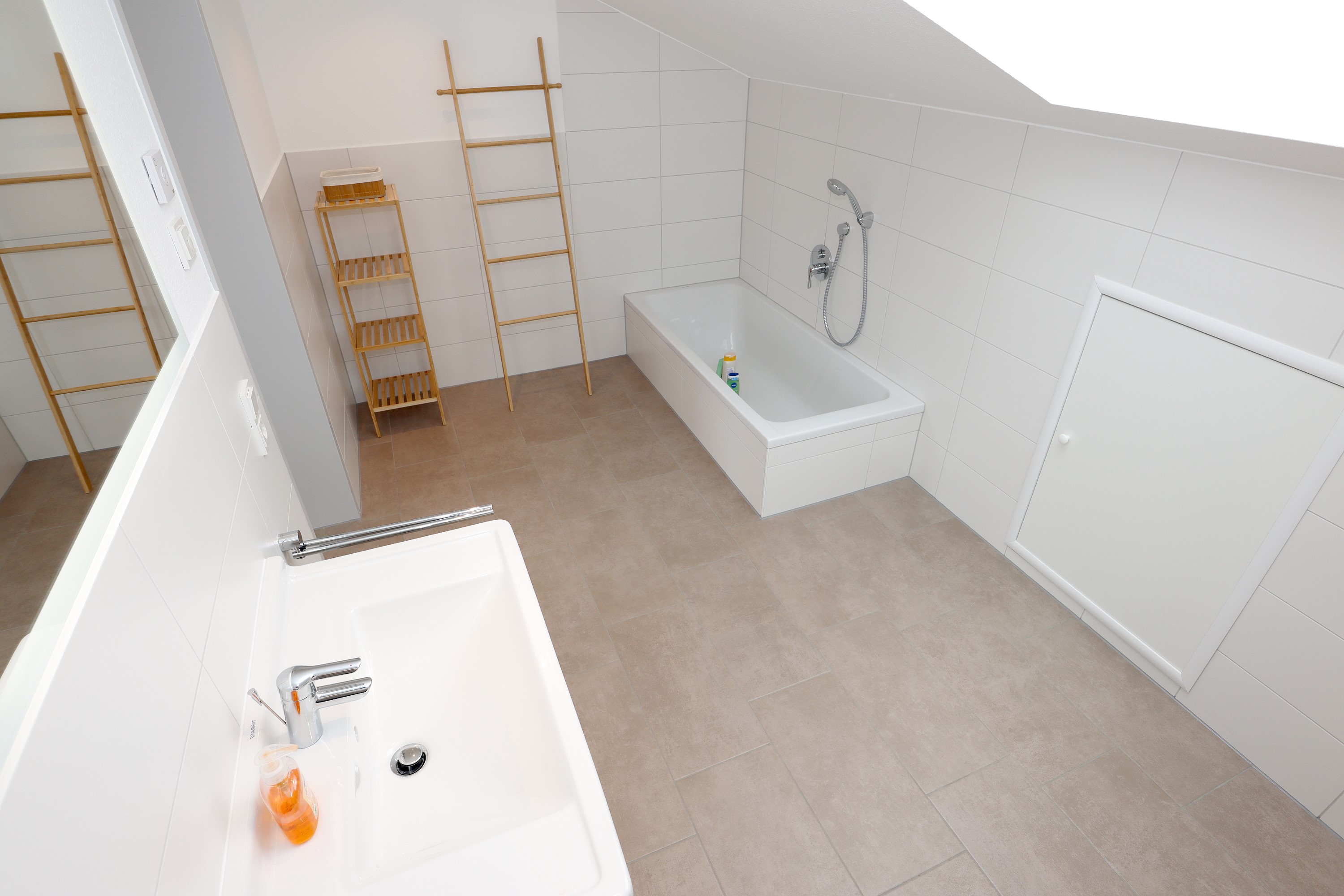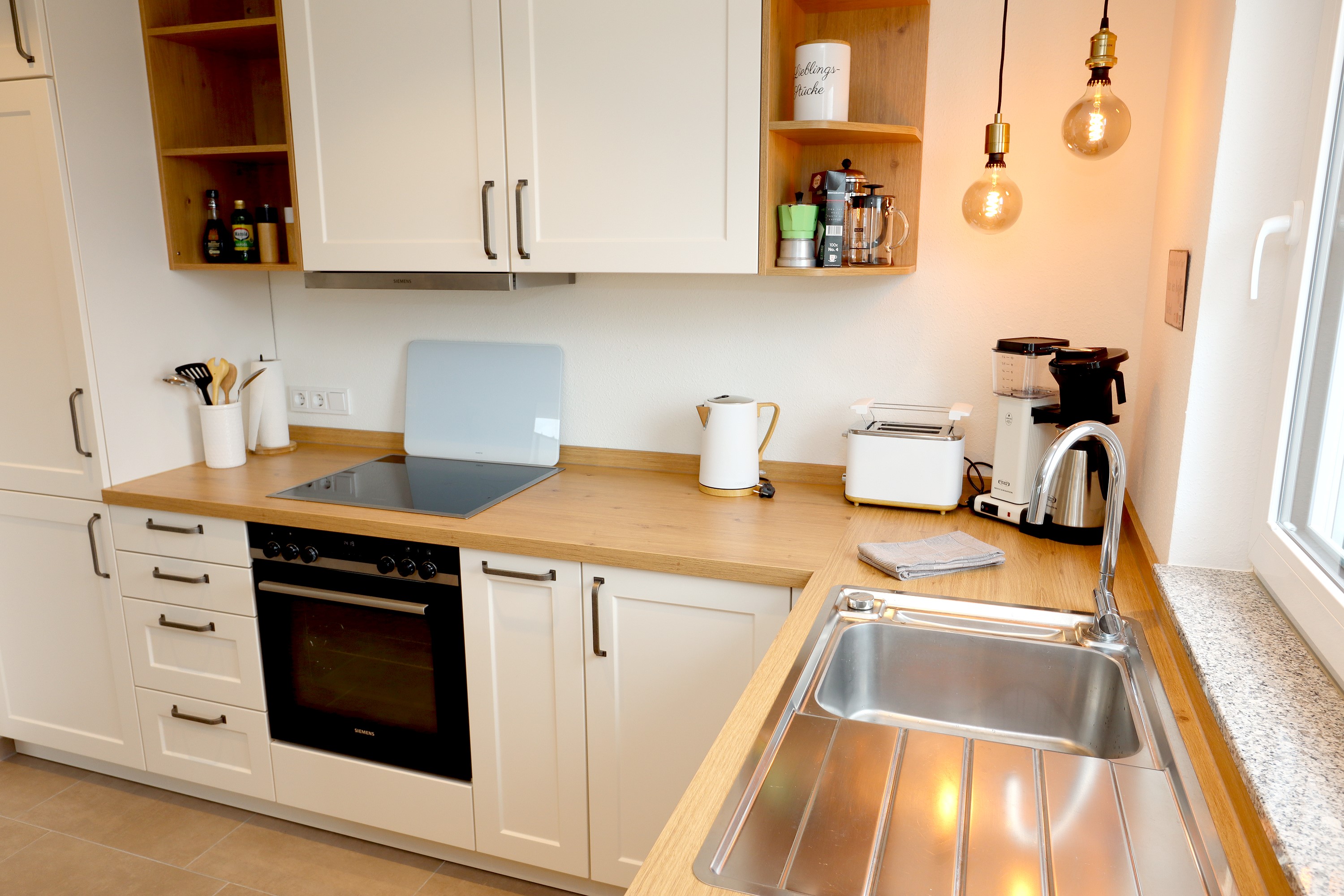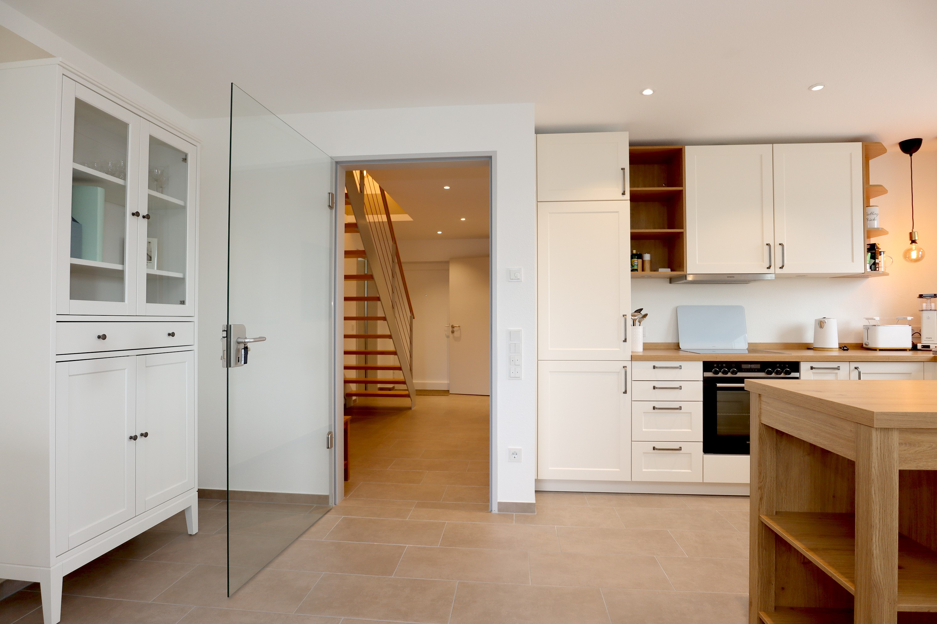 Großes Wohnzimmer mit Schlafsofa, TV und Stereoanlage Essbereich für vier Personen Voll ausgestattete Küche mit Ceranfeld, Backofen, Spülmaschine, Kühlschrank, Kaffeemaschine, Espressokocher und weiteren Extras Schlafzimmer mit höhenverstellbarem Komfortbett (Einzel- oder Doppelbett möglich) Modernes, barrierefreies Badezimmer mit Regendusche und Waschmaschine Stockwerk mit extra Zimmer, Bad mit Badewanne, Sofa und DachterrasseUmgebung