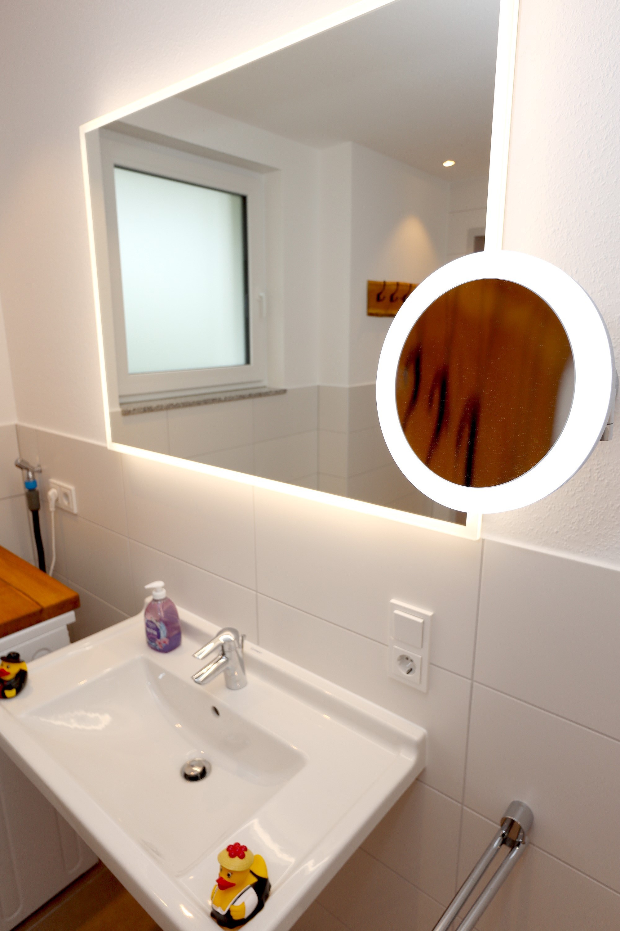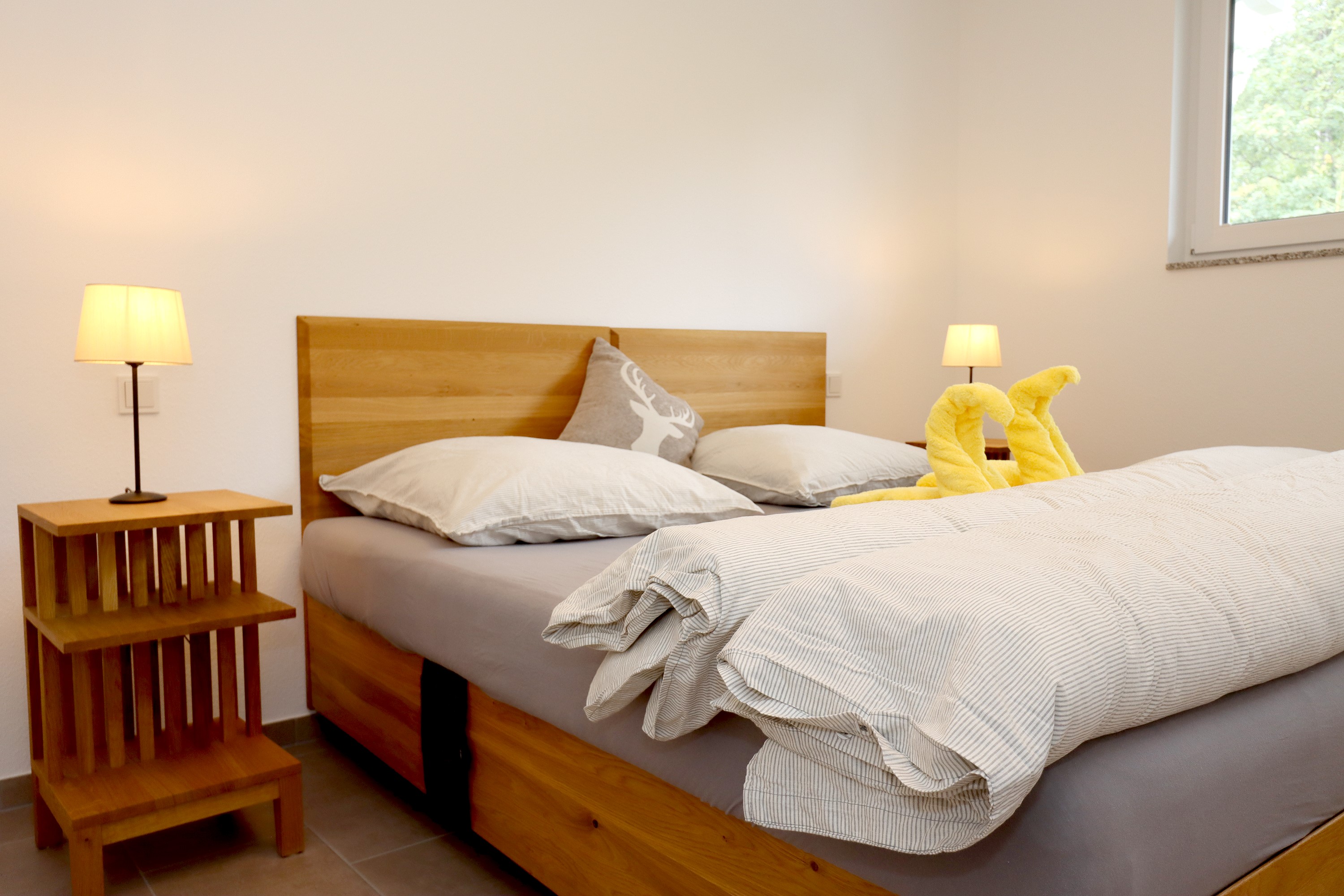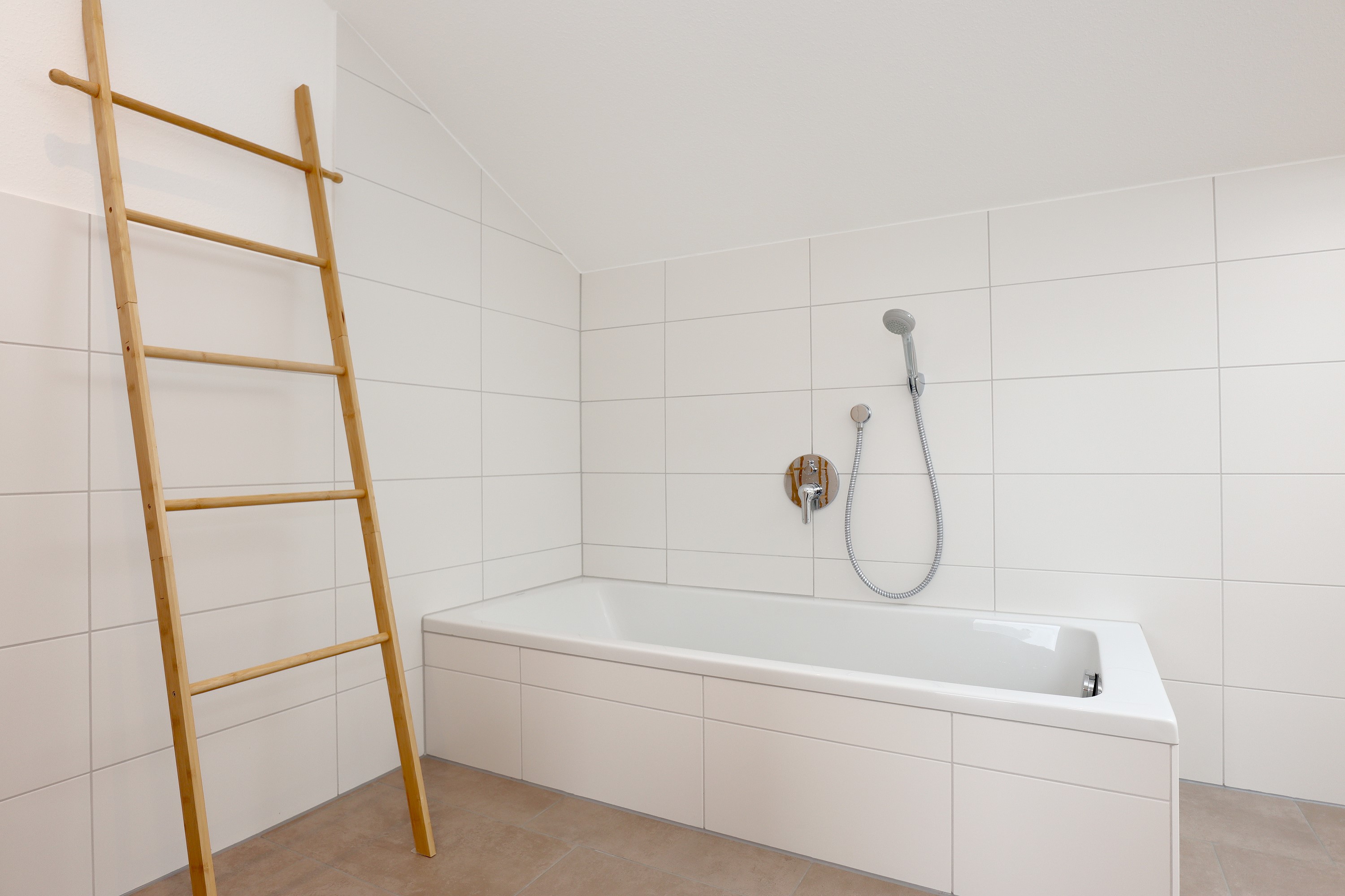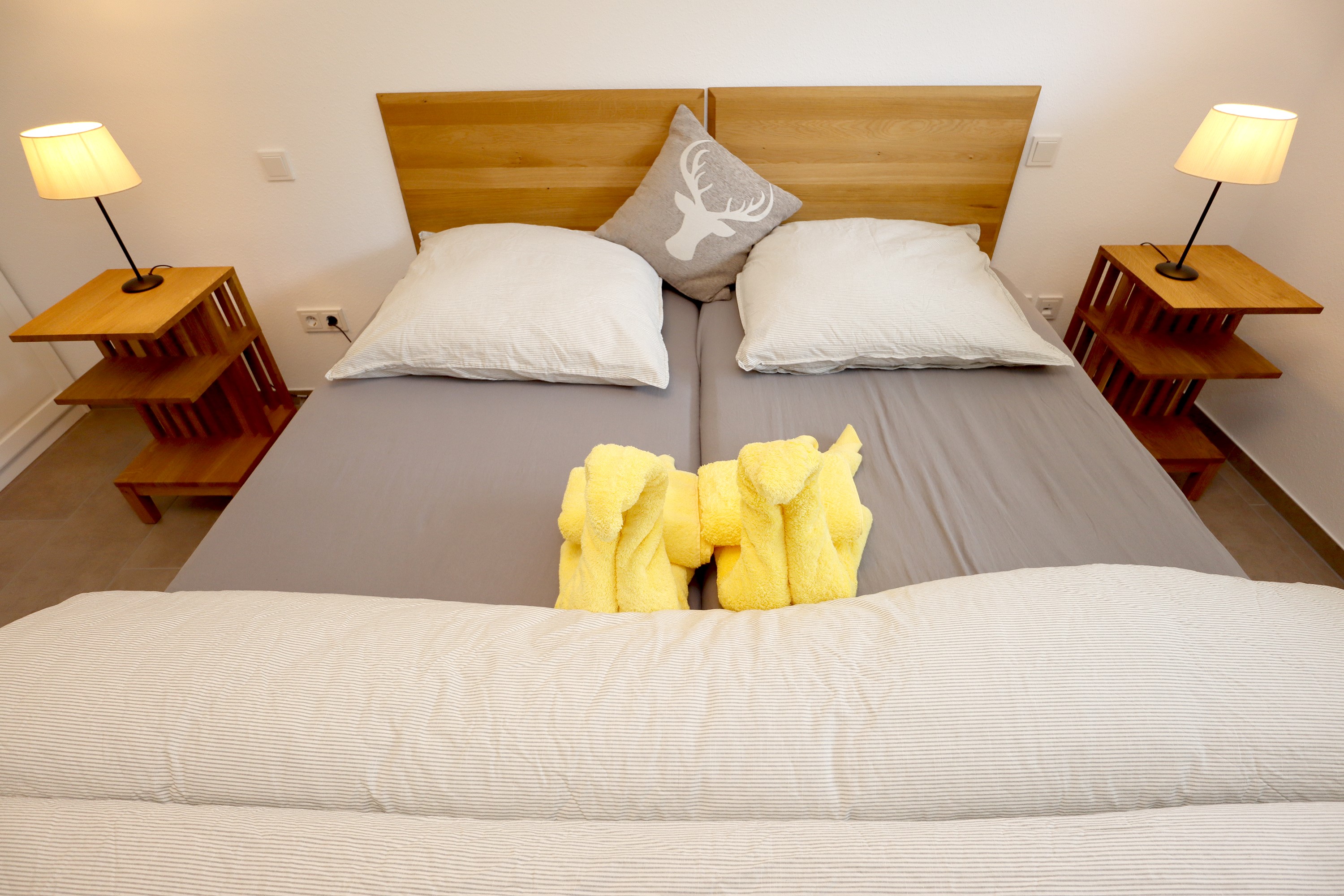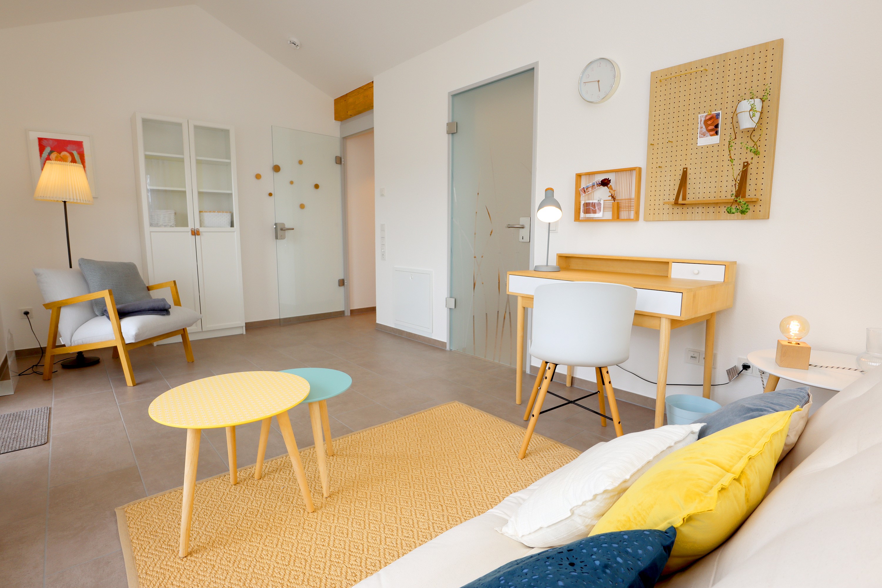 Großes Wohnzimmer mit Schlafsofa, TV und Stereoanlage Essbereich für vier Personen Voll ausgestattete Küche mit Ceranfeld, Backofen, Spülmaschine, Kühlschrank, Kaffeemaschine, Espressokocher und weiteren Extras Schlafzimmer mit höhenverstellbarem Komfortbett (Einzel- oder Doppelbett möglich) Modernes, barrierefreies Badezimmer mit Regendusche und Waschmaschine Stockwerk mit extra Zimmer, Bad mit Badewanne, Sofa und DachterrasseUmgebung