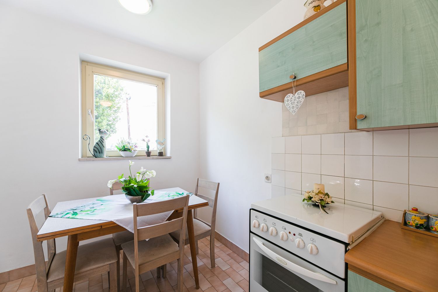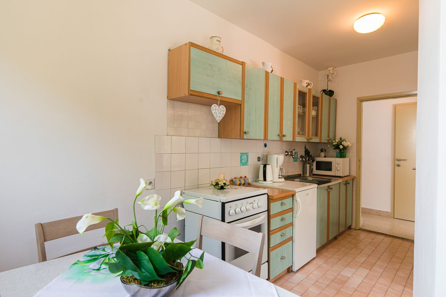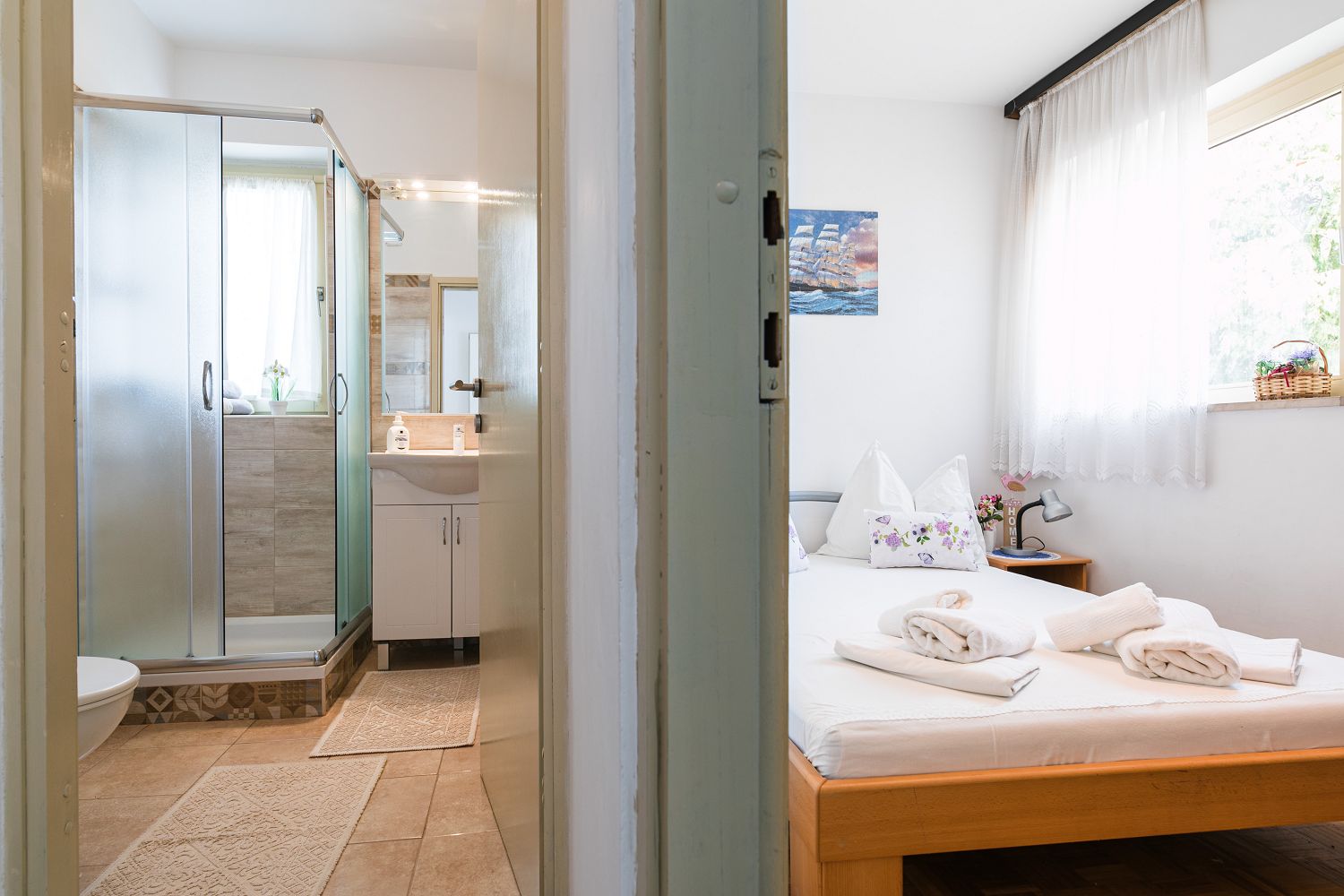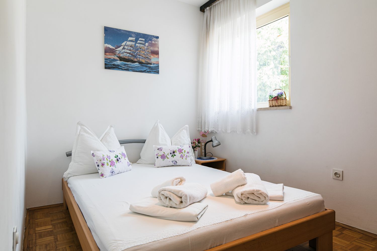 Selce gehört zur Gemeinde Crikvenica, einem Urlaubsziel vieler deutschsprachiger Touristen. Die für vier Personen geeignete Wohnung besteht aus einem Eingangsbereich, einem Esszimmer mit Küche, einem Schlafzimmer mit Doppelbett und Meerblick sowie einem Schlafzimmer zur Hinterseite des Hauses. Vom Schlafzimmer aus gelangt man auf einen Balkon mit Meerblick. Der Balkon ist über das Schlafzimmer mit Meerblick zugänglich. Der Parkplatz befindet sich auf dem Privatgrundstück.