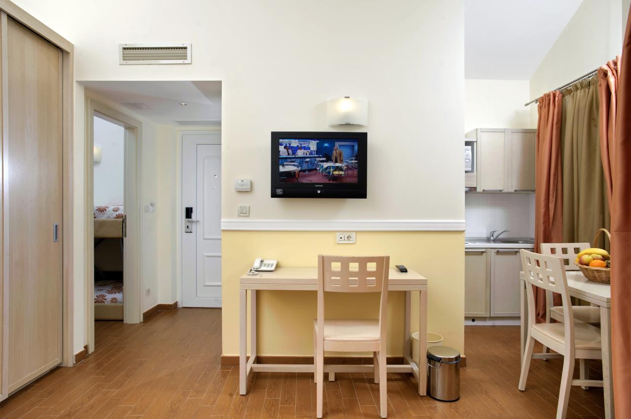 Das 30 Quadratmeter grosse Apartment 2+2 bietet Platz für 4 Personen (davon zwei Kinder bis max. 12 Jahre) und besteht aus einem kombinierten Wohn- und Schlafraum mit zwei zusammen geschriebenen Einzelbetten oder einen Doppelbett sowie einem Kinderzimmer mit einem Stockbett. Die gut eingerichtete Küche befindet sich im Wohnbereich und verfügt über einen Herd, Geschirr, Besteck, Kochtöpfe, Toaster, Wasserkocher, Mikrowelle und Kühlschrank mit Eisfach. Ein Sat-TV und Klimaanlage sind vorhanden. Das Badezimmer ist mit einer Dusche sowie Waschbecken, WC und Föhn ausgestattet. Der überdachte Balkon mit Tisch und Stühlen lädt zum gemütlichen Entspannen ein, während die Kinder sich auf dem Spielplatz oder am Pool austoben können. Fahrzeit ab kroatischer Grenze ca. 4h. Hinweis: Wenn Sie mehr als eine Unterkunft benötigen, ist dies bei uns in der Regel möglich, da wir über mehrere Objekte des gleichen Haustyps verfügen.