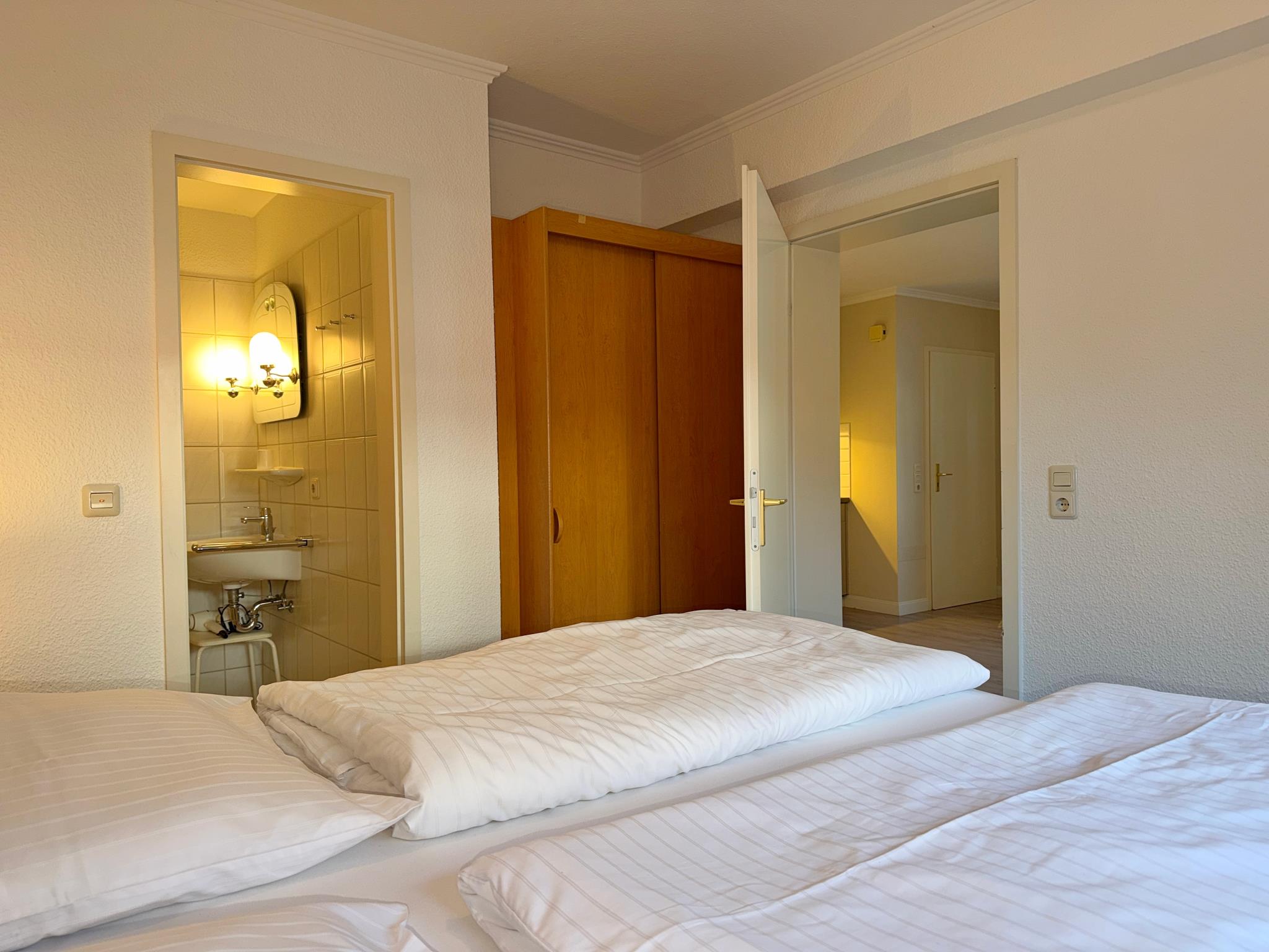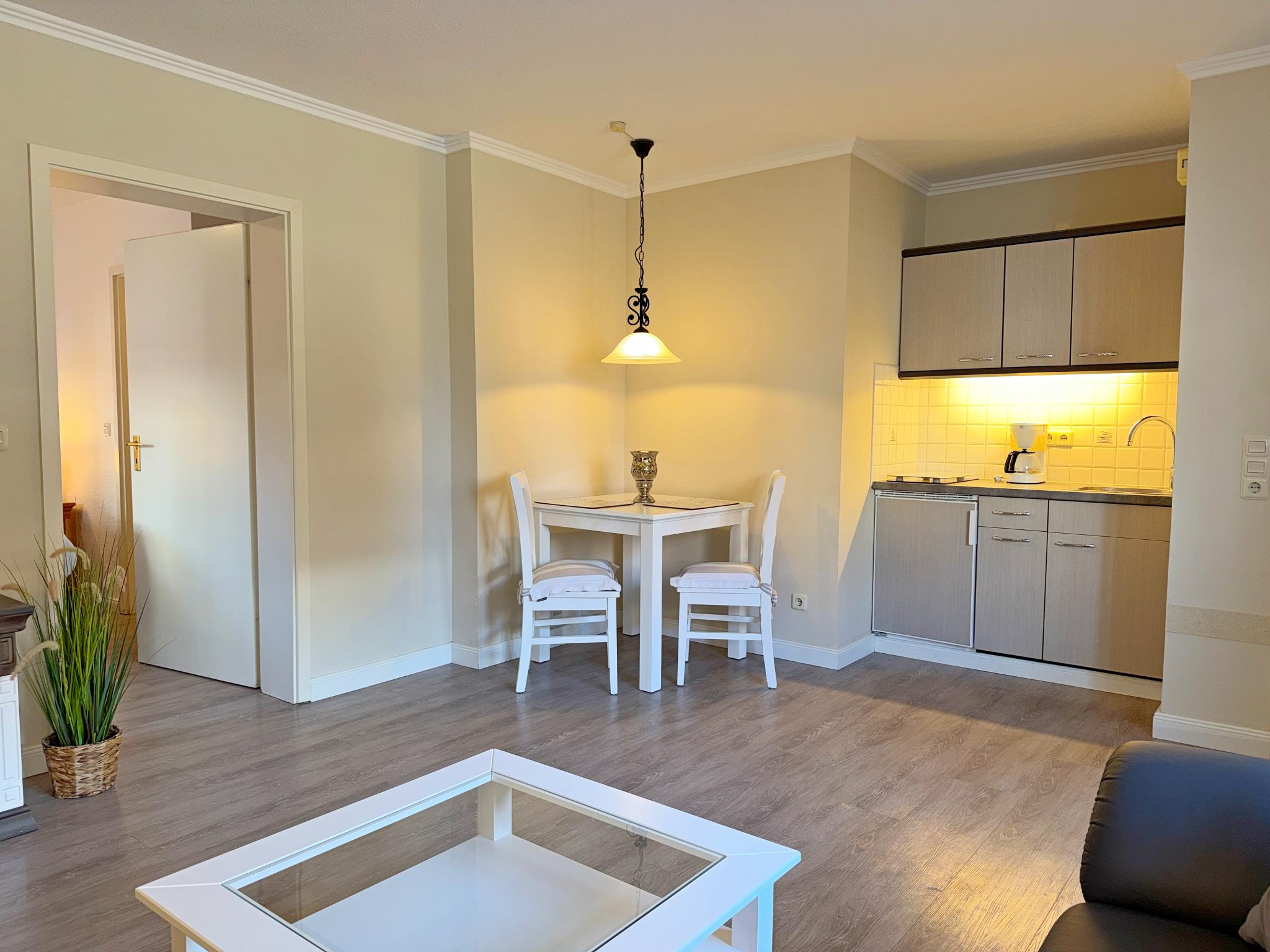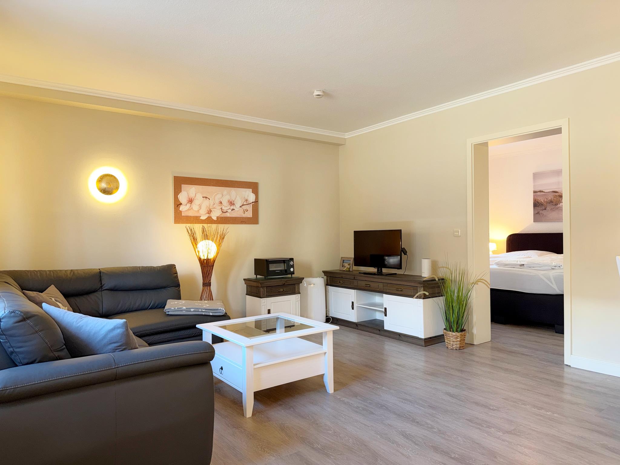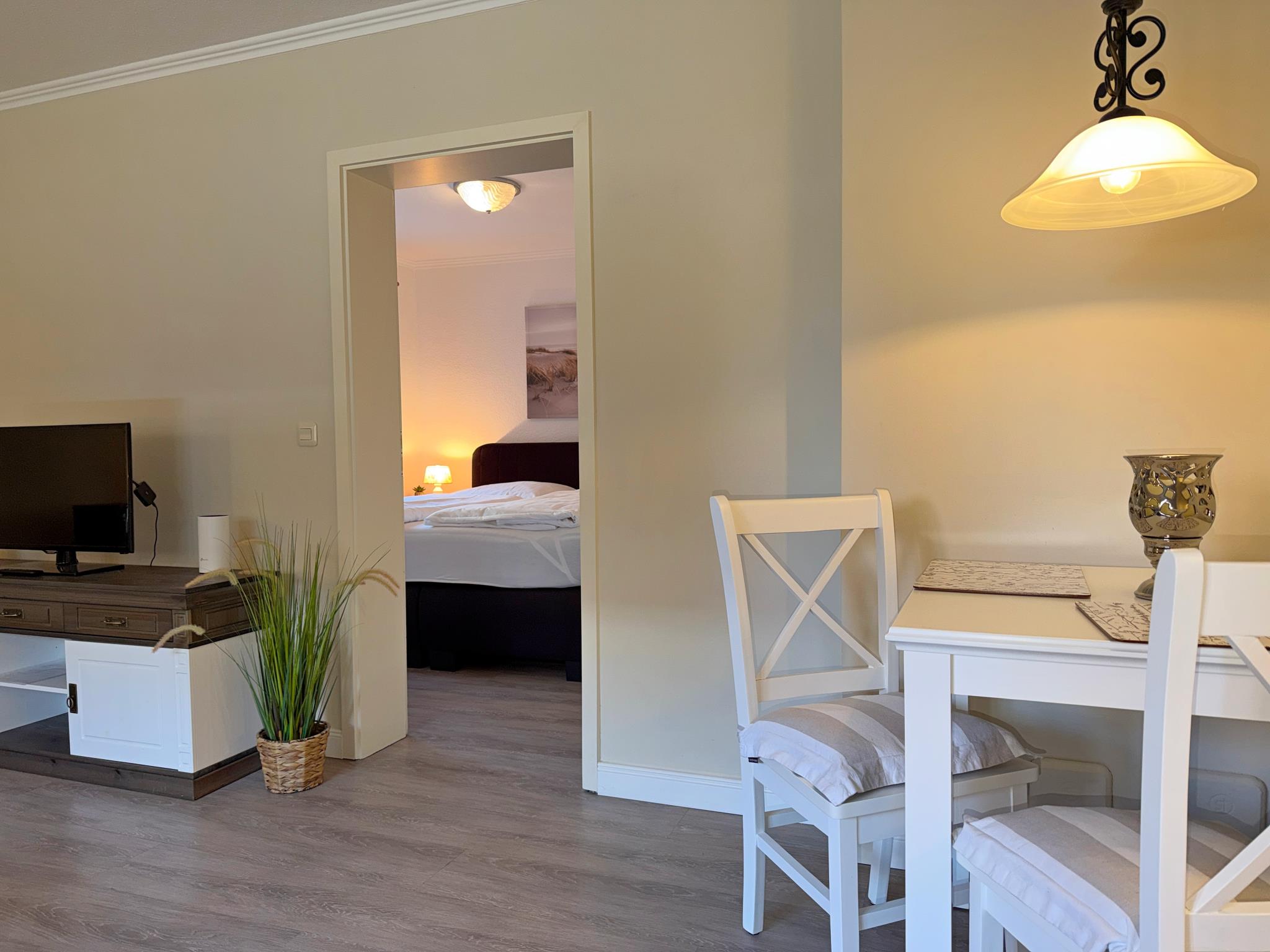 Das Appartement verfügt über ein separates Schlafzimmer mit komfortablem Doppelbett sowie ein Schlafsofa, das zusätzliche Schlafmöglichkeiten bietet. Der offene Wohn- und Essbereich ist hell, gemütlich und lädt zum Verweilen ein – ob beim Frühstück oder einem entspannten Abend.