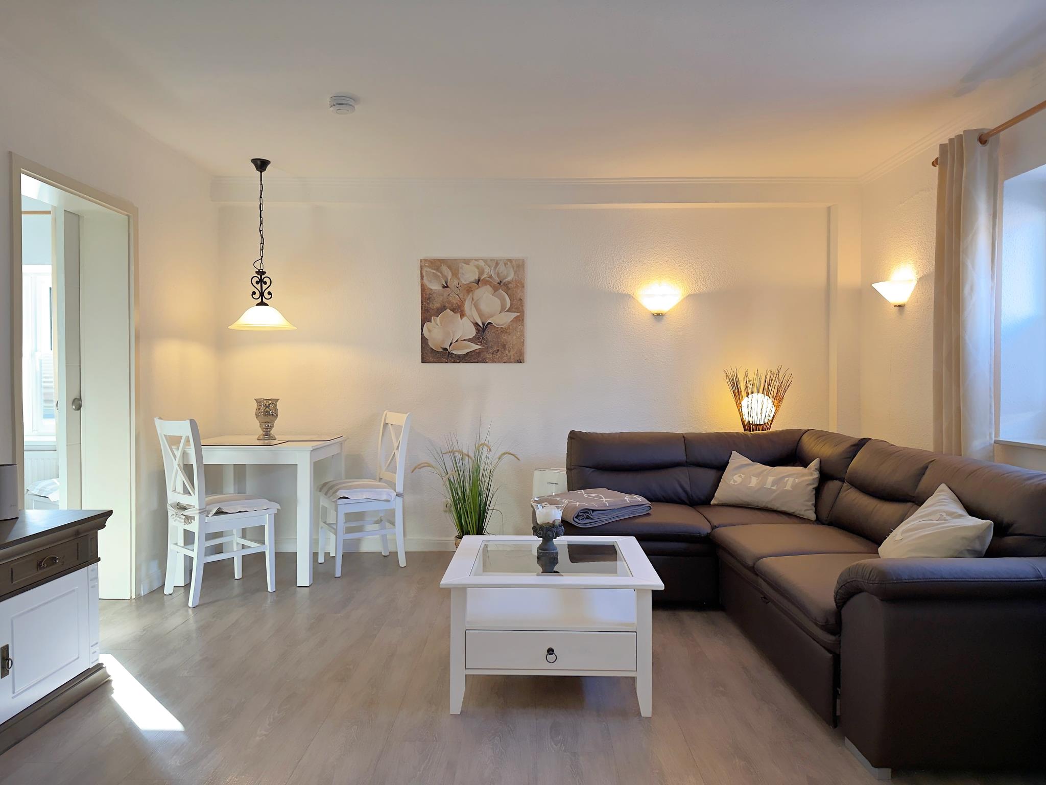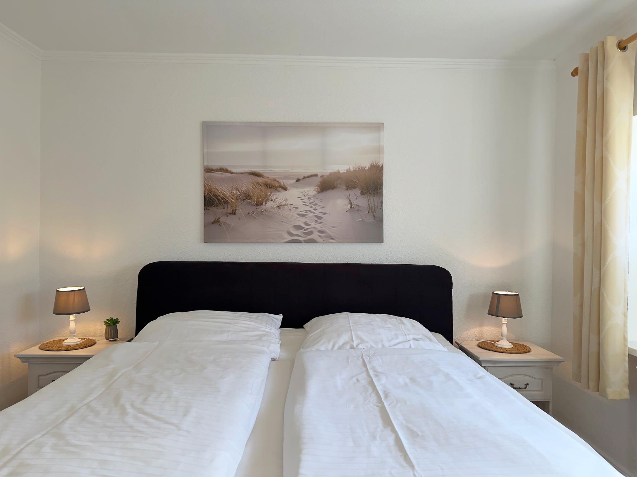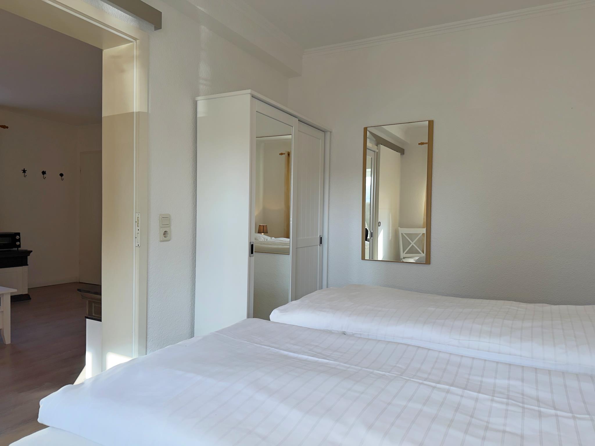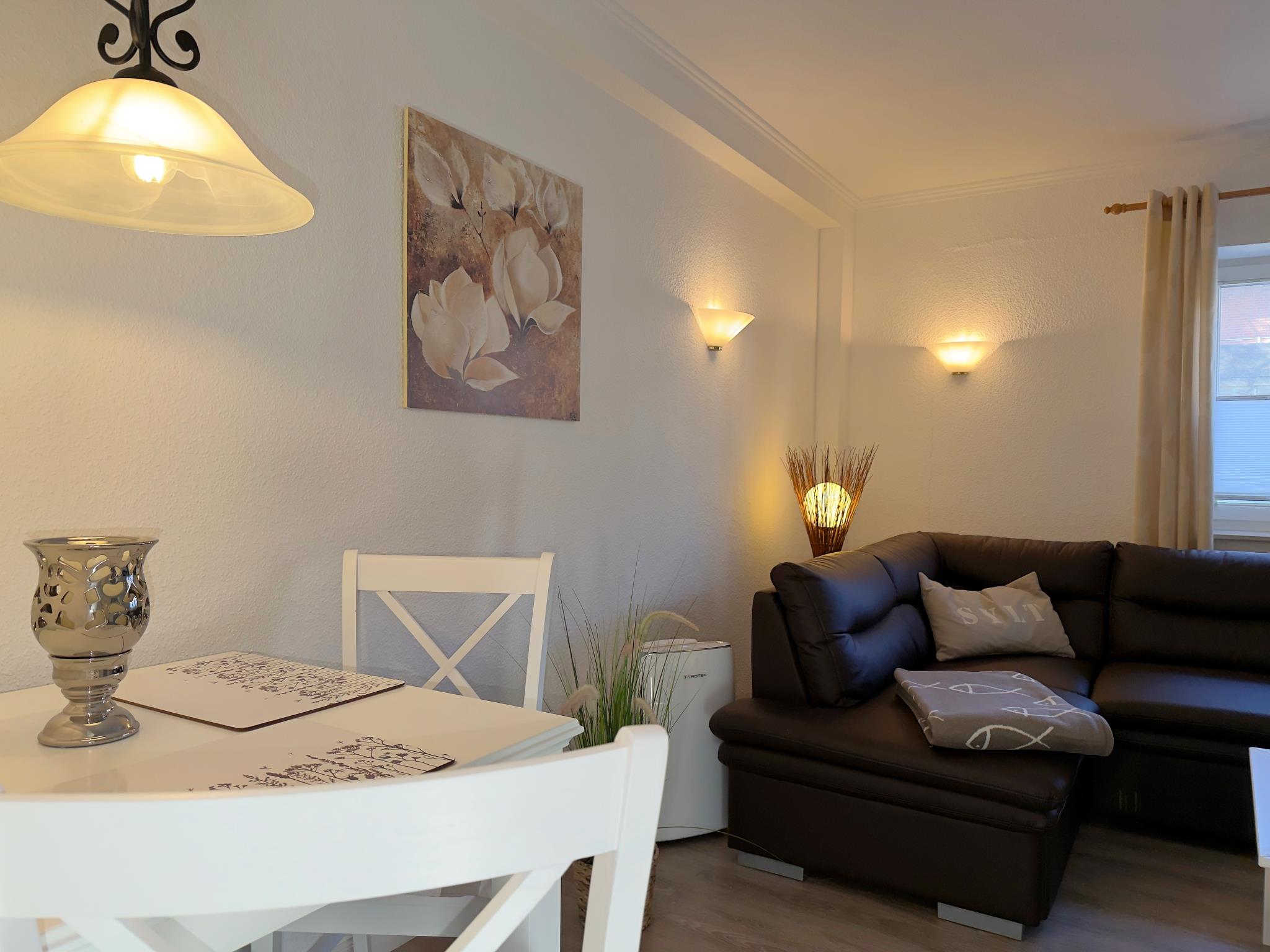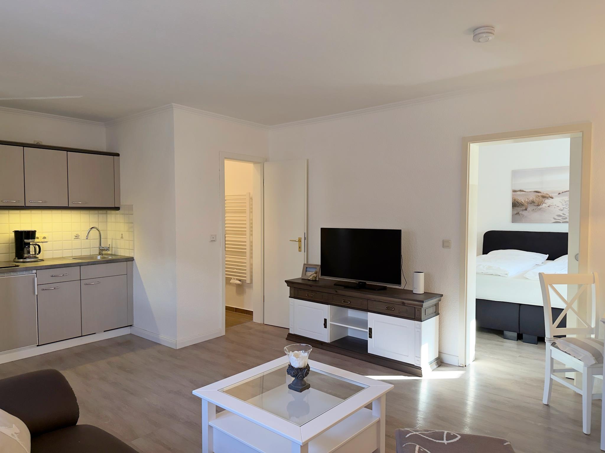 Das Appartement bietet ein Schlafzimmer mit Doppelbett sowie ein praktisches Schlafsofa im Wohnbereich. Der offen gestaltete Wohn- und Essbereich schafft eine angenehme Atmosphäre und eignet sich perfekt für gemeinsame Mahlzeiten oder entspannte Stunden nach einem Tag an der frischen Nordseeluft.