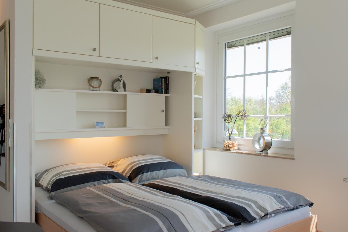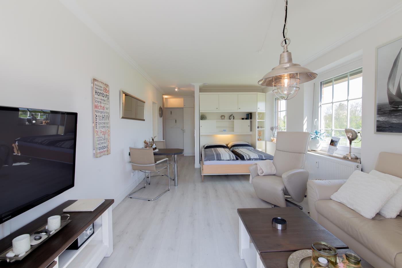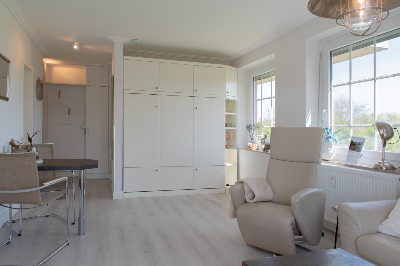 1 Zimmer mit Doppelbett, Balkon und Küche bietet Platz für zwei Gäste und einem Kleinkind (bis 3 Jahre). Das Zimmer verfügt über ein gemütliches Schrankbett (1,80er Breite). Die offene Küche ist komplett ausgestattet und lässt keine Wünsche offen. Vom Wohnzimmer aus erreicht man den Balkon mit süd-westlicher Ausrichtung. Hier können Sie es sich im Strandkorb unter der Markise gemütlich machen oder ein schönes Frühstück zu sich nehmen. Das moderne Badezimmer mit einer Dusche und einem WC rundet die schöne Ferienwohnung ab. Elektrische Rollläden und ein Mückenschutz sind ebenfalls vorhanden.