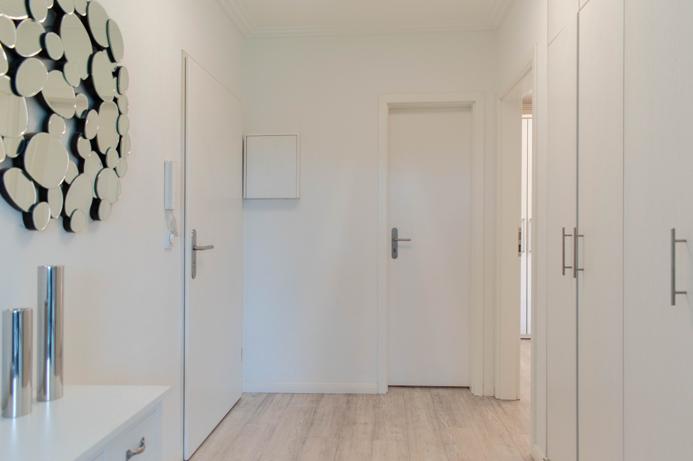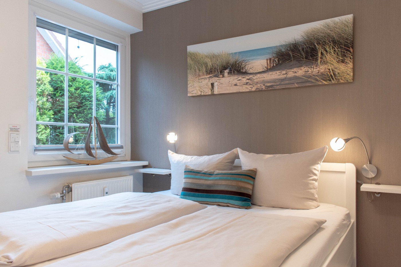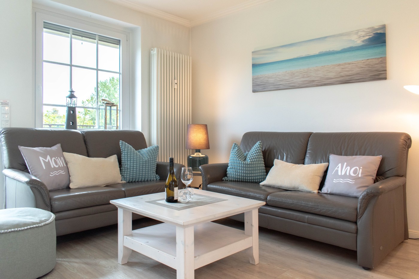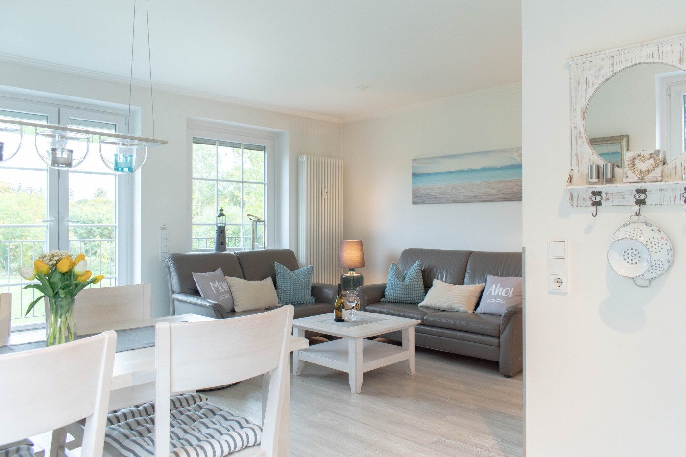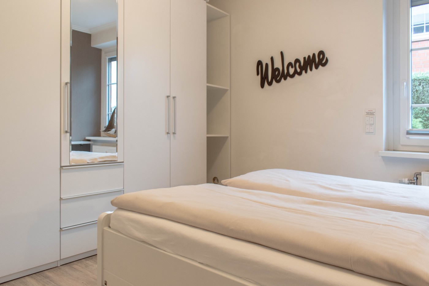 Zwei Zimmer mit separatem Schlafbereich, Wohnbereich mit Ausziehcouch und Küche bieten Platz für bis zu vier Gästen. Das separate Schlafzimmer verfügt über ein gemütliches Doppelbett (1,60er Breite) und einem großen Kleiderschrank mit viel Stauraum. Im Wohn- / Schlafbereich steht eine gemütliche Ausziehcouch (1,40er Breite) zur Verfügung. Die offene Küche ist komplett ausgestattet und lässt keine Wünsche offen. Vom Wohnzimmer aus erreicht man die großzügige, möblierte Terrasse mit eigenem Strandkorb und Markise, welche zum Verweilen und Relaxen einlädt. Das moderne Badezimmer mit einer Dusche und einem WC rundet die schöne Ferienwohnung ab.
