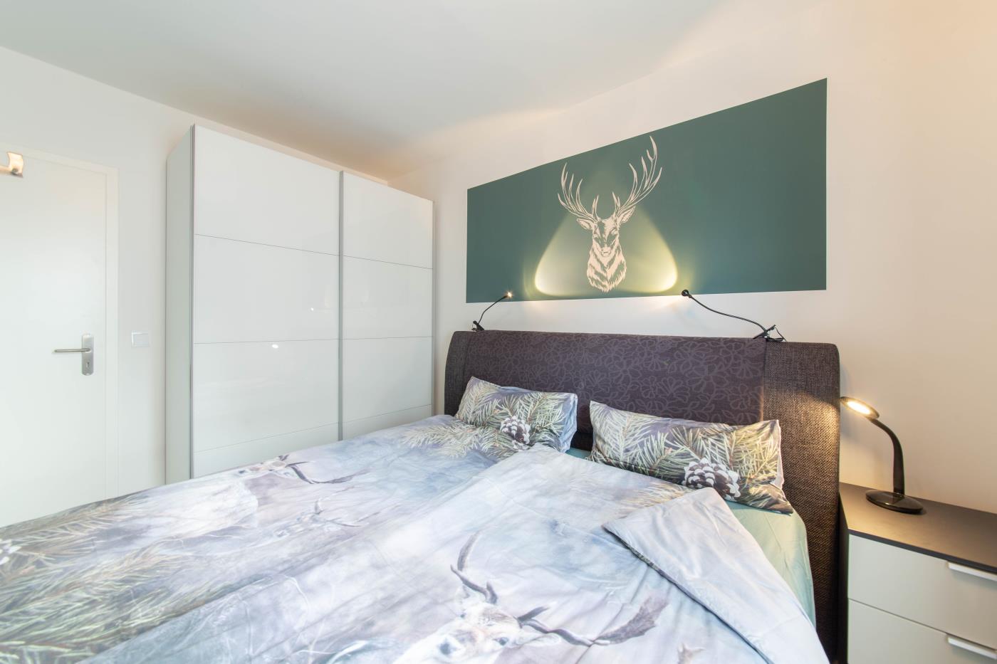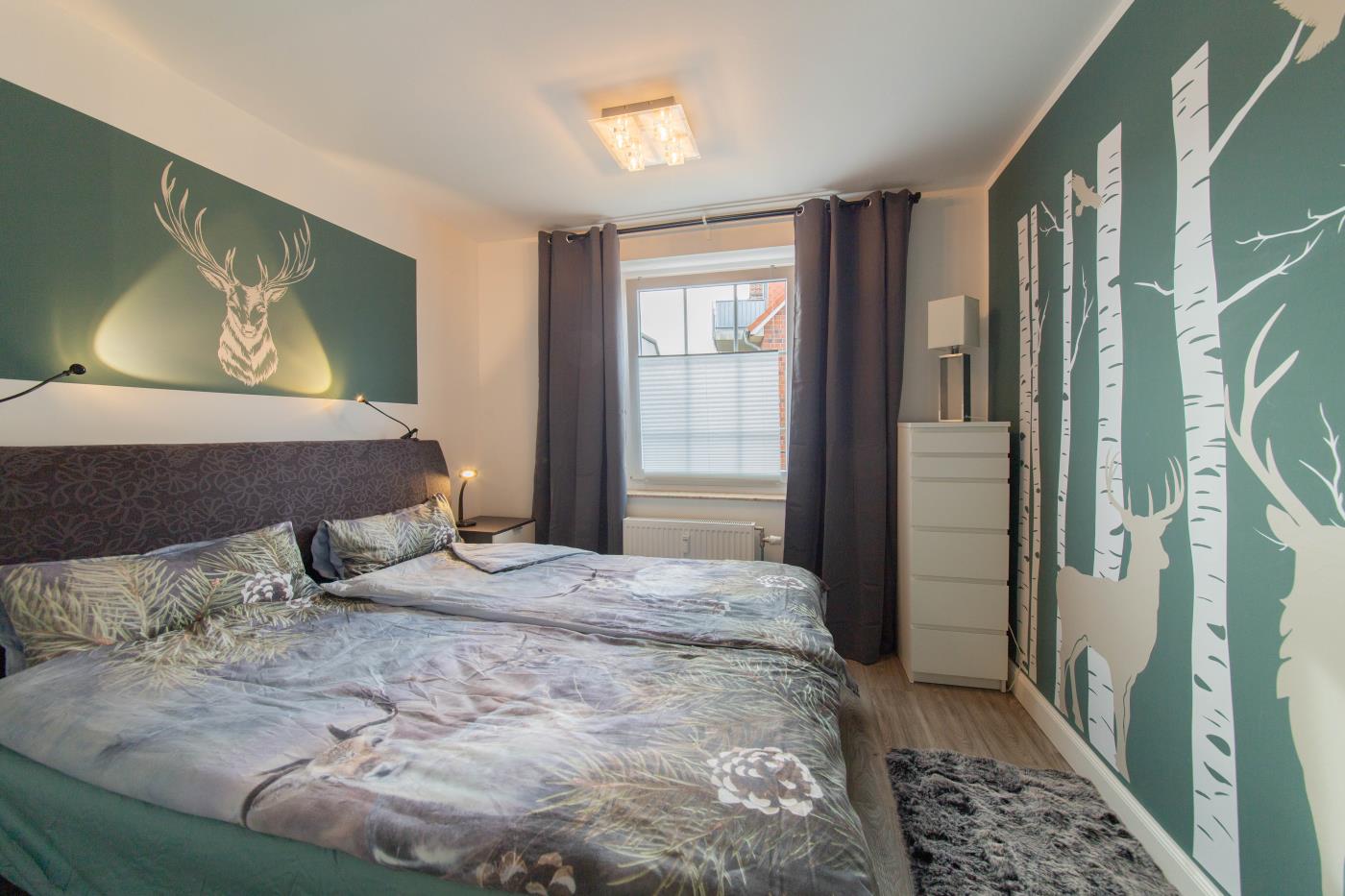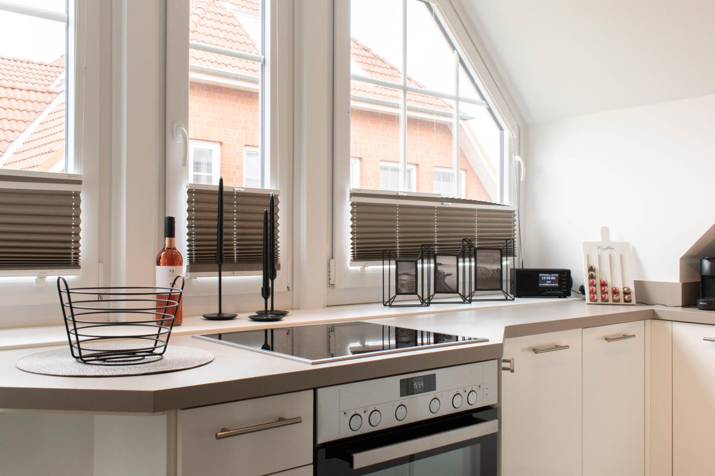 Zwei Zimmer mit separatem Schlafbereich, Wohnbereich mit Ausziehcouch und Küche bieten Platz für drei erwachsene Gäste und einem Kleinkind. Das separate Schlafzimmer verfügt über ein gemütliches Boxspringbett (1,80er Breite) und einem großen Kleiderschrank, wo Sie all Ihre Sachen aus dem Koffer verstauen können. Im Wohn- / Schlafbereich steht eine gemütliche Ausziehcouch (1,40er Breite) zur Verfügung. Die offene Küche ist komplett ausgestattet und lässt keine Wünsche offen. Vom Wohnzimmer aus erreicht man den möblierten Balkon, welcher zum Verweilen und Relaxen einlädt. Das moderne Badezimmer mit einer Dusche und einem WC rundet die schöne Ferienwohnung ab.