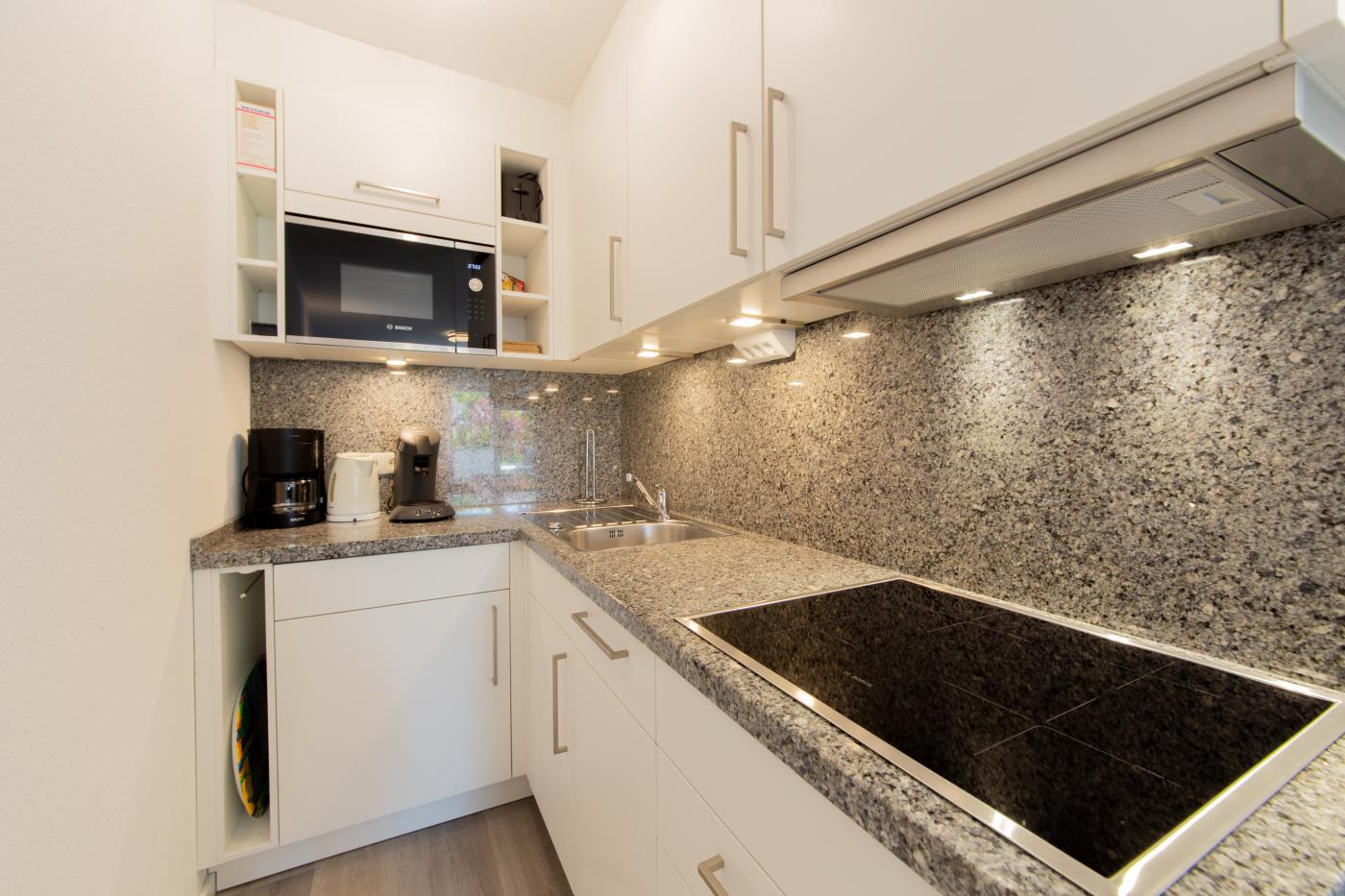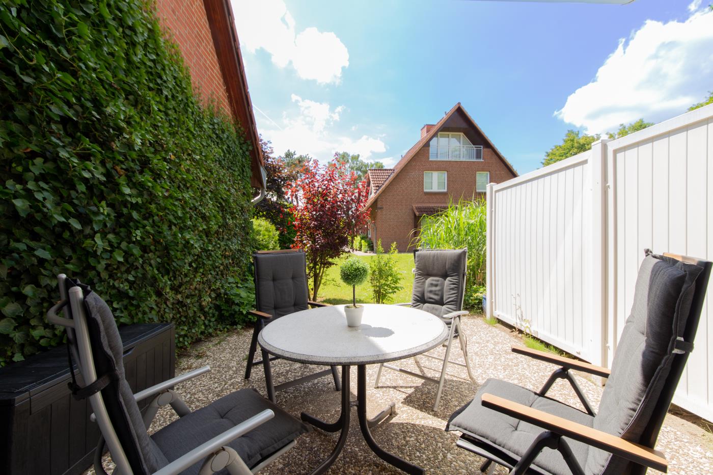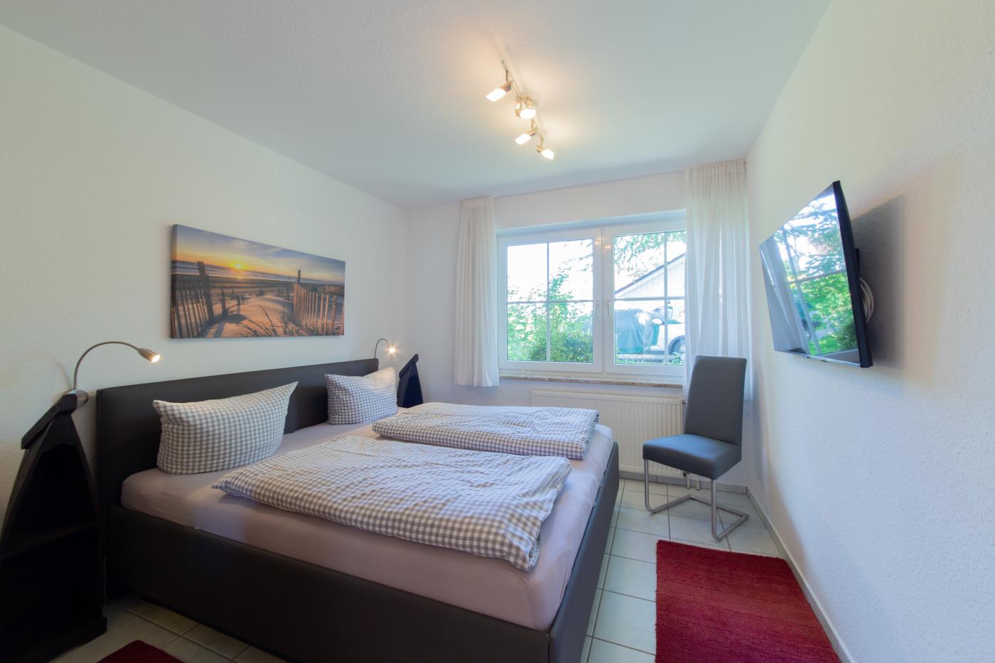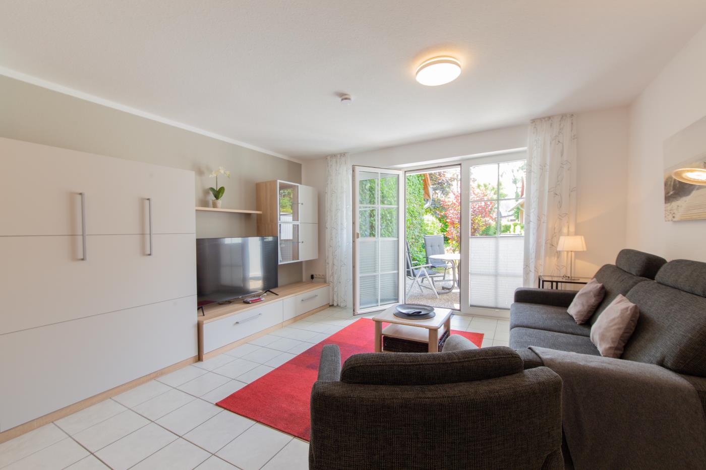 Die Zweizimmerwohnung mit separatem Schlafbereich, eigener Terrasse und Küche bietet Platz für drei Gäste. Das Schlafzimmer verfügt über ein gemütliches Doppelbett (1,80er Breite) und einen großen Kleiderschrank mit viel Stauraum für Ihr Gepäck. Im Wohnbereich steht ein Schrankbett (1,20 er Breite) zur Verfügung. Die offene Küche ist zur Selbstversorgung ausgestattet und lässt keine Wünsche offen. Vom Wohnzimmer aus erreicht man die großzügige Terrasse mit Gartenmöbeln und Markise, welche an heißen Tagen ausreichend Schattet bietet. Durch einen Sichtschutz zu den Nachbarn haben Sie genug Privatsphäre. Das moderne Badezimmer verfügt über eine Dusche und ein WC.