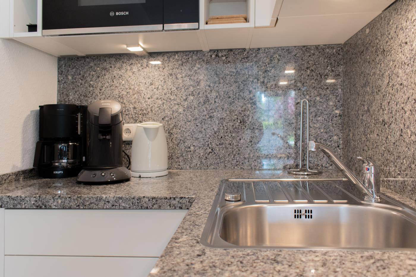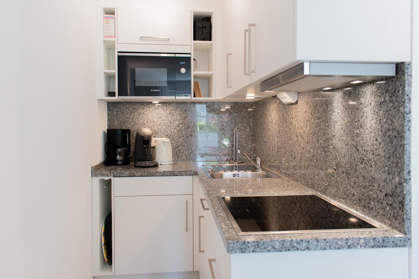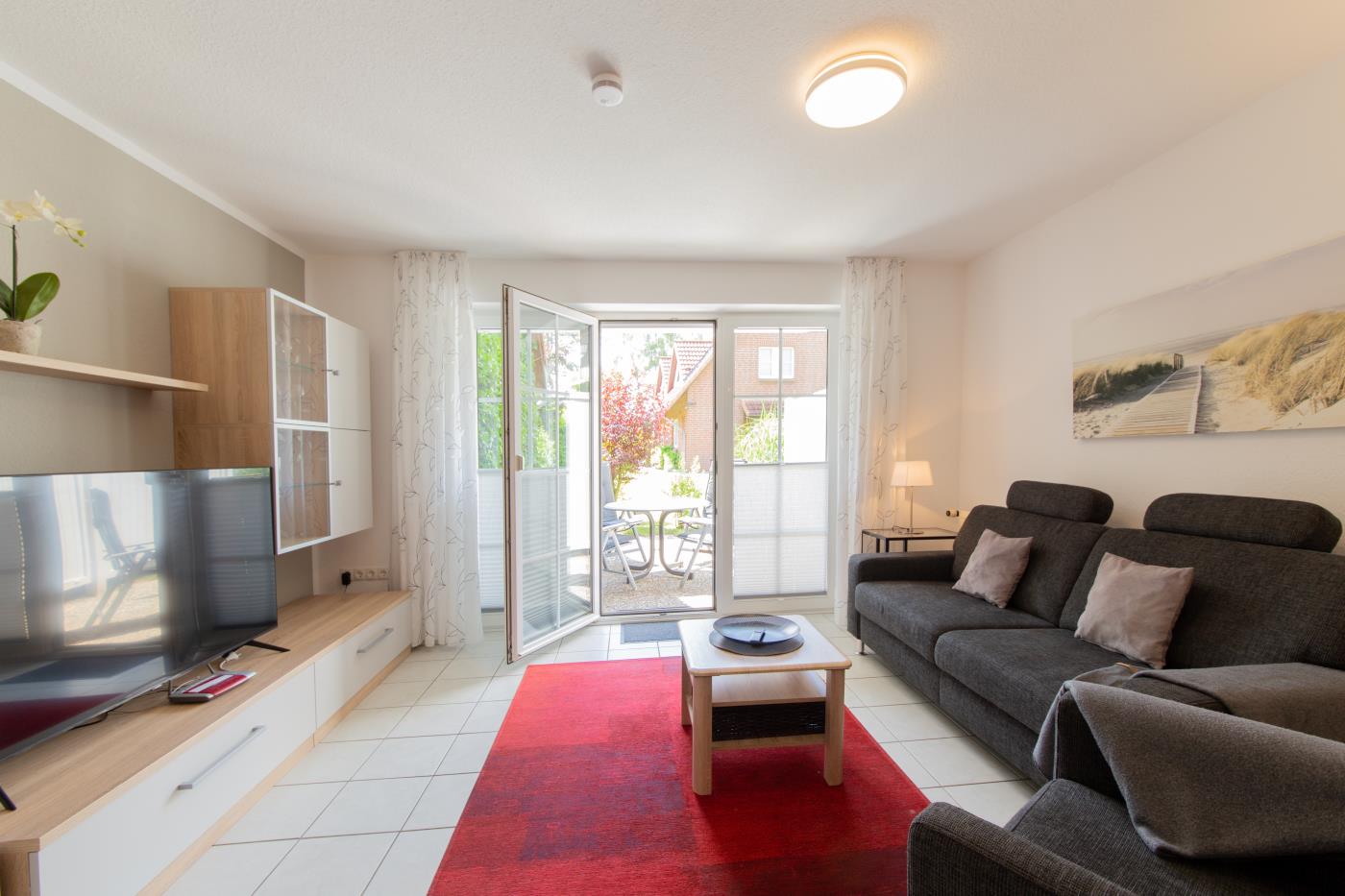 Die Zweizimmerwohnung mit separatem Schlafbereich, eigener Terrasse und Küche bietet Platz für drei Gäste. Das Schlafzimmer verfügt über ein gemütliches Doppelbett (1,80er Breite) und einen großen Kleiderschrank mit viel Stauraum für Ihr Gepäck. Im Wohnbereich steht ein Schrankbett (1,20 er Breite) zur Verfügung. Die offene Küche ist zur Selbstversorgung ausgestattet und lässt keine Wünsche offen. Vom Wohnzimmer aus erreicht man die großzügige Terrasse mit Gartenmöbeln und Markise, welche an heißen Tagen ausreichend Schattet bietet. Durch einen Sichtschutz zu den Nachbarn haben Sie genug Privatsphäre. Das moderne Badezimmer verfügt über eine Dusche und ein WC.