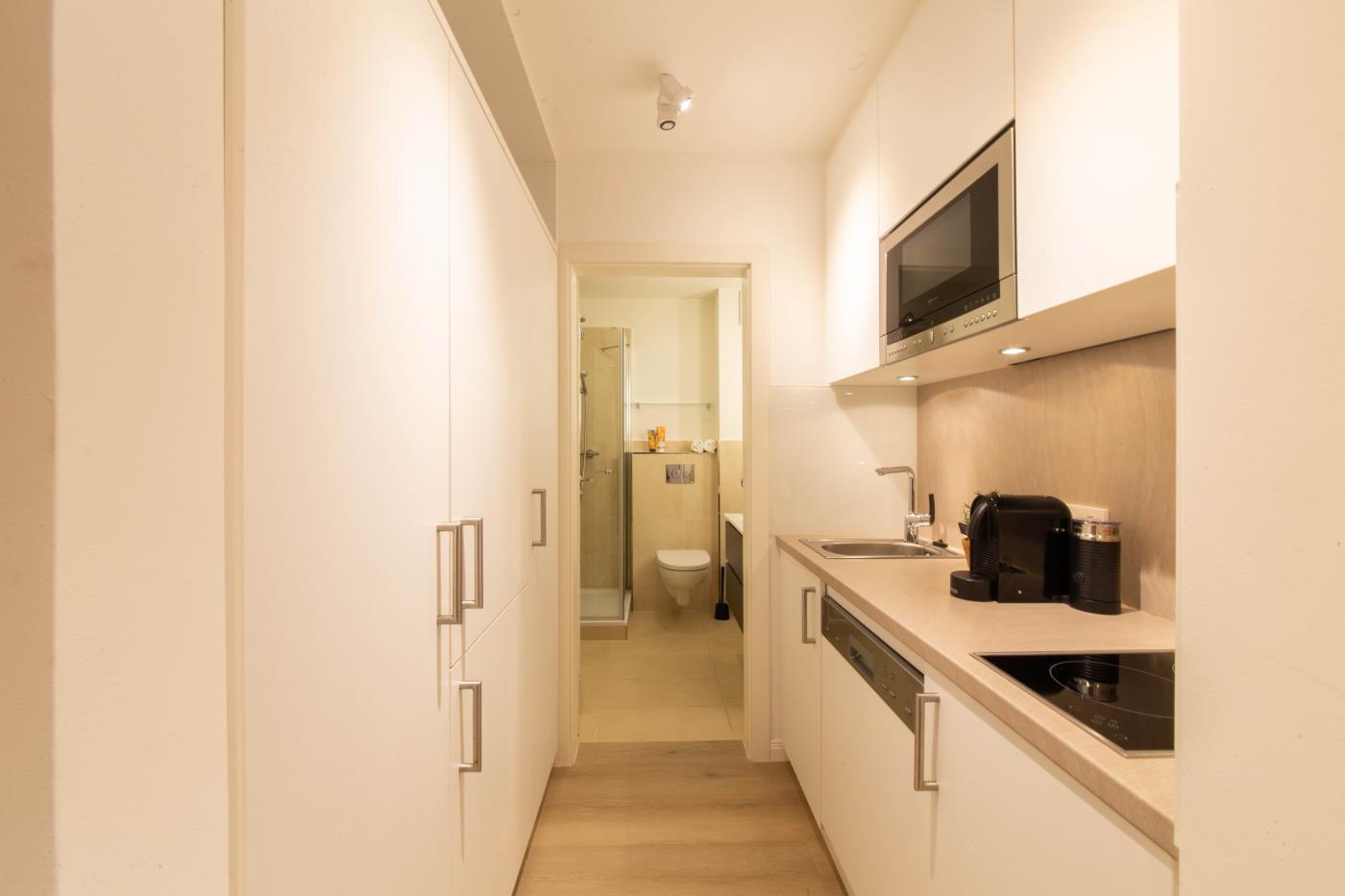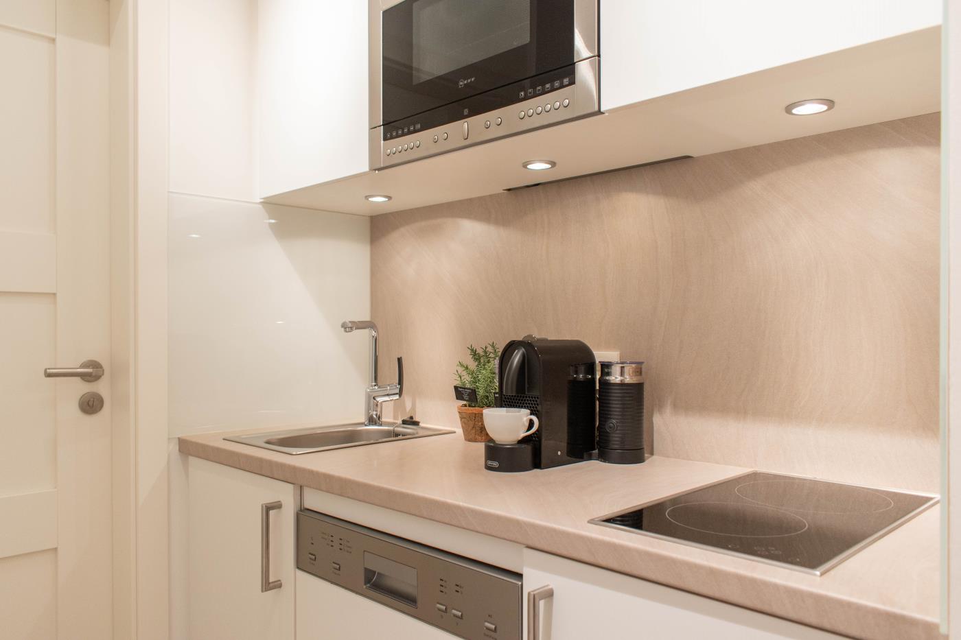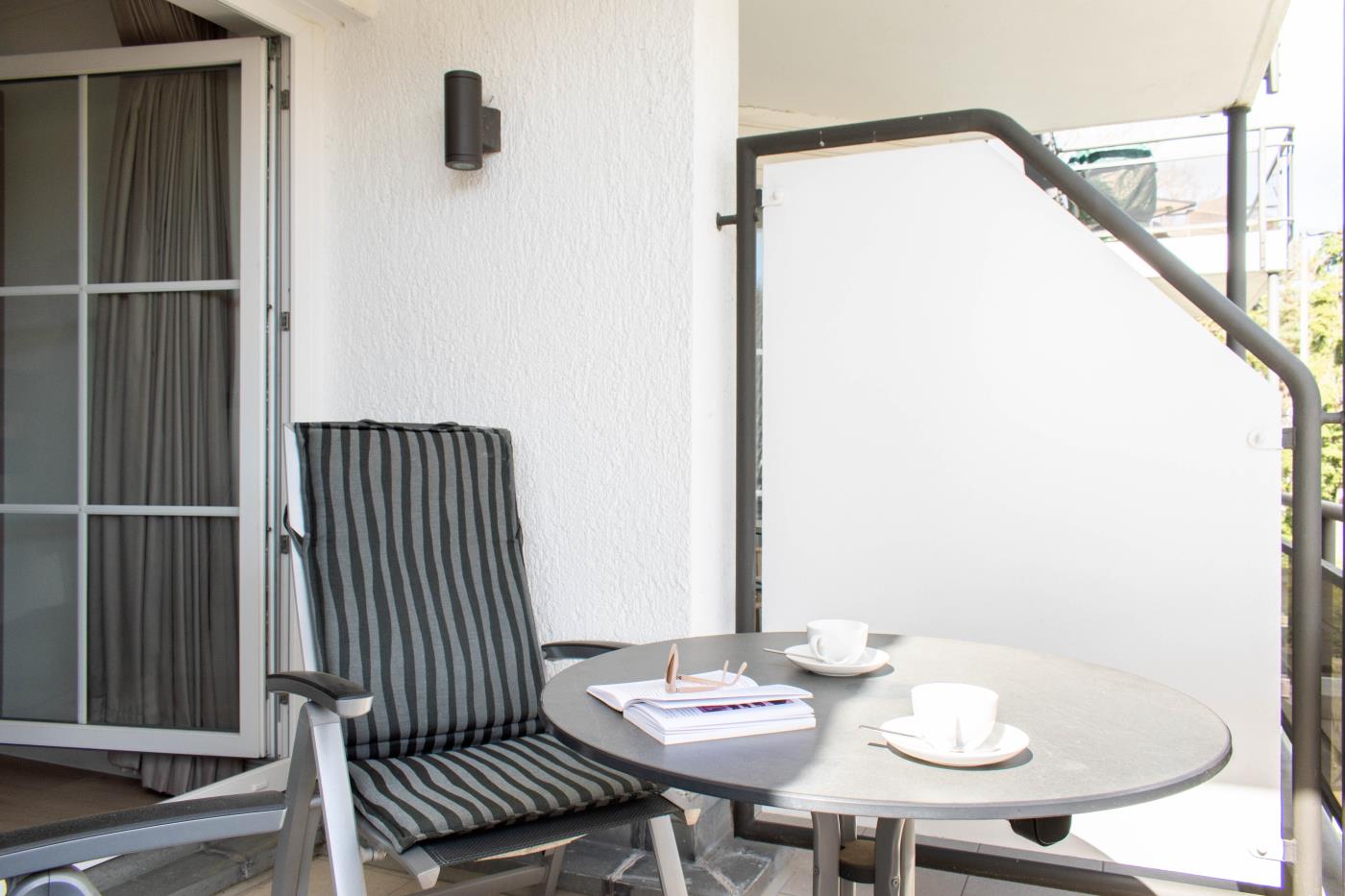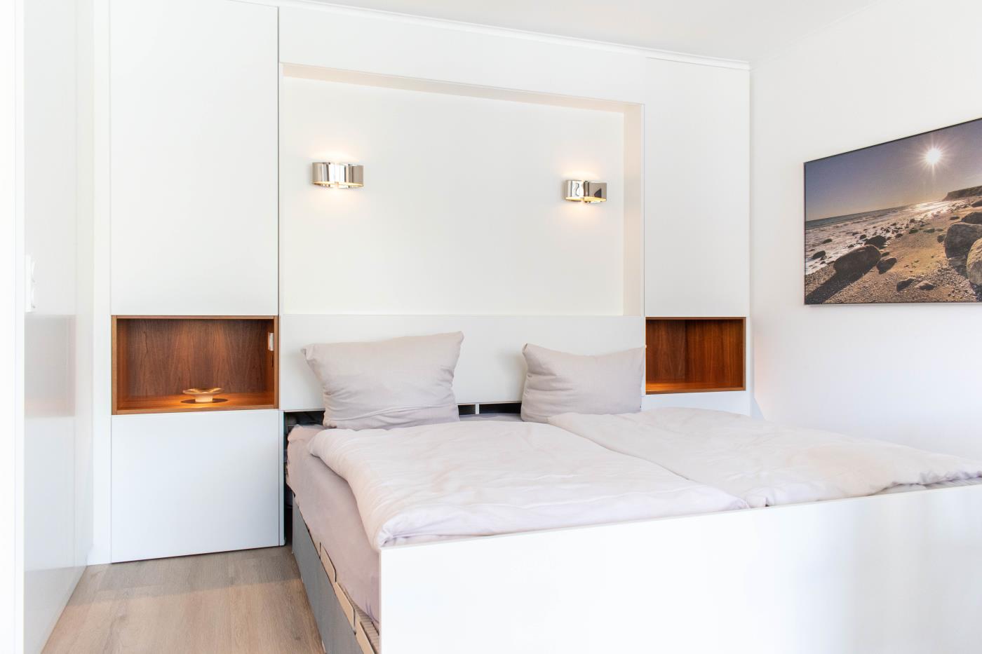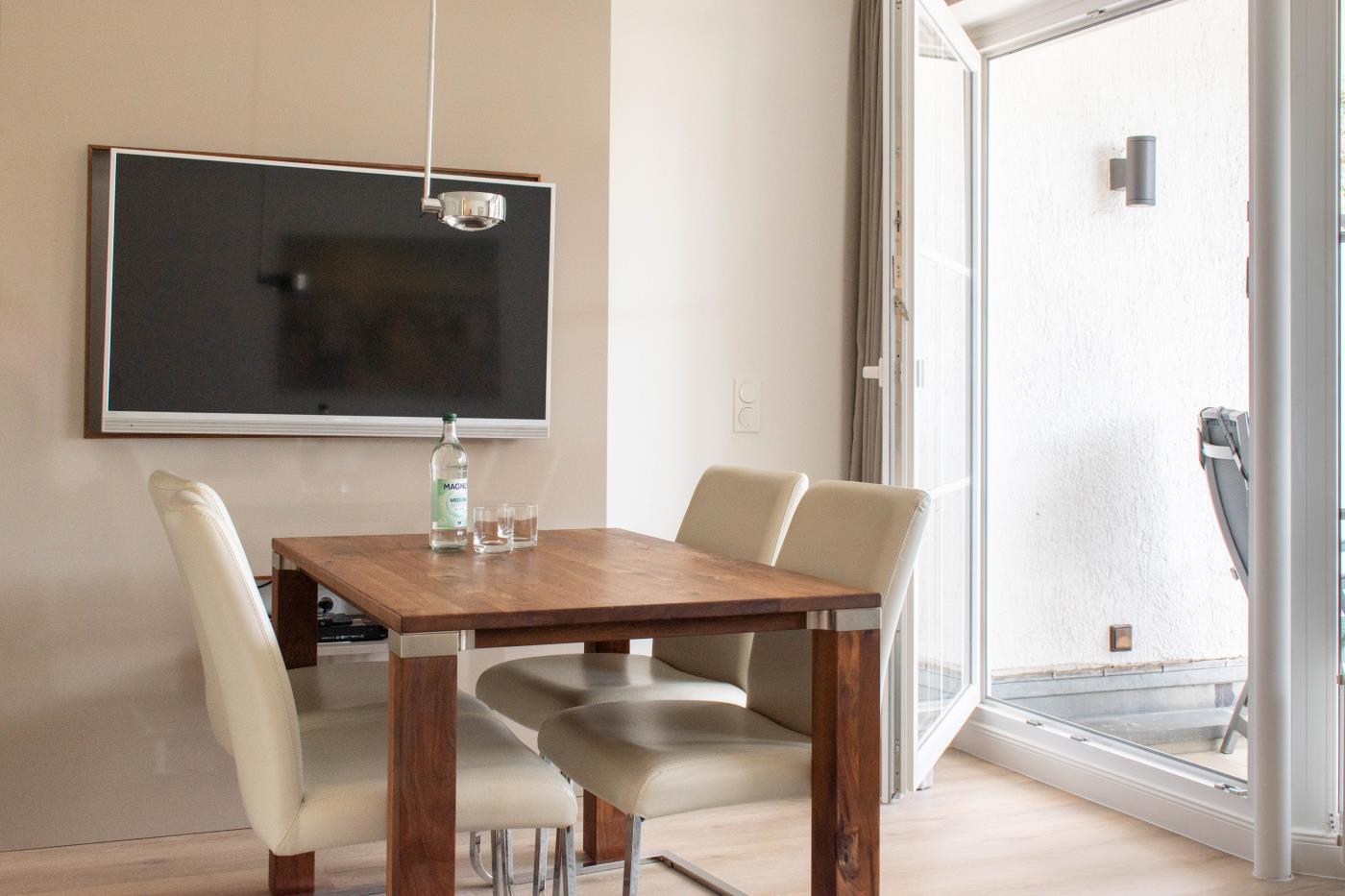 Ein Zimmer mit Doppelbett der neuesten Generation (elektrisch), Balkon und Küche bietet Platz für zwei Gäste. Bodentiefe Fenster sorgen den ganzen Tag für eine helle und freundliche Atmosphäre. Von hier aus gelangt man auch auf den Balkon mit Gartenmöbeln. Ein bequemes Doppelbett (1,80 x 2,00 m) sorgt für einen angenehmen Schlafkomfort. Die Küche ist voll ausgestattet und lässt keine Wünsche offen. Das hochwertig ausgestattete Badezimmer rundet die moderne Wohnung ab. Waschmaschine und Trockner können gegen Gebühr im Haus mitgenutzt werden.